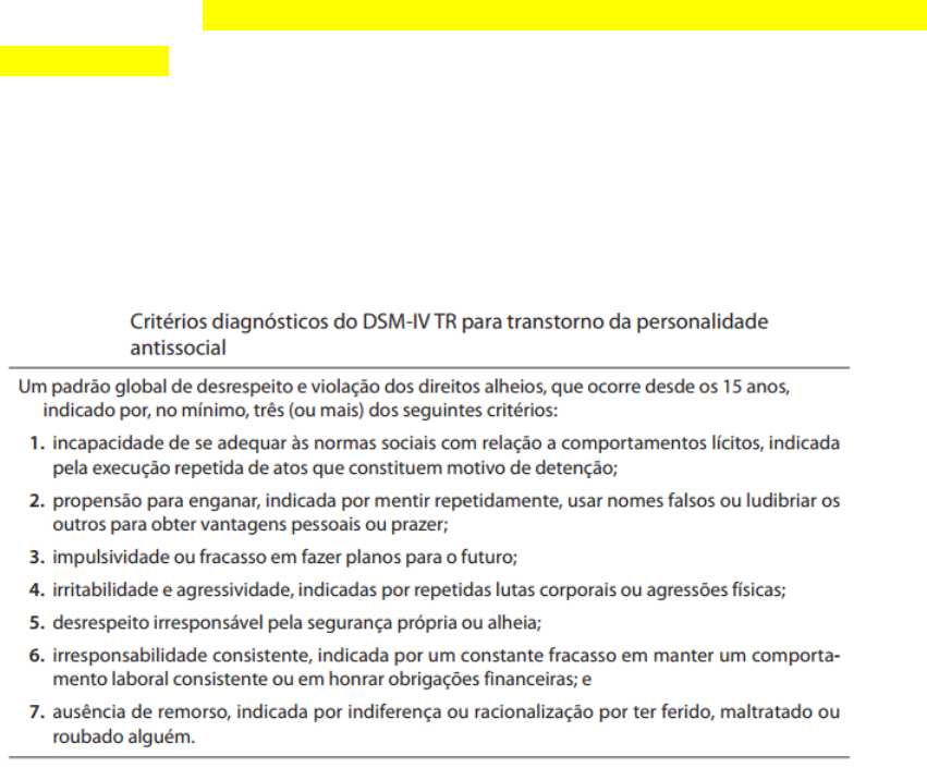 As Psicopatologias e a criminalidade Perfil Psicossocial O que você pensa quando ouve a palavra psicopatia? Vem à sua mente um louco lunático, perambulando pelo campo, cometendo atos indizíveis e espumando pela boca? Infelizmente, existem imagens que vêm à mente para muitas pessoas quando elas pensam em um psicopata ou na palavra psicopatia. No entanto, a psicopatia abrange muito mais do que as imagens sensacionalistas. Os psicopatas não são apenas aqueles que cometem os atos criminosos mais hediondos que podemos pensar e acabam na prisão. Eles podem morar naquela casa no final da rua. Eles podem trabalhar na mesa ao lado da sua ou até mesmo atuam como o político em quem você votou. Os psicopatas podem na verdade interagir em todos os aspectos da nossa sociedade. Psicopatia é uma forma específica de transtorno da personalidade antissocial que é prevalente em indivíduos que cometem uma variedade de atos criminais e geralmente se comportam de forma irresponsável. Contudo, a psicopatia não deve simplesmente ser igualada ao comportamento criminal. Apesar do consenso geral de que está relacionada ao comportamento antissocial, tem havido muito debate sobre os critérios e as fronteiras da psicopatia. Parte do debate fica aparente na discordância sobre qual o termo que captura melhor a ideia que estamos tentando entender. O melhor termo é transtorno da personalidade antissocial, sociopatia ou psicopatia? Parte do debate ocorre quando tentamos identificar e entender a verdadeira natureza da psicopatia. Existe uma consistência crescente referente aos traços principais da psicopatia, apesar do contínuo debate sobre a origem e o curso do transtorno. Hervey Cleckley (1941) foi um dos primeiros estudiosos a apresentar uma concepção definitiva e abrangente da psicopatia em seu livro Mask of sanity [A máscara da sanidade]. Cleckley (1941) identificou 16 características diferentes que definem ou compõem o perfil clínico do psicopata. As características incluem: (1) charme superficial e boa inteligência, (2) ausência de delírios e outros sinais de pensamento irracional, (3) ausência de nervosismo, (4) não confiável, (5) falsidade e falta de sinceridade, (6) ausência de remorso ou vergonha, (7) comportamento antissocial inadequadamente motivado, (8) julgamento deficitário e falha em aprender com a experiência, (9) egocentrismo patológico e incapacidade de amar, (10) deficiência geral nas reações afetivas principais, (11) perda específica de insight (compreensão das coisas, clareza), (12) falta de resposta nas relações interpessoais gerais, (13) comportamento desagradável com bebida e, às vezes, sem, (14) suicídio raramente concretizado, (15) vida sexual e interpessoal trivial (vulgar) e deficitariamente integrada e (16) fracasso em seguir um plano de vida. O inventário da psicopatia Robert Hare (ver a Figura 4.1) é frequentemente creditado como o responsável pela explosão das pesquisas durante as últimas décadas devido à sua criação da medida da psicopatia mais amplamente utilizada, o Psychopathy Checklist (PCL) e o atual Psychopathy Checklist-Revised (PCL-R). Um problema fundamental no estudo da psicopatia até a década de 1980 era a falta de um método padrão para avaliar a psicopatia, o que tornava difícil, se não impossível, comparar os resultados entre os estudos. O PCL e o PCL-R trouxeram para o campo uma descrição e método em comum para avaliar a psicopatia. Mesmo o PCL-R não sendo a única medida da psicopatia, ele se tornou o padrão. Embora o uso de uma única medida para definir um constructo não esteja livre de problemas, o PCL-R é frequentemente a medida padrão para avaliar a psicopatia. O PCL-R é composto de 20 itens que podem ser divididos em dois grupos ou fatores derivados estatisticamente. A palavra inventário é um tanto incorreta no nome do PCL-R porque ele não é simplesmente uma lista de itens que os psicólogos forenses marcam se estão presentes ou ausentes. O PCL-R é, na verdade, uma lista de 20 sintomas, e requer o julgamento clínico de um especialista para pontuá-lo. Cada termo é avaliado em uma escala de 3 pontos variando de 0 a 2. Um score de 0 indica a ausência de um sintoma, 1 indica a possível presença de um item e 2 é pontuado se o sintoma for definitivamente exibido pelo examinando. O PCL-R é normalmente pontuado por meio do exame de informações colaterais e de uma entrevista semiestruturada. Embora o PCL-R só possa ser pontuado com base em um exame de informações colaterais para fins de pesquisa, é recomendada uma entrevista clínica, especialmente para fins clínicos e legais. Como o PCL-R é pontuado de 0 a 2 nos 20 itens, os scores variam de 0 a 40 na medida. Um score acima de 30 é considerado um ponto de corte conservador para psicopatia, embora alguns estudos tenham apontado que scores de 25 já são apropriados. O PCL-R e a psicopatia em geral foram usados como uma variável de categorias, se você não é um psicopata (um score abaixo de 30) ou se você é um psicopata (score acima de 30). Ele também foi usado como uma variável contínua, de modo que quanto mais alto o score, mais psicopatia ele apresenta. Essa distinção caracterizou um debate na psicologia forense quanto a se a psicopatia é mais bem entendida como um constructo de categorias ou se ela deve ser pensada como um score contínuo. A maioria dos itens no PCL-R está agrupada em duas categorias ou fatores que foram estatisticamente identificados como relacionados à psicopatia, mas separados um do outro. Esses dois fatores servem como uma distinção importante para a nossa compreensão atual da psicopatia. O Fator 1 consiste de 8 itens como lábia e charme superficial, autoestima grandiosa, mentira patológica, dentre outros. O Fator 1 é frequentemente rotulado como o fator interpessoal/afetivo porque é composto de itens que, em grande parte, se relacionam ao comportamento interpessoal e à expressão emoc