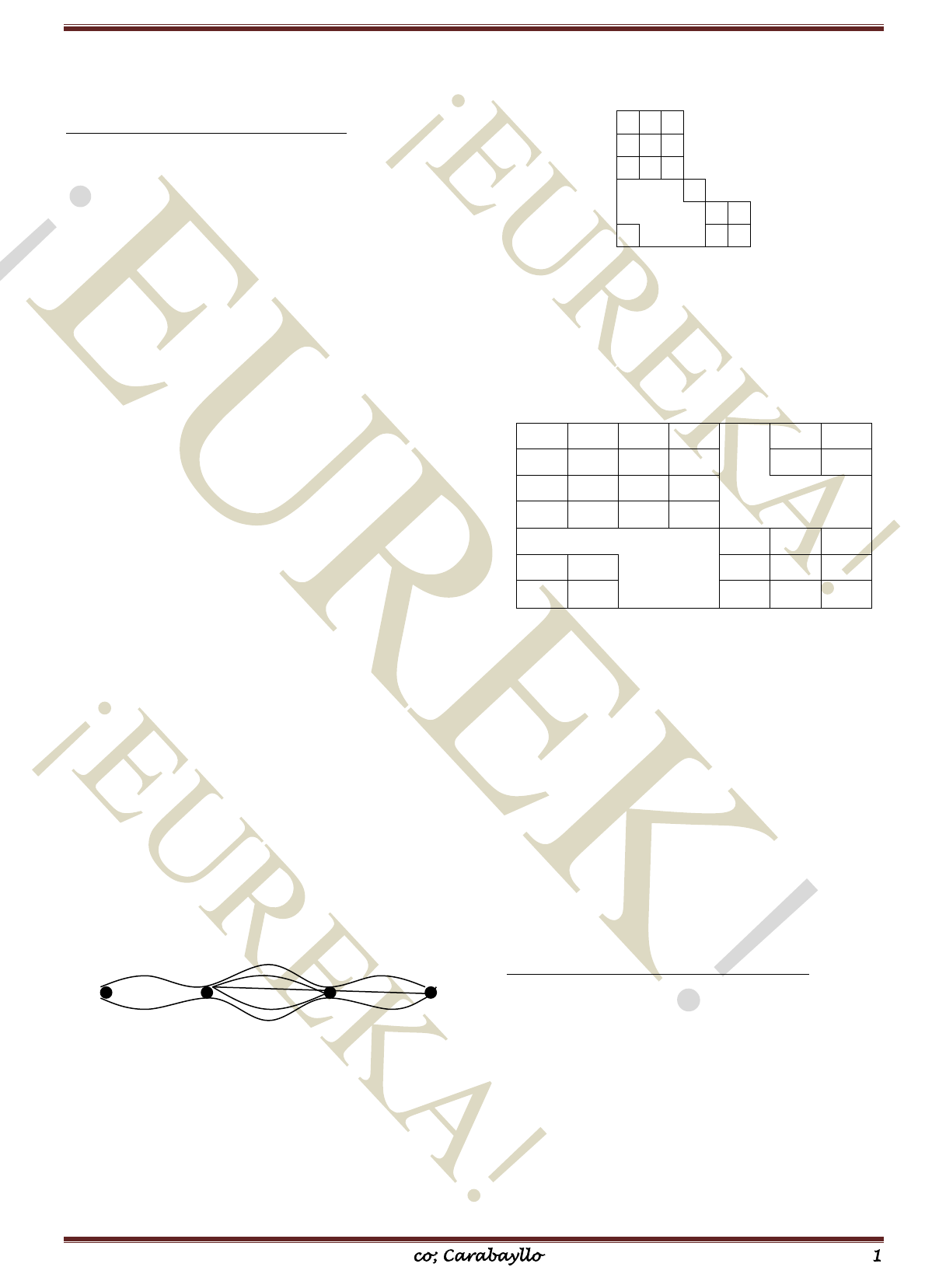 EUREKA!, preparando para la UNI …simplemente el mejor Magdalena; Los Olivos; Ingeniería; Surco; Carabayllo Página 1 ARITMÉTICA SEMANA 10: ANÁLISIS COMBINATORIO. PRINCIPIOS BÁSICOS DEL CONTEO 01. Guissel, se encuentra en el terminal de Fiori y desea viajar a Chiclayo, tiene a su disposición 5 unidades de la empresa Soyuz, 4 unidades de la empresa Flores y 3 unidades de la empresa Chaperito. ¿De cuántas maneras diferentes puede viajar a Chiclayo? A) 12 B) 60 C) 47 D) 30 E) 3 02. Mechita desea comprar un producto y éste se vende en 3 mercados, en el primer mercado se tienen disponibles 5 tiendas, en el segundo 3 y en el tercero 4 tiendas. ¿De cuantas maneras Mechita puede comprar dicho producto? A) 12 B) 15 C) 20 D) 40 E) 60 03. Si Lizbeth tiene 6 faldas; 4 blusas; 7 pantalones y 5 polos diferentes. ¿De cuantas maneras distintas podrá vestirse? A) 50 B) 62 C) 65 D) 72 E) 117 04. Un viajero decide ir de San José a San Juan, y para ello necesariamente debe hacer trasbordo en San Jacinto. Si para ir de San José a San Jacinto hay 8 líneas de transporte diferentes y para ir de San Jacinto a San Juan hay 6 líneas de combis diferentes. De cuantas maneras puede ir este viajero de San José a San Juan y regresar en líneas diferentes. A) 48 B) 140 C) 1680 D) 3780 E) 2304 05. Para ir de la ciudad A a la ciudad D hay que pasar por las ciudades B y C a través de las carreteras que se indican en la figura Calcular: (i) De cuántas maneras se puede ir de A a D. (ii) De cuántas maneras puede ir de A a D y regresar por una ruta distinta. (iii) De cuántas maneras pude ir de A a D y regresar por caminos diferentes. Dar como respuesta la suma de cada resultado. A) 870 B) 1240 C) 1140 D) 950 D) 1120 06. ¿De cuántas maneras distintas se puede ir de E hacia D, sin ir hacia arriba ni a la izquierda? E D A) 240 B) 120 C) 242 D) 256 E) 550 07. ¿De cuantas maneras diferentes se podrá ir desde el extremo superior izquierdo hasta el extremo inferior derecho sin retroceder nunca? A) 1400 B) 1421 C) 1407 D) 1420 E) 1412 08. Un medicamento para aliviar la tos es elaborado por 6 diferentes laboratorios, 2 de los cuales tienen las presentaciones de capsula, jarabe y gotas; mientras que los otros 4 solo tienen las presentaciones de capsula y jarabe; además, dicho medicamento tiene dos tipos de concentración. ¿De cuántas maneras un médico puede recetar la medicina a un paciente que tiene tos? A) 96 B) 48 C) 14 D) 28 E) 36 VARIACIÓN Y PERMUTACIÓN LINEAL 09. Cinco alumnos llegan tarde y el profesor Alex3ito decide que solo ingresen 3 para acomodarlos en 3 carpetas individuales en fila. ¿De cuántas maneras diferentes puede ordenar a los alumnos? A) 6 B) 125 C) 120 D) 60 E) 30 10. Se desea otorgar beca a los 4 primeros puestos de un concurso en el que se presentan 12 participantes ¿Cuántas opciones distintas se tiene para ocupar los 4 primeros puestos si no hay empate? A B C D EUREKA!, preparando para la UNI …simplemente el mejor Magdalena; Los Olivos; Ingeniería; Surco; Carabayllo Página 2 A) 11 320 B) 13 200 C) 11 200 D) 11 880 E) 12 400 11. El IMCA (IMCA: instituto de matemática y ciencias afines), es una institución creada por la UNI, colabora también la PUCP y ahora último la UP. Cuenta con 16 matemáticos que integran el cuerpo científico de dicha institución. El órgano máximo del IMCA es su consejo científico internacional conformada por seis miembros. Si se desea formar dicho consejo, de los 16 inte-grantes del mencionado cuerpo científico, ¿De cuantas maneras se puede realizar, sabiendo que cada miembro realizará funciones diferentes como el de presidente, vicepresidente, etc? A) 5 765 760 B) 5 769 742 C) 5 690 420 D) 5 659 650 E) 5 572 460 12. En una carrera de maratón intervienen 5 españoles, 4 italianos, 3 ingleses y 2 franceses. Supuesto que terminan la carrera todos los corredores, cuántos podios distintos pueden darse al acabar la carrera en los cuales no hay franceses. A) 1 348 B) 1 320 C) 1 570 D) 1 675 E) 4 200 13. Se tienen libros de Aritmética, Algebra y Física: la primera obra consta de tres tomos, la segunda de dos tomos y la tercera de cuatro tomos. Se quiere colocarlas en una misma fila de un estante, de tal manera que los libros de la misma obra se coloquen juntos. ¿De cuantas formas pueden ubicarse? A) 1 142 B) 1 728 C) 1 788 D) 1 864 E) 2 432 14. ¿De cuántas formas se pueden disponer en una fila las letras: a, b, c, m1, m2, m3 y m4 de modo que ningún par de “m” queden juntas? A) 144 B) 130 C) 240 D) 396 E) 512 15. ¿De cuántas maneras diferentes pueden distribuirse 8 personas en un automóvil de 5 asientos, si solo 4 de ellos saben manejar? Además 3 personas no irán en dicho automóvil A) 2520 B) 5040 C) 4040 D) 3360 E) 5400 16. Un ingresante a la carrera de INGENIERÍA GEOLÓGICA, en el último examen de admisión de la UNI, se prepara para iniciar una nueva etapa en su vida y empezar su primer ciclo de estudios. Si ya compró 8 libros: 2 de matemática I, 1 de dibujo técnico, 1 de matemática básica I, 1 de metodología del estudio, 2 de física I y 1 de química I, ¿de cuantas maneras diferentes puede ordenarlos en un estante si los libros de matemática I deben ir a los extremos y los libros de física I siempre van juntos? A) 360 B) 624 C) 288 D) 480 E) 420 PERMUTACIÓN LINEAL CON ELEMENTOS REPETIDOS 17. ¿De cuantas maneras se pueden ordenar las letras de la palabra EUREKA? A) 300 B) 380 C) 450 D) 250 E) 360 18. ¿Cuántos mensajes diferentes se pueden obtener permutando con tres asteriscos, tres puntos y cuatro líneas verticales? A) 2100 B) 4800 C) 10400 D) 4200 E) 720 19. Un grupo de 7 amigos va al cine y encuentra una fila de 7 asientos vacíos. ¿De cuantas formas diferentes se podrán ubicar, según el género, si hay 4 varones y 3 mujeres? A) 35 B) 105 C) 350 D) 5040 E) 150 20. Calcular el número de permutaciones dife- rentes que se pueden obtener con las letras de la palabra MAZAMORRA tales que las vocales estén siem