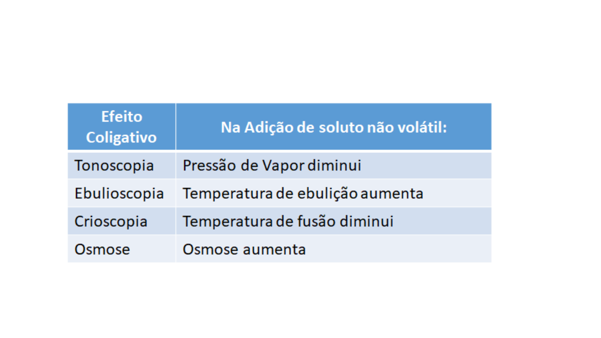 As propriedades coligativas das soluções são quatro. Hoje vamos analisar duas – Tonometria e Ebulioscopia. PROPRIEDADES COLIGATIVAS DAS SOLUÇÕES - As propriedades coligativas são as propriedades do solvente que se modificam na presença de um soluto não volátil e que dependem apenas do número de partículas do soluto. As propriedades coligativas são aquelas que percebemos quando é adicionado um soluto não volátil a um solvente. TONOSCOPIA ou TONOMETRIA – Trata-se de uma propriedade coligativa que estuda a diminuição da pressão máxima de vapor de um solvente, quando a este solvente é adicionado um soluto não volátil. Soluto não volátil - Trata-se de um material que apresenta elevado ponto de ebulição, ou seja, não pode transformar-se em gás em temperaturas ambientes, por exemplo. Dessa forma, ao ser adicionado a um solvente, não ocorrerá perda desse material para o ambiente na forma de gás. A pressão máxima de vapor da solução é sempre menor que a pressão máxima de vapor do solvente puro, pois na solução as partículas do soluto “atrapalham” as moléculas do solvente passarem para o estado gasoso. A uma mesma temperatura,quanto maior a concentração da solução, menor será a sua pressão de vapor. EBULIOMETRIA OU EBULIOSCOPIA - Ebuliometria é o estudo do aumento da temperatura de ebulição de um solvente quando nele se dissolve uma substância não-volátil. Para que um líquido entre em ebulição é necessário aquecê-lo até que a pressão de vapor fique igual à pressão atmosférica, até aí tudo bem, mas quando existem partículas insolúveis em meio ao solvente o processo é dificultado, a Ebulioscopia surge então para explicar este fenômeno. Como houve uma diminuição na pressão máxima de vapor, a solução agora terá que atingir uma temperatura maior para alcançar o valor da pressão atmosférica. E quanto maior a concentração da solução, maior será a sua temperatura de ebulição. Observem que a solução 1 possui menor concentração que a solução 2, portanto possui menor temperatura de ebulição. A solução de menor concentração, possui um número menor de partículas do soluto dispersas, então a ebulição se torna mais fácil. EXERCÍCIOS. 1-(UFSC) Observe a figura abaixo e selecione as opções corretas: 01. A dissolução do soluto, no líquido puro, diminui a pressão de vapor do líquido. 02. A pressão de vapor do líquido em solução é maior que a do líquido puro. 04. A pressão de vapor do líquido não varia após a dissolução do soluto. 08. Na mesma temperatura, a pressão de vapor do líquido puro é maior que a do líquido em solução. 16. O abaixamento da pressão de vapor do líquido na solução é diretamente proporcional à sua fração em quantidade de matéria. Ver Re 2-(Vunesp-SP) No gráfico a seguir as curvas I, II, III e IV correspondem à variação de pressão de vapor em função da temperatura de dois líquidos puros e das respectivas soluções de mesma concentração de um mesmo sal nesses dois líquidos. O ponto de ebulição de um dos líquidos é 90 °C. Utilizando os números das curvas respectivas: A) Indicar quais curvas correspondem aos líquidos puros. Indicar entre os dois qual é o líquido mais volátil e justificar. B) Indicar quais curvas correspondem às soluções. Justificar. 3 - Digamos que você possui as seguintes amostras: I - Água pura. II - Solução aquosa de glicose a 0,2 mol/L. III - Solução aquosa de glicose a 0,4 mol/L. A ordem crescente de temperatura de ebulição dessas amostras é dada por: A) I > II > III B) III > II > I C) III < II < I D) I < II < III E) I < III < II 4-Assinale V para verdadeiro ou F para falso nas afirmativas abaixo: A)( ) A pressão de vapor de um líquido diminui quando adicionamos a ele um soluto não volátil. B)( ) A temperatura de ebulição de uma solução de cloreto de sódio a 0,25 mol/L é menor do que a da água pura. C)( ) A temperatura de ebulição de uma solução de cloreto de sódio a 0,50 mol/L é igual à de uma solução de sacarose a 1,0 mol/L. D)( ) Os alimentos cozinham mais rápido em água pura, porque ela entra em ebulição a uma temperatura mais baixa do que a água de uma solução aquosa de sal. 5-(PUC-RS) Dois recipientes iguais contêm líquidos em contínua ebulição. O recipiente 1 tem água pura e o recipiente 2 tem água do mar. O gráfico que melhor representa a variação das temperaturas dos líquidos em função do tempo é: