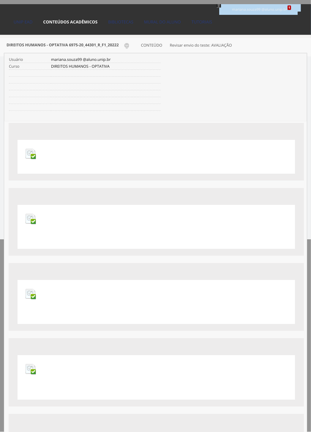 UNIP EAD BIBLIOTECAS MURAL DO ALUNO TUTORIAIS mariana.souza99 @aluno.unip.br 1 CONTEÚDOS ACADÊMICOS Revisar envio do teste: AVALIAÇÃODIREITOS HUMANOS - OPTATIVA 6975-20_44301_R_F1_20222 CONTEÚDO Usuário mariana.souza99 @aluno.unip.br Curso DIREITOS HUMANOS - OPTATIVA Teste AVALIAÇÃO Iniciado 30/11/22 20:38 Enviado 30/11/22 20:43 Status Completada Resultado da tentativa 10 em 10 pontos Tempo decorrido 5 minutos Resultados exibidos Respostas enviadas, Perguntas respondidas incorretamente Pergunta 1 Resposta Selecionada: d. O rol de direitos previstos na Constituição Federal brasileira, especi"camente no artigo 5º, é considerado pelos estudiosos como: Um rol exempli"cativo porque outros direitos poderão vir a ser incluídos com o passar dos tempos. Pergunta 2 Resposta Selecionada: c. Sobre a moradia, no Brasil, é possível a"rmar que: É um direito de todos os brasileiros e estrangeiros residentes regularmente no país, conforme previsto expressamente no artigo 6º da Constituição Federal. Pergunta 3 Resposta Selecionada: d. Para compreender o sentido da expressão “dignidade da pessoa humana” , é preciso pensar: No conjunto de direitos que cada ser humano precisa usufruir para poder ter uma vida digna, direitos que podem estar positivados em um determinado país ou em tratados internacionais. Pergunta 4 Resposta Selecionada: b. O governo de um determinado país determina que saúde e educação são direitos humanos que serão protegidos, mas que não haverá liberdade de expressão e nem de circulação para os cidadãos. A ONU se insurge contra essa determinação e alega que essa decisão agride uma das características essenciais dos direitos humanos que é a: Indivisibilidade. Pergunta 5 1 em 1 pontos 1 em 1 pontos 1 em 1 pontos 1 em 1 pontos 1 em 1 pontos 30/11/2022 20:44 Página 1 de 3 Resposta Selecionada: b. Um cidadão brasileiro possui um terreno no centro de uma cidade e, há vários anos, o imóvel está desocupado. Com o passar do tempo o local acumulou muito lixo e, recentemente, alguns usuários de drogas passaram a se reunir ali para comercializar e usar drogas. O proprietário já foi noti"cado pela prefeitura várias vezes para providenciar a limpeza do terreno e o fechamento com portões, mas nunca respondeu. Recentemente o imóvel foi desapropriado pela prefeitura sob alegação de que: O imóvel não estava atendendo à função social. Pergunta 6 Resposta Selecionada: a. É comum que algumas pessoas na sociedade brasileira confundam Direitos Humanos com “direitos de bandidos ”. Essa confusão tem origem no fato de que: Algumas pessoas desconhecem que os acusados e condenados também possuem direitos. Pergunta 7 Resposta Selecionada: a. Durante a primeira dimensão ou geração de Direitos Humanos foram reconhecidos, entre outros, o direito de: Propriedade. Pergunta 8 Resposta Selecionada: b. Em um determinado país o governo havia positivado em lei o direito de acesso à linhas de crédito para moradia popular. Alguns anos depois, o mesmo governo resolveu extinguir essas linhas de crédito sob alegação de que não existiam mais recursos para isso. Os cidadãos se organizaram para exigir o retorno do direito às linhas de crédito para moradia popular, sob alegação de que havia sido ferida uma característica essencial dos direitos humanos que é a: Vedação de retrocesso. Pergunta 9 Resposta Selecionada: b. Para alguns estudiosos de Direitos Humanos, a teoria que fundamenta esses direitos é aquela que entende que são direitos humanos aqueles que forem escolhidos pelo povo e por seus governantes, para serem parte do corpo de leis de uma determinada sociedade. Para outros estudiosos do mesmo tema, o que fundamenta a existência de direitos humanos é que esses direitos existem por si só, são universais e imutáveis e se referem à própria condição da vida humana e à sua dignidade. Essas teorias são conhecidas, respectivamente, por: Teoria Positivista e Teoria Jusnaturalista Pergunta 10 Resposta Selecionada: e. No Brasil, o direito à saúde é garantido: A todas as pessoas sem nenhuma contrapartida. ← OK 1 em 1 pontos 1 em 1 pontos 1 em 1 pontos 1 em 1 pontos 1 em 1 pontos 30/11/2022 20:44 Página 2 de 3 Quarta-feira, 30 de Novembro de 2022 20h44min15s GMT-03:00 ← OK 30/11/2022 20:44 Página 3 de 3