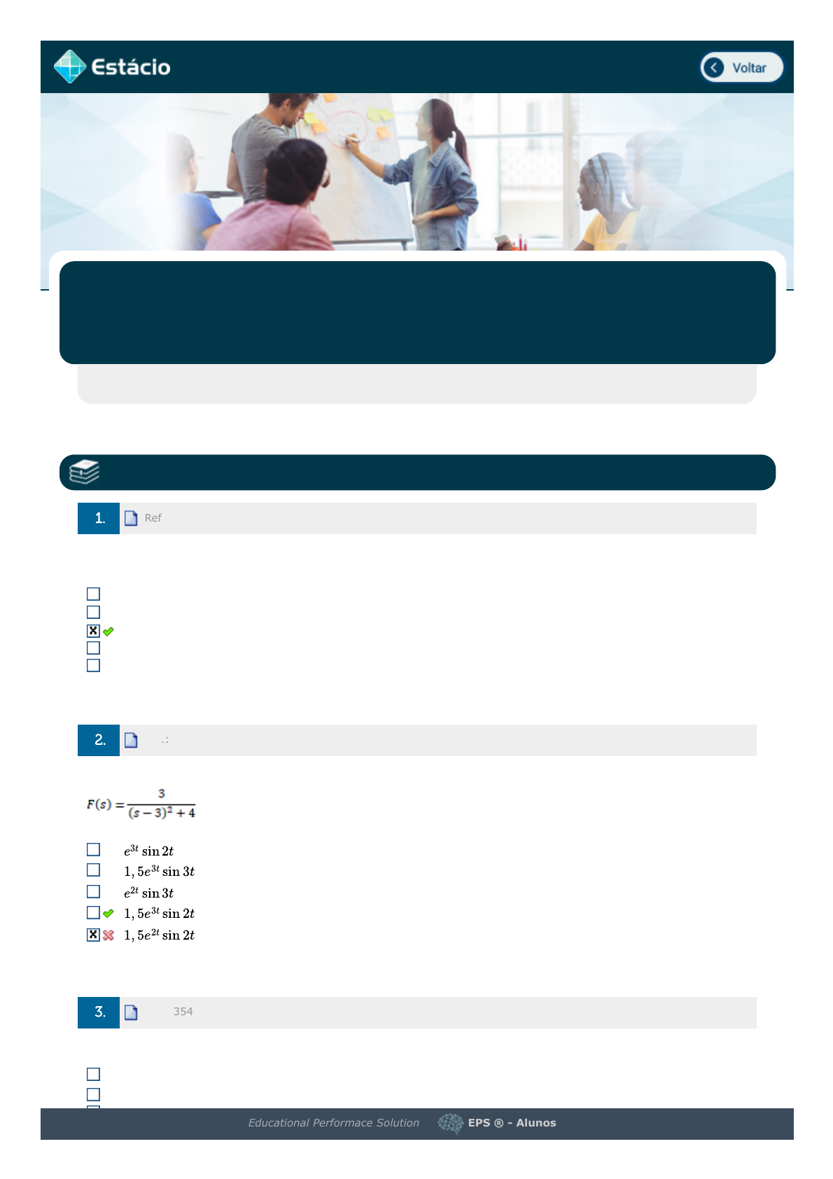 30/11/2022 18:50 EPS https://simulado.estacio.br/alunos/ 1/4 JORGE FRANCISCO DA CRUZ PAIXÃO 202007014367 Disciplina: CONTROLE E SERVOMECANISMO I AV Aluno: JORGE FRANCISCO DA CRUZ PAIXÃO 202007014367 Professor: LEONARDO MENEZES MELO Turma: 9001 EEX0034_AV_202007014367 (AG) 09/09/2022 19:27:46 (F) Avaliação: 9,0 Nota SIA: 10,0 pts CONTROLE E SERVOMECANISMOS I 1. Ref.: 3100344 Pontos: 1,00 / 1,00 Com base nas propriedades dos sistemas de controle, assinale a que NÃO corresponde a sistemas de controle em malha fechada quando comparados com sistemas de controle em malha aberta: Maior largura de faixa. Maior imunidade a ruídos. Menor tendência a oscilar. Mais sensível a não linearidades. Maior precisão. 2. Ref.: 3100347 Pontos: 0,00 / 1,00 Determine a transformada de Laplace inversa da função: 3. Ref.: 3546608 Pontos: 1,00 / 1,00 Ache a função de transferência do sistema representado por: dy(t)/dt +2y(t) = x(t) es 2s s2 1/(s + 2) e3t sin 2t 1, 5e3t sin 3t e2t sin 3t 1, 5e3t sin 2t 1, 5e2t sin 2t Educational Performace Solution EPS ® - Alunos javascript:voltar(); javascript:alert('C%C3%B3digo da quest%C3%A3o: 3100344.'); javascript:alert('C%C3%B3digo da quest%C3%A3o: 3100347.'); javascript:alert('C%C3%B3digo da quest%C3%A3o: 3546608.'); javascript:alert('Educational Performace Solution\n\nEPS: M%C3%B3dulo do Aluno\n\nAxiom Consultoria em Tecnologia da Informa%C3%A7%C3%A3o Ltda.') 30/11/2022 18:50 EPS https://simulado.estacio.br/alunos/ 2/4 1/s 4. Ref.: 3100357 Pontos: 1,00 / 1,00 Para a função de transferência abaixo, determine a constante de tempo, o tempo de subida e o tempo de acomodação. 0,5s; 2,0s e 1,1s 1,1s; 0,5s e 2,0s 1s; 2,0s e 1,1s 0,5s; 0,5s e 1,1s 0,5s; 1,1s e 2,0s 5. Ref.: 3100364 Pontos: 1,00 / 1,00 Assinale a alternativa que descreve corretamente o estado do sistema descrito pela função de transferência abaixo: O sistema é estável com polos complexos. Não é possível determinar. O sistema é marginalmente estável. O sistema é estável com polos reais. O sistema é instável. 6. Ref.: 3100371 Pontos: 1,00 / 1,00 Determine para qual faixa de valores de K o sistema cuja função de transferência em malha fechada dada abaixo é estável: K > 2 Não existe valor de K que torna o sistema estável. K > -1 K > 0 K > 1 7. Ref.: 3100378 Pontos: 1,00 / 1,00 Encontre o erro estacionário para a entrada em degrau unitário. Educational Performace Solution EPS ® - Alunos javascript:alert('C%C3%B3digo da quest%C3%A3o: 3100357.'); javascript:alert('C%C3%B3digo da quest%C3%A3o: 3100364.'); javascript:alert('C%C3%B3digo da quest%C3%A3o: 3100371.'); javascript:alert('C%C3%B3digo da quest%C3%A3o: 3100378.'); javascript:alert('Educational Performace Solution\n\nEPS: M%C3%B3dulo do Aluno\n\nAxiom Consultoria em Tecnologia da Informa%C3%A7%C3%A3o Ltda.') 30/11/2022 18:50 EPS https://simulado.estacio.br/alunos/ 3/4 2 1 -1 -2 0 8. Ref.: 3100384 Pontos: 1,00 / 1,00 Para o sistema com realimentação unitária dado pelo diagrama em blocos abaixo: Determine os ângulos das assíntotas com o eixo real do LGR do sistema. +90° e +180° 0° e 180° +60° e -60° +45° e -45° +90° e -90° 9. Ref.: 3100391 Pontos: 1,00 / 1,00 Educational Performace Solution EPS ® - Alunos javascript:alert('C%C3%B3digo da quest%C3%A3o: 3100384.'); javascript:alert('C%C3%B3digo da quest%C3%A3o: 3100391.'); javascript:alert('Educational Performace Solution\n\nEPS: M%C3%B3dulo do Aluno\n\nAxiom Consultoria em Tecnologia da Informa%C3%A7%C3%A3o Ltda.') 30/11/2022 18:50 EPS https://simulado.estacio.br/alunos/ 4/4 10. Ref.: 3100396 Pontos: 1,00 / 1,00 Considere o sistema de controle em malha fechada ilustrado na figura acima, onde K > 0 representa o ganho a ser ajustado no compensador. Determine a faixa de valores de K que torna o sistema é estável. Não existe valor de K que torna o sistema estável. 180√10 150√10 160√10 190√10 170√10 K > 40 K > 50 K > 20 K > 30 Educational Performace Solution EPS ® - Alunos javascript:alert('C%C3%B3digo da quest%C3%A3o: 3100396.'); javascript:alert('Educational Performace Solution\n\nEPS: M%C3%B3dulo do Aluno\n\nAxiom Consultoria em Tecnologia da Informa%C3%A7%C3%A3o Ltda.')