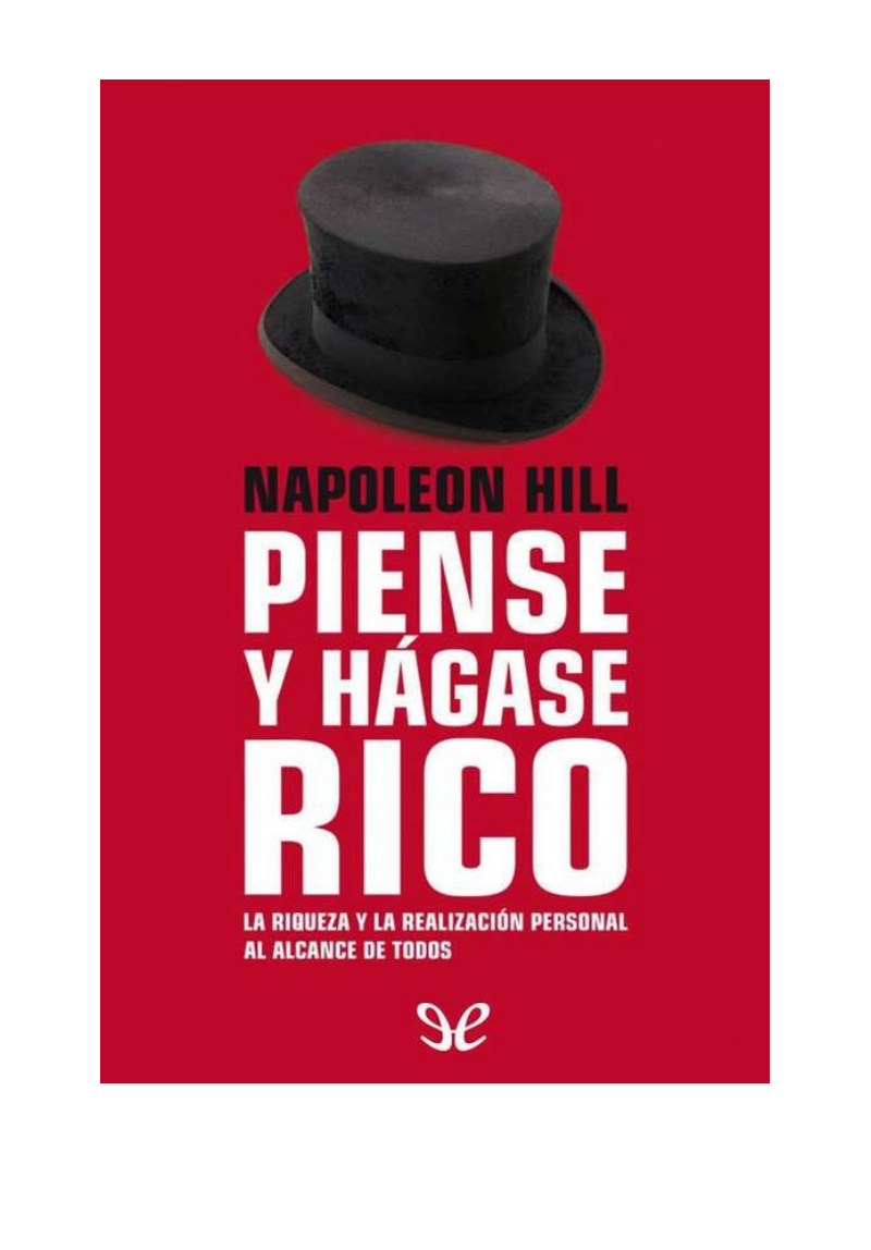 Un clásico para alcanzar la riqueza. Tras más de veinte años investigando científicamente a los hombres más ricos de su época, Napoleon Hill aprendió el secreto de la riqueza del famoso industrial y escritor Andrew Carnegie. Carnegie no sólo llegó a ser multimillonario sino que hizo millonarios a una multitud de personas a las que enseñó su sabiduría. Piense y hágase rico es una obra diseñada a partir de una experiencia para conseguir el triunfo económico y personal de la humanidad entera. Gracias a este libro, la riqueza y la realización personal están al alcance de todas aquellas personas que lo deseen. No dejes el éxito en manos de unos pocos y lucha por tu trozo de pastel. Napoleon Hill Piense y hágase rico La riqueza y la realización personal al alcance de todos ePub r1.1 Titivillus 13.07.16 Título original: Think and Grow Rich Napoleon Hill, 1937 Traducción: José Manuel Pomares Editor digital: Titivillus ePub base r1.2 Portadilla PREFACIO DEL EDITOR NORTEAMERICANO En el terreno de la realización personal, la independencia financiera y la riqueza del espíritu, más allá de lo que se puede medir en dinero, Piense y hágase rico es uno de los libros más válidos de todos los tiempos. Nunca hubo otro libro como éste, ni nunca podrá haberlo. Fue inspirado por Andrew Carnegie, que reveló su fórmula de realización personal al autor, Napoleon Hill, hace muchos años. Carnegie no sólo llegó a ser multimillonario sino que hizo millonarios a una multitud de hombres a los que enseñó su secreto. Otros 500 hombres ricos revelaron el origen de su riqueza a Napoleon Hill, que ha pasado toda una vida de investigación difundiendo su mensaje a las personas de todas las clases sociales que están dispuestas a aportar sus ideas, sus ilusiones y sus planes organizados a cambio de la riqueza. Centenares de personas han aplicado los famosos principios de este libro en aras de su propio enriquecimiento. Sus secretos son tan intemporales y prácticos como lo eran en la primera edición de Piense y hágase rico . En esta última edición, los principios y las fórmulas que conducen al éxito se han hecho asequibles a todos aquellos que desean fervientemente hacer dinero y alcanzar las ricas satisfacciones espirituales que la realización personal proporciona. Piense y hágase rico es un libro eminentemente práctico, que indica «qué hacer y cómo». En él, usted encontrará la magia de la autodirección, de la planificación organizada, la autosugestión, las asociaciones inteligentes, un sistema sorprendentemente revelador de autoanálisis, planes detallados para vender sus servicios personales y la riqueza de otras ayudas específicas, provenientes de la experiencia de grandes hombres que han dado sobradas muestras de su valor. La riqueza al alcance de su mano no siempre puede medirse en dinero. Hay grandes riquezas en las amistades duraderas, las relaciones familiares armoniosas, la simpatía y la comprensión entre los asociados, y en la armonía interna que da la paz de espíritu, todos ellos valores mensurables en un plano espiritual. Los conceptos primordiales de Piense y hágase rico lo prepararán para atraer y disfrutar de estos estados superiores que siempre han sido y serán inaccesibles a todo el que no esté preparado para ellos . Cuando empiece a poner en práctica los principios de Piense y hágase rico , esté preparado para una vida distinta, en la que no sólo las dificultades y tensiones se suavizarán, sino que estará predispuesto a la acumulación de riquezas en abundancia. EL EDITOR UNAS PALABRAS DEL AUTOR En cada capítulo de este libro, que ha hecho fortunas para centenares de hombres extraordinariamente ricos a quienes he analizado de manera exhaustiva durante muchísimos años, se habla del secreto de cómo hacer dinero. El secreto me lo señaló Andrew Carnegie, hace más de medio siglo. El viejo escocés, sagaz y encantador, me lo espetó sin miramientos cuando yo era un niño apenas. Luego se repantigó en la silla, con un destello de alegría en los ojos, y me miró detenidamente para ver si yo había comprendido todo el significado de lo que me acababa de decir. Al ver que yo había captado la idea, me preguntó si estaría dispuesto a pasarme veinte años o más preparándome para ofrecérselo al mundo, a hombres y mujeres que, sin ese secreto, podían llevar una vida de fracasos. Le respondí que sí, y con la ayuda del señor Carnegie, he mantenido mi promesa. Este libro contiene ese secreto, puesto a prueba por centenares de personas de casi todas las clases sociales. Fue idea del señor Carnegie que esta fórmula mágica, que le proporcionó una fortuna estupenda, debía ponerse al alcance de la gente que no tiene tiempo para investigar cómo ganan los hombres el dinero, y fue su deseo que yo pusiera a prueba y demostrara la eficacia de la fórmula a través de la experiencia de hombres y mujeres de todas las extracciones. Él opinaba que la fórmula debía enseñarse en todas las escuelas y universidades públicas, y expresaba la opinión de que, si fuese enseñada de forma adecuada, revolucionaría el sistema educativo hasta tal punto que el tiempo que pasamos en la escuela se vería reducido a menos de la mitad. En el capítulo sobre la fe, usted leerá la sorprendente historia de la organización de la gigantesca United States Steel Corporation, tal como fue concebida y llevada a cabo por uno de los jóvenes por medio de los que el señor Carnegie demostró que su fórmula funcionaría con todo el que estuviera preparado para ella . Esta sola aplicación del secreto, ejecutada por Charles M. Schwab, le dio una fortuna inmensa, tanto en dinero como en oportunidades. Para decirlo ásperamente, esa particular aplicación de la fórmula le valió seiscientos millones de dólares . Estos hechos, bien sabidos por la mayoría de las personas que conocieron al señor Carnegie, dan una idea bastante cabal de lo que la lectura de este li