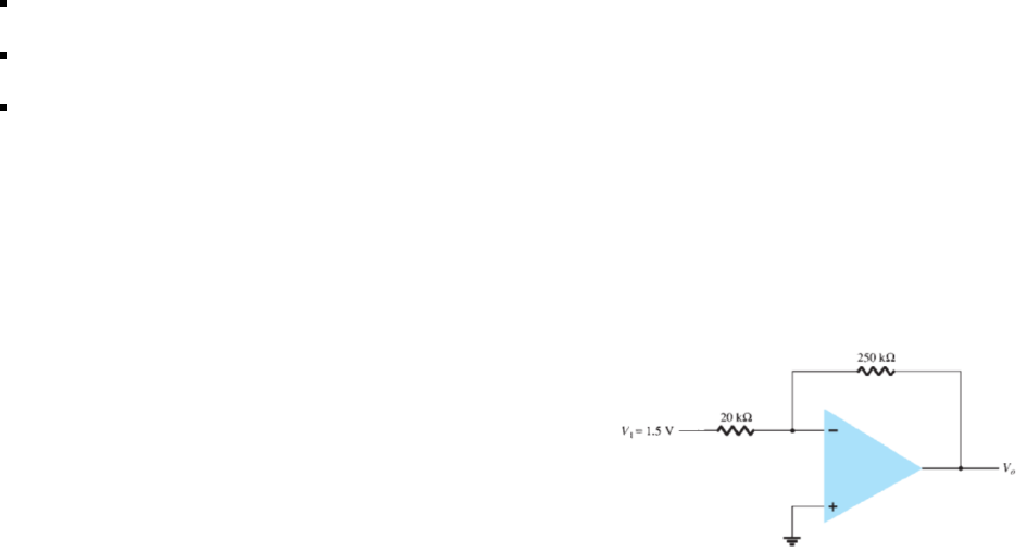 TP012: Actividad de evaluación 01 - El Amplificador Operacional Nanorobótica César Iván Rodrı́guez Rivas 221393 Ingenierı́a en nanotecnologı́a, Facultad de ingenierı́a Universidad Autónoma de Querétaro 21/03/2022 I. INTRODUCCIÓN I-A. Amplificador operacional Un amplificador operacional (también conocido como OPAMP) es un circuito integrado que permite realizar una gran variedad de circuitos electrónicos útiles. Desde un comparador de voltaje, un amplificador de señal, hacer operaciones aritméticas y filtrar señales. Los amplificadores operacionales están compuestos por una gran cantidad de transistores internamente, que permiten controlar corrientes y tensiones, para darle sus caracterı́sticas eléctricas. El amplifcador operacional tiene 2 entradas y una salida, ademas de la alimentación positiva y negativa. La configuración de las entradas mencionadas define el comportamiento del circuito. Para el amplificador operacional ideal se cumplen estas reglas: La impedancia entre las entradas inversora y no inversora es infinita, por lo que no hay corriente de entrada. La diferencia de potencial entre las terminales inversora y no inversora es, o debe ser nula. No hay corriente entrando o saliendo de las patas inversora y no inversora. En un OPAMP ideal se tiene una terminal de entrada inversora(signo menos) y una de entrada no inversora(signo más). En algunos casos se marca el sı́mbolo para denotar la ganancia infinita y que es un OPAMP ideal. El OPAMP es un circuito integrado activo o componente electrónico activo, por lo tanto, al ser un dispositivo activo es necesario un suministro de alimentación externo para su funcionamiento, por lo general es de ± 15V, es recomendable verificar en la hoja de datos del componente.Todos los voltajes están referidos a una tierra común, en otras palabras, se debe conectar todas las tierras al mismo punto o nodo (GND). Usualmente un OPAMP tiene una configuración de lazo cerrado, correspondiente al lazo de retroalimentación desde la salida a la entrada inversora (entrada negativa). La configuración de lazo abierto se da cuando no tiene un lazo de retroalimentación, no es muy utilizada está configuración ya que tiene una considerable inestabilidad debido a la alta ganancia. I-B. Problemática 1. ¿Cuál es el voltaje de salida en el circuito de la figura? 2. ¿Cuál es el intervalo de ajuste de la ganancia de voltaje en el circuito de la figura 2? 3. ¿Qué voltaje de entrada produce una salida de 2V en el circuito de la figura 3? 4. ¿Cuál es el intervalo de voltaje a la salida en el circuito de la figura 4 si la entrada puede variar de 0.1 a 0.5 V? 5. ¿Qué voltaje resulta en el circuito de la figura 5 para una entrada V1 = 0.3 V? 6. ¿Qué voltaje de entrada se debe aplicar al circuito de la figura 5 para obtener una salida de 2.4 V? 7. ¿Qué intervalo en el voltaje de salida se desarrolla en el circuito de la figura 6? 8. Calcule el voltaje de salida desarrollado por el circuito de la figura 7. 9. Calcule el voltaje de salida para el circuito de la figura 7 para Rf = 68 K. 10. ¿Qué voltaje de salida resulta en el circuito de la figura 8 para V1 = +0.5V? 11. Calcule el voltaje de salida para el circuito de la figura 9. Figuras: Figura 1. Figura para el problema 01 Figura 2. Figura para el problema 02 Figura 3. Figura para el problema 03 Figura 4. Figura para el problema 04 Figura 5. Figura para el problema 05 Figura 6. Figura para el problema 07 Figura 7. Figura para el problema 08 Figura 8. Figura para el problema 10 Figura 9. Figura para el problema 11 II. METODOLOGÍA Ejercicio 1 Análisis LCK en el nodo V − i1 = i2 ∆V = iR i1 = V1−V − R1 i2 = V −−V0 R2 V1−V − R1 = V −−V0 R2 V + = V − = 0 V1−0 R1 = 0−V0R2 V1 R1 = − V0R2 V1 R2 R1 = −V0 V0 = −V1R2R1 V0 = −1,5V [ 250kΩ20kΩ ] = −18,75V Figura 10. Figura para el problema 1, 3 y 4 Figura 11. Figura para el problema 1, 3 y 4 Ejercicio 2 Análisis LCK en el nodo V − i1 = i2 ∆V = iR i1 = V1−V − RT i2 = V −−V0 Rf V1−V − RT = V −−V0 Rf V + = V − = 0 V1−0 RT = 0−V0Rf V1 RT = − V0Rf V1 Rf RT = −V0 V0 = −V1 RfRT Vo Vi = −RfRT G = −RfRT Para RT = 10kΩ G = − 500kΩ10kΩ = −50 Para RT = 20kΩ G = − 500kΩ20kΩ = −25 Figura 12. Figura para el problema 2 Figura 13. Figura para el problema 2 Ejercicio 3 Análisis LCK en el nodo V − i1 = i2 ∆V = iR i1 = V1−V − R1 i2 = V −−V0 R2 V1−V − R1 = V −−V0 R2 V + = V − = 0 V1−0 R1 = 0−V0R2 V1 R1 = − V0R2 V1 R2 R1 = −V0 V0 = −V1R2R1 V0 = −2V [ 20kΩ1MΩ ] = −0,04V Ejercicio 4 Análisis LCK en el nodo V − i1 = i2 ∆V = iR i1 = V1−V − R1 i2 = V −−V0 R2 V1−V − R1 = V −−V0 R2 V + = V − = 0 V1−0 R1 = 0−V0R2 V1 R1 = − V0R2 V1 R2 R1 = −V0 V0 = −V1R2R1 Lı́mite inferior: V01 = −0,1V [ 200kΩ20kΩ ] = −1V Lı́mite superior: V02 = −0,5V [ 200kΩ20kΩ ] = −5V Ejercicio 5 Análisis LCK en el nodo V − i1 = i2 ∆V = iR i1 = −V − R1 i2 = V −−V0 R2 V + = V − = V1 − V1R1 = V1−V0 R2 −V1R2R1 = V1 − V0 −V1R2R1 − V1 = −V0 V0 = V1R2 R1 + V1 V0 = V1[ R2 R1 + 1] V0 = −0,3V [ 360kΩ12kΩ + 1] = −9,25 Ejercicio 6 −V1R2R1 − V1 = −V0 V0 = V1R2 R1 + V1 V0 = V1[ R2 R1 + 1] V1 = V0 R2 R1 +1 V1 = 2,4V 360kΩ 12kΩ +1 = 0,077419V Ejercicio 7 Análisis LCK en el nodo V − i1 = i2 ∆V = iR i1 = −V − RT i2 = V −−V0 Rf V + = V − = V1 − V1RT = V1−V0 Rf −V1RfRT = V1 − V0 −V1RfRT − V1 = −V0 V0 = V1Rf RT + V1 V0 = V1[ Rf RT + 1] Para 10kΩ V0 = −0,5V [ 200kΩ10kΩ + 1] = −10,5V Para 20kΩ V0 = −0,5V [ 200kΩ20kΩ + 1] = −5,5V Figura 14. Figura para el problema 7 Figura 15. Figura para el problema 7 Ejercicio 8 Análisis LCK en el nodo V + iT = if iT = i1 + i2 + i3 ∆V = iR V1−V + R1 + V2−V + R2 + V3−V + R3 = V +−V0 Rf V + = V − = 0 V1−0 R1 + V2−0R2 + V3−0 R3 = 0−V0Rf V1 R1 + V2R2 + V3 R3 = − V0Rf V0 = −Rf [ V1R1 + V2 R2 + V3R3 ] V0