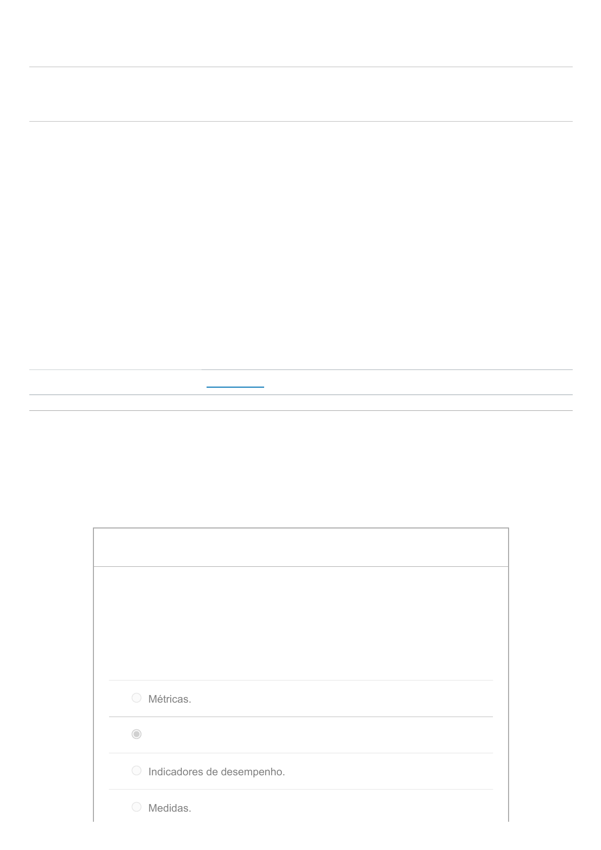 02/12/22, 13:22 Avaliação Virtual (Quiz) 8: Objetivos e Metas: Modelagem de Processos de Negócios - Engenharia de Software - Unid. Educ. … https://pucminas.instructure.com/courses/108606/quizzes/317941 1/3 Avaliação Virtual (Quiz) 8: Objetivos e Metas Entrega 20 nov em 23:59 Pontos 2 Perguntas 4 Disponível 14 nov em 7:00 - 20 nov em 23:59 Limite de tempo Nenhum Instruções Este teste foi travado 20 nov em 23:59. Histórico de tentativas Tentativa Tempo Pontuação MAIS RECENTE Tentativa 1 4 minutos 2 de 2 As respostas corretas não estão mais disponíveis. Pontuação deste teste: 2 de 2 Enviado 20 nov em 20:12 Esta tentativa levou 4 minutos. Leia com atenção os enunciados de cada questão. Os conteúdos abordados se referem à aula sobre Objetivos e Metas. Além dos slides e vídeos das aulas, recomenda-se a leitura das referências indicadas nos slides. 0,5 / 0,5 ptsPergunta 1 Para gerenciar um negócio orientado a processos, verificando se eles estão atendendo as metas estabelecidas, são necessários alguns elementos. Marque, a seguir, aquele elemento que não tem relação direta com este gerenciamento: Métricas. desempenho dos softwares da empresa. Indicadores de desempenho. Medidas. https://pucminas.instructure.com/courses/108606/quizzes/317941/history?version=1 02/12/22, 13:22 Avaliação Virtual (Quiz) 8: Objetivos e Metas: Modelagem de Processos de Negócios - Engenharia de Software - Unid. Educ. … https://pucminas.instructure.com/courses/108606/quizzes/317941 2/3 0,5 / 0,5 ptsPergunta 2 Desempenho de processos é o rendimento de um processo em termos de extrapolações de tempo, custo, capacidade e qualidade. Verdadeiro Falso 0,5 / 0,5 ptsPergunta 3 Sobre Metas, marque a opção incorreta: é algo desejado pela organização, mas deve ser possível medí-lo. é a quantificação de um objetivo. considera, exclusivamente, valores do tipo monetário necessários para alcançar a meta. define se um objetivo foi alcançado de maneira bem sucedida ou não. 0,5 / 0,5 ptsPergunta 4 Sobre Objetivos, marque a opção incorreta: formalizam uma estratégia a ser seguida para o alcance da Visão. 02/12/22, 13:22 Avaliação Virtual (Quiz) 8: Objetivos e Metas: Modelagem de Processos de Negócios - Engenharia de Software - Unid. Educ. … https://pucminas.instructure.com/courses/108606/quizzes/317941 3/3 ter objetivos não claramente definidos motiva os trabalhadores em alcançá-los. tendo objetivos do processo como referência, é possível identificar as atividades/procedimentos que não estão obtendo os resultados esperados. facilitam a implementação e os ajustes necessários a novos processos. Pontuação do teste: 2 de 2