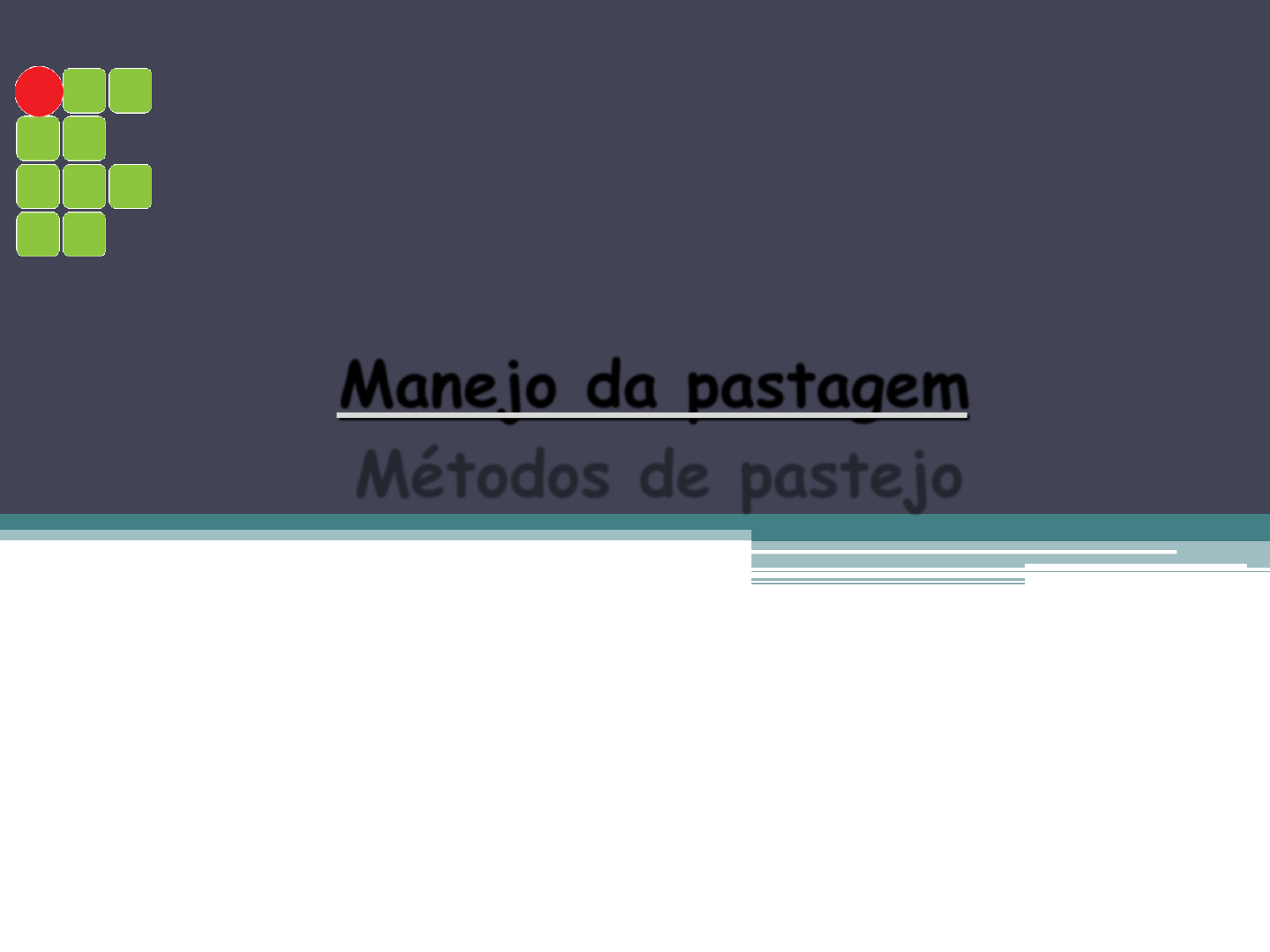 Manejo da pastagem José Antonio A. Cutrim Junior Profº Departamento de Ensino cutrimjunior@ifma.edu.br São Luis – Maranhão Métodos de pastejo Instituto Federal do Maranhão Campus São Luis-Maracanã Curso: Agronomia Disciplina: Forragicultura e Pastagem Aula 08 – Morfofisiologia de plantas forrageiras • Quantidade x qualidade da forragem • Métodos de pastejo – Sistema de pastejo • Consumo pelo animal em pastejo • Suplementação animal a pasto • Pressão de pastejo e ajuste da taxa de lotação • Ganho por animal x ganho por área • Equilíbrio entre demanda e suprimento de alimentos 1. Aspectos importantes do manejo de pastagem Métodos de pastejoAula 11 – Manejo da pastagem Aula 08 – Morfofisiologia de plantas forrageiras Sistema de Pastejo Métodos de pastejoAula 11 – Manejo da pastagem Aula 08 – Morfofisiologia de plantas forrageiras Sistema de Pastejo Métodos de pastejoAula 11 – Manejo da pastagem Aula 08 – Morfofisiologia de plantas forrageiras Sistema de Pastejo Métodos de pastejoAula 11 – Manejo da pastagem Aula 08 – Morfofisiologia de plantas forrageiras Sistema de Pastejo Métodos de pastejoAula 11 – Manejo da pastagem Os recursos físicos definem a potencial produtivo dos recursos vegetais, os quais apontam as melhores alternativas para exploração dos recursos animais Proporcionar associação estável entre a base física e planta, para posteriormente considerar o animal Sistema de Pastejo Métodos de pastejoAula 11 – Manejo da pastagem Sistema de Pastejo Métodos de pastejoAula 11 – Manejo da pastagem Sistema de Pastejo Métodos de pastejoAula 11 – Manejo da pastagem Sistema de Pastejo Métodos de pastejoAula 11 – Manejo da pastagem Sistema de Pastejo Métodos de pastejoAula 11 – Manejo da pastagem Aula 08 – Morfofisiologia de plantas forrageiras • Lotação contínua • Lotação rotativa ▫ Convencional ▫ Alternada ▫ Pastejo em faixas ▫ Creep grazing ▫ Primeiro-último ▫ Pastejo diferido • Pastoreio rotatínuo 2. Métodos de pastejo Métodos de pastejoAula 11 – Manejo da pastagem • Definição ▫ O rebanho tem acesso à toda área da pastagem durante toda estação de crescimento Métodos de pastejoAula 11 – Manejo da pastagem Lotação contínua 2. Métodos de pastejo Métodos de pastejoAula 11 – Manejo da pastagem 2.1 Lotação contínua • Vantagens ▫ Menor investimento em infra-estrutura ▫ Menor requerimento de mão-de-obra para o manejo ▫ Maior capacidade de “auto-correção” do ecossistema Aceita mais erros • Desvantagens ▫ Menor produção de forragem ▫ Menor taxa de lotação ▫ Menor produção/área 2. Métodos de pastejo Métodos de pastejoAula 11 – Manejo da pastagem 2.1 Lotação contínua 2. Métodos de pastejo Métodos de pastejoAula 11 – Manejo da pastagem 2.1 Lotação contínua 2. Métodos de pastejo Métodos de pastejoAula 11 – Manejo da pastagem 2.1 Lotação contínua Ausência total de controle da estrutura do pasto, uma vez que não se ajusta a relação suprimento : demanda 2. Métodos de pastejo Métodos de pastejoAula 11 – Manejo da pastagem 2.1 Lotação contínua 2. Métodos de pastejo Métodos de pastejoAula 11 – Manejo da pastagem 2.1 Lotação contínua 2. Métodos de pastejo Métodos de pastejoAula 11 – Manejo da pastagem 2.1 Lotação contínua → Intensidade de desfolhação é função da meta de altura (ou Massa de forragem) previamente definida → Frequência de desfolhação não é controlada diretamente pelo manejador, uma vez que é função da taxa de lotação utilizada 2. Métodos de pastejo Métodos de pastejoAula 11 – Manejo da pastagem 2.1 Lotação contínua 2. Métodos de pastejo Métodos de pastejoAula 11 – Manejo da pastagem 2.1 Lotação contínua Necessidade de monitoramento frequente da condição do pasto Possibilidade de erro em grande parte da área de pastagem, uma vez que o número de pastos é reduzido Uso de aguadas naturais e reduzido investimento em cercas e carreadores relativamente a modalidades de lotação rotacionada Menor exigência em mão-de-obra para condução do rebanho 2. Métodos de pastejo Métodos de pastejoAula 11 – Manejo da pastagem 2.1 Lotação contínua 2. Métodos de pastejo Métodos de pastejoAula 11 – Manejo da pastagem 2.1 Lotação contínua 2. Métodos de pastejo Métodos de pastejoAula 11 – Manejo da pastagem 2.1 Lotação contínua • Creep grazing Métodos de pastejoAula 11 – Manejo da pastagem 3. Lotação rotativa Modalidade de lotação contínua • Creep grazing Métodos de pastejoAula 11 – Manejo da pastagem 3. Lotação rotativa Modalidade de lotação contínua • Definição ▫ O rebanho tem acesso a uma subdivisão da pastagem a cada momento, havendo momentos de pastejo e de descanso para cada uma das subdivisões • Vantagens ▫ Uniformidade de pastejo 2. Métodos de pastejo Métodos de pastejoAula 11 – Manejo da pastagem 2.2 Lotação rotativa Ilustração: Ribeiro (http://www.capritec.com.br/pdf/Pastagensparacaprinos.pdf) • Vantagens ▫ > taxa de crescimento do pasto (kg MS/ha x dia); ▫ > capacidade de suporte do pasto; ▫ > rendimento (produtividade) de produto animal/área com maior taxa de lotação 2. Métodos de pastejo Métodos de pastejoAula 11 – Manejo da pastagem 2.2 Lotação rotativa Método de pastejo Tx. Lotação Produção Produtividade vacas/ha kg leite/vaca x d kg leite/ha x d Lot. Contínua 5 10 50 Lot. Rotativa 5 11 55 Lot. Rotativa 6 10 60 Lot. Rotativa 7 7 49 Fonte: simulação Cândido, 2011 • Vantagens ▫ Melhor acompanhamento da condição da pastagem e do animal (mais fácil de enxergar possíveis erros); ▫ Distribuição mais uniforme dos excrementos; ▫ Permite pastejo com mais de um grupo de animais; ▫ Permite uma colheita do excesso de forragem com melhor qualidade para conservação 2. Métodos de pastejo Métodos de pastejoAula 11 – Manejo da pastagem 2.2 Lotação rotativa 2. Método
