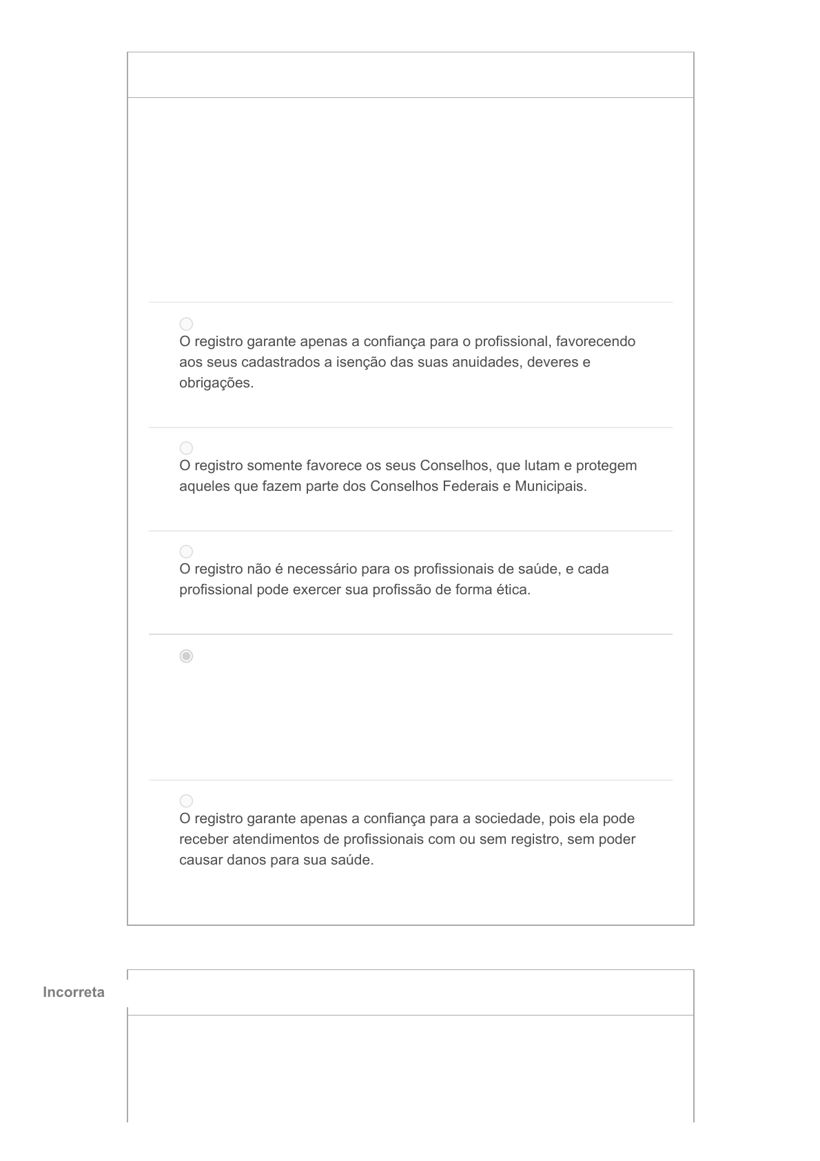 03/12/2022 17:12 Simulado: Ética e Bioética em saúde - Online_NOVO (Turma 7) https://afya.instructure.com/courses/43815/quizzes/150842 1/16 0,5 / 0,5 ptsPergunta 1 O Registro Profissional é um número que identifica todos os profissionais atuantes em atividades regulamentadas, garantindo que o exercício profissional se dê da maneira estabelecida na Lei. Assim, o registro profissional é condição indispensável ao exercício da profissão. De acordo com esse registro, assinale a alternativa correta. O registro garante apenas a confiança para o profissional, favorecendo aos seus cadastrados a isenção das suas anuidades, deveres e obrigações. O registro somente favorece os seus Conselhos, que lutam e protegem aqueles que fazem parte dos Conselhos Federais e Municipais. O registro não é necessário para os profissionais de saúde, e cada profissional pode exercer sua profissão de forma ética. O registro garante confiança e credibilidade tanto para a sociedade como para o profissional, a proteção da sociedade dos maus profissionais, de pessoas sem formação exercendo a profissão, dos riscos que envolvem a ausência de fiscalização. O registro garante apenas a confiança para a sociedade, pois ela pode receber atendimentos de profissionais com ou sem registro, sem poder causar danos para sua saúde. 0 / 0,5 ptsPergunta 2IncorretaIncorreta A ética é definida como um conjunto de valores que orientam o comportamento do homem em relação aos outros na sociedade em que vive, garantindo, igualmente, o bem-estar social, ou seja, é a 03/12/2022 17:12 Simulado: Ética e Bioética em saúde - Online_NOVO (Turma 7) https://afya.instructure.com/courses/43815/quizzes/150842 2/16 forma que o homem deve se comportar no seu meio social. Vem do grego “ethos”, que significa modo de ser. A respeito da ética, assinale a alternativa correta. É o conjunto de características de uma determinada pessoa ou organização que determina a forma como as pessoas se comportam e interagem com as outras e com o meio ambiente. A ética é direcionada à ideia de caráter, designando os costumes e o modo de ser de uma pessoa, ou de um grupo de pessoas. É um conjunto de regras, costumes e formas de pensar de um grupo social que define o que devemos ou não devemos fazer em sociedade. É um tratado dos deveres e da moral. É uma teoria sobre as escolhas dos indivíduos, o que é moralmente necessário e serve para nortear o que realmente deve ser feito. É o conjunto de direitos e deveres exercidos por um indivíduo que vive em sociedade, no que se refere ao seu poder e grau de intervenção no usufruto de seus espaços e na sua posição de poder neles intervir e transformá-los. 0,5 / 0,5 ptsPergunta 3 Normalmente, as profissões regidas por uma legislação própria são classificadas como profissões regulamentadas. Em sua legislação estão determinadas as obrigações a exercer e os direitos do profissional. As profissões regulamentadas têm sua própria exigência quanto à formação do profissional que poderá exercê-las, como formação técnica, cursos superiores, diplomas específicos, entre outras exigências acadêmicas. Com relação à regulação das profissões, assinale a alternativa correta. 03/12/2022 17:12 Simulado: Ética e Bioética em saúde - Online_NOVO (Turma 7) https://afya.instructure.com/courses/43815/quizzes/150842 3/16 A regulamentação vale para o empregador, pois é ele quem presta serviço para a comunidade, seus profissionais só devem seguir o código de ética. A regulamentação reflete significativamente no mercado de trabalho, nos serviços ofertados, nos procedimentos e nas atividades de exercícios específicos de cada profissão. A regulamentação só está válida para os profissionais que são autônomos e não possuem formação necessária para exercer seus exercícios profissionais. A regulamentação profissional, no Brasil, não está muito clara, porque ora ela coloca limites e determina deveres, ora ela não cumpre e libera todos os profissionais de qualquer cunho para prestar serviço à comunidade. A regulamentação dos profissionais de saúde não exige formações superiores, técnicas ou diplomas específicos. 0,5 / 0,5 ptsPergunta 4 Uma profissão é classificada como regulamentada quando ela tem em sua legislação os direitos e deveres do profissional. Além disso, ele tem como benefícios carteira profissional, piso salarial, jornada de trabalho e licença. A regulação jurídica das profissões de saúde no Brasil é composta por um conjunto normativo amplo, complexo e fragmentado, que encontra sua base na Constituição Federal de 1988 (CF/1988) e se complementa por uma extensa e variada quantidade de leis, decretos, portarias e, principalmente, resoluções editadas pelos conselhos profissionais. Isso só foi possível a partir dos três poderes a seguir: Poder Partidário, Poder Legislativo e Poder Internacional. Poder Estudantil, Poder Comerciário e Poder Armamentista. 03/12/2022 17:12 Simulado: Ética e Bioética em saúde - Online_NOVO (Turma 7) https://afya.instructure.com/courses/43815/quizzes/150842 4/16 Poder Executivo, Poder Acadêmico e Poder Parlamentar. Poder Legislativo, Poder Executivo e Poder Judiciário. Poder Municipal, Poder Partidário e Poder Militar. 0,5 / 0,5 ptsPergunta 5 Os Conselhos de classes de uma profissão são uma organização formada pelos trabalhadores da mesma profissão. Além de representarem a classe profissional, eles têm a função de regulamentar a atividade dos profissionais; determinar os limites de atuação da profissão; fiscalizar os exercícios profissionais, a fim de garantir que os serviços prestados sejam feitos de forma correta; orientar os profissionais e efetuar novos registros de profissionais. De forma hierárquica, assinale quais são os dois conselhos responsáveis pelos Conselhos profissionais. Conselhos de Saúde e Políticas Públicas. Conselhos Federais e Regi