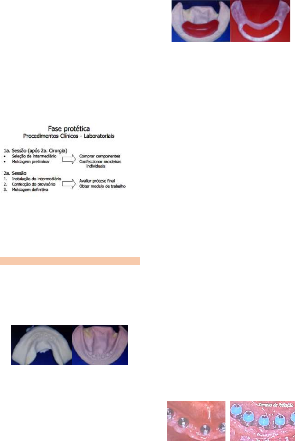 Lara Carvalho Moraes Implantodontia – Próteses tipo protocolos Caso clínico: Paciente desdentado chega no consultório com 5 implantes na região anterior da mandíbula, com cicatrizador em posição e gengiva cicatrizada para confecção de um protocolo inferior que é uma prótese apoiada e retida pelos implantes. As etapas seguintes são semelhantes as realizadas para confecção de uma prótese total, a começar pela moldagem anatômica. Protocolo: Prótese total fixa, implantorretida e implantossuportada, dentes em acrílico. 4 a 6 implantes na região pré-forame. 1ª sessão - Seleção do intermediário e moldagem preliminar para confeccionar moldeiras individuais: 15 a 30 dias após a segunda cirurgia (reabertura, exposição da cabeça do implante e instalação dos cicatrizadores). Moldagem preliminar A moldagem preliminar ou anatômica é realizada com alginato (e não godiva) como se fosse para uma PT, abrangendo toda a área chapeável de interesse, incluindo todo o rebordo. Todo o tratamento é realizado como se fosse uma dentadura, apoiando no rebordo. Ao obter o modelo de gesso, delimitar a região dos implantes e preparar para confeccionar a moldeira individual. Não dá para usar moldeira de estoque. Fazer uma muralha de cera (alívio em cera) no modelo de gesso na região dos implantes e, em seguida, uma moldeira individual aberta é confeccionada. . Os transferentes de moldagem aberta são altos e possuem um parafuso. Durante a moldagem, a parte retentiva do componente de transferência fica no interior do material de moldagem e o parafuso fica para fora, como na moldagem para prótese unitária. Isso justifica a confecção da muralha de cera. Na boca do paciente, nessa mesma sessão, os cicatrizadores são removidos para seleção dos componentes, a começar pelos intermediários. Remove um dos cicatrizadores, mede a quantidade de gengiva e põe o selecionador (se disponível) ou o cicatrizador novamente. Não deixar sem cicatrizador pois a gengiva colaba. No caso em questão, foi selecionado o intermediário convencional que fica totalmente exposto (há uma grande variedade de opções no mercado, poderia ser um mini pilar, um pilar estético, um pilar de fresagem, etc.). O objetivo é que esse ficasse 2 a 3mm acima da gengiva queratinizada. Os implantes são hexágonos externos e os intermediários são parafusados nos implantes. É necessário radiografar para verificar a adaptação (avaliação subgengival). O feixe de raio-x deve estar o mais perpendicular possível à interface que se quer visualizar, não pode estar angulado. Em seguida, realizar o torque do componente de acordo com o recomendado pelo fabricante, geralmente em torno de 20-30N, utilizando a chave para torque e torquímetro ou o próprio motor. O paciente não pode ir embora dessa forma com o intermediário em posição na boca, pois machuca a língua, há entrada de microrganismos e sujidades. É preciso fazer uma proteção com tampas de proteção em teflon ou titânio. Explicar o paciente que tem que higienizar. Lara Carvalho Moraes Moldagem fechada A moldagem pode ser com moldeira aberta ou fechada. A moldagem fechada também pode ser utilizada para componentes parafusados, mas é menos precisa. A moldagem pode ser feita sobre a cabeça do implante ou sobre o intermediário protético, dependendo da situação. Na moldagem fechada, o transferente é colocado em posição e parafusado na boca, é realizada a moldagem e o molde é obtido com o negativo do componente. O transferente é desparafusado da boca do paciente, conectado no análogo e esse conjunto é colocado em posição no molde previamente obtido. Qual o problema dessa moldagem? Apesar de prática, pode ter distorção e problemas de distanciamento entre os implantes por ser uma prótese múltipla fixa. Se fosse uma unitária seria aceitável. No caso em questão, só funciona para: estudo (avaliação da posição dos implantes), confecção de provisórios ou quando não se consegue trabalhar na boca do paciente, logo a peça é feita em 5 unidades e soldada pelo técnico. Moldagem definitiva Dessa forma, é preferível ter precisão e essa moldagem deve ser feita com a moldeira individual aberta. Os componentes de transferência para moldeira aberta são quadrangulares o que impede que girem no interior do material de moldagem. Por ser uma prótese unida e precisar que as peças fiquem na posição correta, é necessário unir os componentes com fio dental fazendo um “oito” e sobre este é aplicada resina acrílica de baixa contração (Duraley), para obter assim um complexo de transferência. Quanto maior o volume de resina, maior a contração logo não pode ter excesso. Pode usar uma broca 3203 para separar as partes, liberar a tensão e depois unir novamente com pequena quantidade de resina. Em seguida, provar a moldeira em boca e verificar se ela continua adaptando. Verificar se o complexo de transferência não impede o assentamento da moldeira individual, fazendo ajustes, se necessário, e verificando também a altura dos parafusos de trabalho, que devem ultrapassar a borda superior da moldeira. Na moldagem com silicone de condensação ou de adição é necessário utilizar um adesivo para retenção química do material na moldeira de resina acrílica ou usar o poliéter (Impregum), que também tem o adesivo e é muito rígido, sendo muito bom para uso na implantodontia. Tampar a parte da abertura da moldeira com cera 7 ou 9 flambada para evitar que o material de moldagem extravase excessivamente (o material molda quando está sendo comprimido) e, em seguida, levar a moldeira novamente em boca para criar orifícios de acesso aos parafusos de trabalho. A moldeira é posicionada na boca com o material de moldagem. Os orifícios de acesso aos parafusos permitirão que o complexo de transferência seja desparafusado após a presa do material de moldagem, possibilitando a remoção da moldeira com o complexo de t