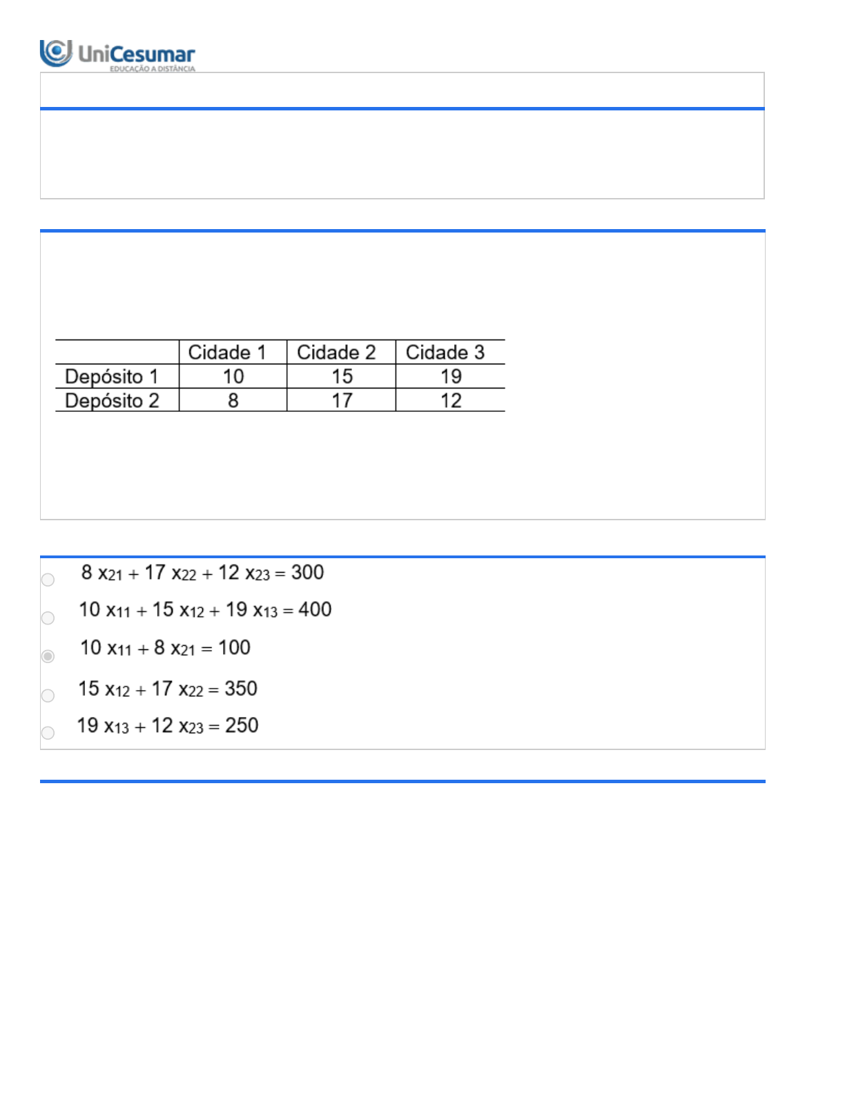 29/11/2022 10:53 Unicesumar - Ensino a Distância about:blank 1/4 ATIVIDADE 4 - PESQUISA OPERACIONAL - 54/2022 Período:21/11/2022 08:00 a 09/12/2022 23:59 (Horário de Brasília) Status:ABERTO Nota máxima:1,00 Gabarito:Gabarito será liberado no dia 10/12/2022 00:00 (Horário de Brasília) Nota obtida: 1ª QUESTÃO Uma empresa possui dois depósitos para fornecer seus produtos em três cidades diferentes. A tabela a seguir apresenta os custos de transportes de cada um dos depósitos para cada uma das cidades. Os depósitos 1 e 2 têm capacidades para armazenar, respectivamente, 400 e 300 unidades do produto. As cidades 1, 2 e 3 têm, respectivamente, demandas de 100, 350 e 250. Fonte: o autor. Seja x o número de unidades despachadas do ponto de fornecimento i para o ponto de demanda j. A equação que representa a restrição de demanda da Cidade 1 é: ALTERNATIVAS . . . . . 2ª QUESTÃO ij 29/11/2022 10:53 Unicesumar - Ensino a Distância about:blank 2/4 Considere o problema de pesquisa operacional cuja região viável é o sólido geométrico a seguir, que contém os vértices A, B, C, D e E: Fonte: o professor (2022) Sabendo que a função objetivo é definida como MÁX z = 10 x + 12 x + 12 x , é correto afirmar que o valor ótimo ocorre no ponto: ALTERNATIVAS A B C D E 3ª QUESTÃO O método simplex é um dos principais métodos de resolução do problema de pesquisa operacional. Os cálculos podem ser convenientemente realizados em um tableau simplex, que será transformado por pivoteamentos até que a solução ótima seja encontrada. A respeito do método, analise as afirmações: I. O algoritmo termina quando todos os elementos da última linha do tableau sejam não negativos. A existência de zeros nessa linha indica que há várias soluções ótimas. II. O método simplex permite encontrar a solução ótima de problemas de programação não linear. III. O método simplex permite encontrar a solução ótima de problemas de programação linear. É correto o que se afirma em: ALTERNATIVAS 1 2 3 29/11/2022 10:53 Unicesumar - Ensino a Distância about:blank 3/4 I, apenas. II, apenas. I e III, apenas. II e III, apenas. I, II e III. 4ª QUESTÃO Considere que em um jogo com decisões simultâneas entre duas pessoas exista um Equilíbrio de Nash. Cada pessoa conhece previamente todas as estratégias possíveis e os retornos dos participantes para cada combinação de estratégias. Neste jogo, certamente: ALTERNATIVAS há pelo menos um outro Equilíbrio de Nash. pode haver outro Equilíbrio de Nash. não há estratégia dominante. pelo menos uma estratégia, de um dos participantes, é dominante. todas as estratégias possíveis dos jogadores são puras. 5ª QUESTÃO O método simplex é um dos principais métodos de resolução do problema de programação linear. Os cálculos podem ser convenientemente realizados em um tableau simplex, que será transformado por pivoteamentos até que a solução ótima seja encontrada. A tabela, a seguir, apresenta o último tableau simplex de um problema de pesquisa operacional. Fonte: o Autor. Nessas condições, analise as afirmações que seguem: I. As variáveis de folga são x , x e x . II. A função objetivo avaliada na solução ótima e viável é igual a 12. III. x = 4, x = 4 e x = 4 é uma solução viável e ótima. É correto o que se afirma em: ALTERNATIVAS 4 5 6 1 2 3 29/11/2022 10:53 Unicesumar - Ensino a Distância about:blank 4/4 I, apenas. II, apenas. I e III, apenas. II e III, apenas. I, II e III.