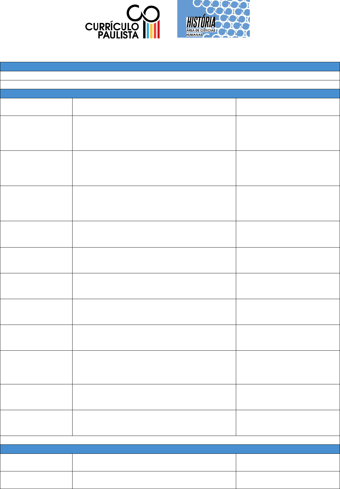 HISTÓRIA 6º ANO - ENSINO FUNDAMENTAL 1º BIMESTRE UNIDADES TEMÁTICAS HABILIDADES OBJETOS DE CONHECIMENTO História: tempo, espaço e formas de Registros (EF06HI01A) Identificar as diferentes noções de tempo (cronológico, da natureza e histórico). A questão do tempo, sincronias e diacronias: reflexões sobre o sentido das cronologias. História: tempo, espaço e formas de Registros (EF06HI01B) Identificar as diversas formas de notação do tempo (calendários diversos e outros artefatos), bem como as distintas formas de periodização da história. A questão do tempo, sincronias e diacronias: reflexões sobre o sentido das cronologias. História: tempo, espaço e formas de Registros (EF06HI01C) Reconhecer que a organização do tempo é construída culturalmente, de acordo com a sociedade e o contexto. A questão do tempo, sincronias e diacronias: reflexões sobre o sentido das cronologias. História: tempo, espaço e formas de Registros (EF06HI02A) Identificar a importância das fontes históricas para a produção do saber histórico. Formas de registro da história e da produção do conhecimento histórico. História: tempo, espaço e formas de Registros (EF06HI03A) Identificar as hipóteses científicas para o surgimento do ser humano, tendo em vista sua historicidade. As origens da humanidade, seus deslocamentos e os processos de sedentarização. História: tempo, espaço e formas de Registros (EF06HI03B) Analisar o significado das explicações mitológicas para o surgimento do ser humano, tendo em vista sua historicidade. As origens da humanidade, seus deslocamentos e os processos de sedentarização. História: tempo, espaço e formas de Registros (EF06HI04) Conhecer as teorias sobre a origem do homem na América e no Brasil. As origens da humanidade, seus deslocamentos e os processos de sedentarização História: tempo, espaço e formas de Registros (EF06HI06) Identificar geograficamente as rotas do povoamento do território americano e brasileiro. As origens da humanidade, seus deslocamentos e os processos de sedentarização História: tempo, espaço e formas de Registros (EF06HI05) Descrever as relações entre sociedade e natureza, com destaque para os povos indígenas originários e povos africanos, discutindo a lógica da modificação da paisagem. As origens da humanidade, seus deslocamentos e os processos de sedentarização História: tempo, espaço e formas de Registros (EF06HI03A) Identificar as hipóteses científicas para o surgimento do ser humano, tendo em vista sua historicidade. As origens da humanidade, seus deslocamentos e os processos de sedentarização História: tempo, espaço e formas de Registros (EF06HI03B) Analisar o significado das explicações mitológicas para o surgimento do ser humano, tendo em vista sua historicidade. As origens da humanidade, seus deslocamentos e os processos de sedentarização 2º BIMESTRE UNIDADES TEMÁTICAS HABILIDADES OBJETOS DE CONHECIMENTO A invenção do mundo clássico (EF06HI07A) Identificar as diferentes formas de linguagens, registros, técnicas e artes nas Povos da Antiguidade na África (egípcios), no Oriente e o contraponto com outras sociedades sociedades antigas (África, Ásia e Américas). Médio (mesopotâmicos) e nas Américas (pré- colombianos); Os povos indígenas originários do atual território brasileiro e seus hábitos culturais e sociais. A invenção do mundo clássico e o contraponto com outras sociedades (EF06HI07B) Reconhecer a importância da tradição oral, cultura material e escrita para a transmissão da memória e do conhecimento nas diferentes sociedades antigas (África, Ásia e Américas). Povos da Antiguidade na África (egípcios), no Oriente Médio (mesopotâmicos) e nas Américas (pré- colombianos); Os povos indígenas originários do atual território brasileiro e seus hábitos culturais e sociais. A invenção do mundo clássico e o contraponto com outras sociedades (EF06HI08A) Identificar a partir de mapas os espaços territoriais ocupados pelos astecas, maias, incas e povos indígenas do Brasil. Povos da Américas (pré- colombianos); Os povos indígenas origi- nários do atual território brasileiro e seus hábitos culturais e sociais. A invenção do mundo clássico e o contraponto com outras sociedades (EF06HI08B) Identificar a partir de documentos visuais e escritos as principais características das sociedades indígenas da América, em especial seus aportes tecnológicos, culturais e sociais. Povos da Américas (pré- colombianos); Os povos indígenas origi- nários do atual território brasileiro e seus hábitos culturais e sociais. A invenção do mundo clássico e o contraponto com outras sociedades (EF06HI09) Discutir os motivos pelos quais as civilizações grega e romana são consideradas como Antiguidade Clássica, tendo em vista os seu legado na tradição ocidental. O Ocidente Clássico: aspectos da cultura na Grécia e em Roma. Lógicas de organização política (EF06HI10) Explicar a formação da Grécia Antiga, com ênfase na formação da pólis e nas transformações políticas, sociais e culturais. As noções de cidadania e política na Grécia e em Roma: Domínios e expansão das culturas grega e romana; Significados do conceito de “império” e as lógicas de conquista, conflito e negociação dessa forma de organização política. As diferentes formas de organização política na África: reinos, impérios, cidades-estados e sociedades linhageiras ou aldeias. Lógicas de organização política (EF06HI11) Caracterizar o processo de formação da Roma Antiga e suas configurações sociais e políticas nos períodos monárquico e As noções de cidadania e política na Grécia e em Roma: republicano. Domínios e expansão das culturas grega e romana; Significados do conceito de “império” e as lógicas de conquista, conflito e negociação dessa forma de organização política. As diferentes formas de organização política na Áf