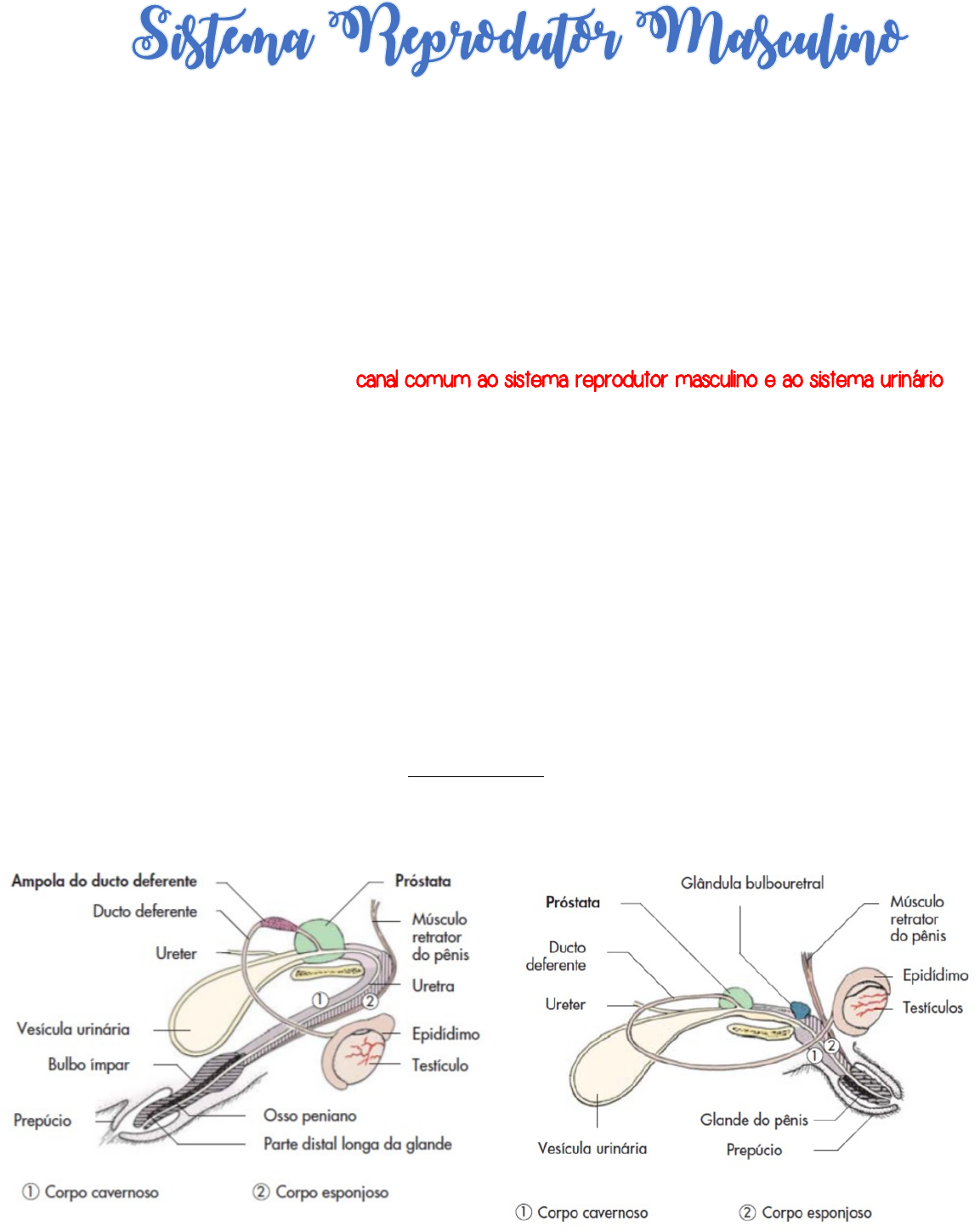 Constituição: 2 Testículos 2 Epidídimos 2 Ductos Deferentes Divertículo de pele: Escroto Glândulas acessórias sexuais (Ampulares; Vesiculares; Próstata e Bulbouretrais) Uretra- PELVICA e PENIANA ( ) Pênis Divertículo de pele: Prepúcio Representação Esquemática dos órgãos genitais MASCULINOS dos animais domésticos CARNÍVOROS By: MARIA ALICE MENDES DOS SANTOS Cão Gato RUMINANTES EQUINOS SUÍNOS Touro Garanhão Varrão ou Cachaço TESTÍCULOS - atuam como GONÂDAS e GLÂNDULAS masculinas: produção de espermatozoides e de hormônios androgênicos esteroides, os quais são responsáveis pelas caraterísticas sexuais secundárias e pelo comportamento típico do macho. - funcionalmente inativos até a puberdade Orientação Testicular RUMINANTES: eixo longitudinal - Ventral à parte caudal do abdome; EQUINOS E CANINOS: eixo - Posição entre o ânus e a “virilha”; SUÍNOS E FELINOS: - ventral ao ânus. Touro Garanhão Cão Varrão ou Cachaço Gato Situados: no Aspectos Anatômicos Externos 2 Extremidades: - Capitada (em contato com a cabeça do epidídimo) - Caudada (em contato com a cauda do epidídimo) 2 Bordas: - Livre - Epididimária ou De Inserção 2 Faces: - Lateral - Medial (voltada para o septo escrotal) Envoltórios: camada visceral da túnica vaginal e túnica albugínea (completamente aderida) Vascularização: - Artéria testicular (Aorta abdominal) - Veias calibrosas (Plexo pampiniforme) Molde de corrosão dos vasos do BOVINO - Artéria testicular (vermelho) - Plexo pampiniforme (azul) Parênquima Testicular: - aspecto esponjoso (os poros são os milhares de túbulos seminíferos seccionados) - a túnica albugínea invagina no parênquima e forma as trabéculas- septos = lóbulos - lóbulos: túbulos seminíferos contornados + túbulos seminíferos retos (formam a rede testicular) ⇨ túbulos eferentes ⇨ penetram na cabeça do epidídimo e confluem formando o ducto epididimário (único) - MEDIASTINO TESTICULAR: área rica em tecido conjuntivo, situada +/- no meio do testículo EPIDIDÍMO - Órgão em formato de “C” localizado na margem epididimária do testículo - Formado por inúmeras convoluções do ducto epididimário, o qual prossegue até a cauda do epidídimo, a parti daí, prossegue na forma de ducto deferente - Local onde os espermatozoides completam seu desenvolvimento, adquirindo motilidade e são armazenados, até o processo de ejaculação Estruturas Anatômicos Externas: 3 partes - Cabeça - Corpo - Cauda Ligamentos: - : fixa a cauda do epidídimo à extremidade caudada do testículo - Ligamentos DA CAUDA DO EPIDÍDIMO: fixa a cauda do epidídimo à túnica vaginal Cordão ou Funículo espermático do epidídimo do epidídimo do epidídimo Testículo Camada Parietal da Túnica Vaginal ESCROTO: -Evaginação da pele da parede abdominal em formato de bolsa Estruturas Anatômicos Internas - SEPTO MEDIANO ou ESCROTAL, divide o escroto em duas CAVIDADES INDEPENDENTES Estruturas Anatômicos Externas - Rafe do escroto Camadas 1º. Pele externa 2º. Túnica dartos (fortemente aderida a pele) 3º. Fáscia espermática externa 4º. Fáscia cremásterica 5º. Fáscia espermática interna 6º. Camada parietal da túnica vaginal – seccionada para realização da castração Pele Septo mediano escrotal Túnica dartos Fáscia espermática externa Camada Parietal da Túnica Vaginal Camada Visceral da Túnica Vaginal e Túnica Albugínea Onde está os c Pele Túnica dartos Fáscia espermática externa Túnica dartos Fáscia espermática externa Fáscia cremásterica Fáscia espermática interna Camada Parietal da Túnica Vaginal Camada Visceral da Túnica Vaginal DUCTO DEFERENTE - é a continuação do ducto epididimário CORDÃO ou FUNÍCULO ESPERMÁTICO: Local por onde vasos e nervos são conduzidos para dentro e para fora dos testículos. Componentes: - Artéria testicular (Aorta abdominal) - Veias calibrosas ( ) - Ducto deferente - Vasos linfáticos - Nervos testiculares - (m. estriado esquelético) estende-se da até a Irradia na camada parietal da túnica vaginal ⇨ penetra na cavidade abdominal através do canal inguinal ⇨ separa- se das outras estruturas do funículo espermático ⇨ curva-se caudalmente ⇨ prega genital ⇨ superfície dorsal da bexiga urinária ⇨ desemboca na uretra pélvica Artéria testicular Ducto deferente Secção transversa do cordão espermático Plexo pampiniforme M. cremaster GLÂNDULAS SEXUAIS ACESSÓRIAS Glândulas AMPULARES ou AMPOLAS DO DUCTO DEFERENTE: - Formada pelo espessamento da mucosa na parte terminal do ducto deferente. Glândulas VESICULARES: - Derivada da parte terminal do ducto deferente. - Localizadas: lateralmente as Glândulas Ampulares, quando presentes; dorsalmente de cada lado da parte caudal da bexiga urinária. E parte inicial da uretra pélvica. PROSTATA: Constituição: - Parte compacta: CORPO- dorsal na parte inicial da uretra pélvica - Parte disseminada- abaixo do músculo uretral BOVINO e SUÍNO: corpo e parte disseminada PEQUENO RUMINANTE: parte disseminada CÃO., GATO e EQUINO: corpo Glândulas BULBOURETRAIS: - Localizadas: dorsalmente na extremidade distal da uretra pélvica (próxima à saída da pelve) Globular; Circunda a uretra pélvica COMPLETAMENTE Globular; Circunda a uretra pélvica INCOMPLETAMENTE - parede ventral é livre TOURO Glândulas Ampulares: Glândulas Vesiculares: Próstata - Corpo: - Parte disseminada: Glândulas Bulbouretrais: M. isquiocavernoso GATO Glândulas Ampulares: Glândulas Vesiculares: Próstata - Corpo: - Parte disseminada: Glândulas Bulbouretrais: CÃO Glândulas Ampulares: Glândulas Vesiculares: Próstata - Corpo: - Parte disseminada: Glândulas Bulbouretrais: Glândulas Ampulares: Glândulas Vesiculares: Próstata - Corpo: - Parte disseminada: Glândulas Bulbouretrais: MAIS DESENVOLVIDAS Varrão ou Cachaço Apresenta de todas as estruturas relacionadas ao sistema reprodutor, inclusive das GLÂNDULAS Varrão ou Cachaço Glândulas Ampulares