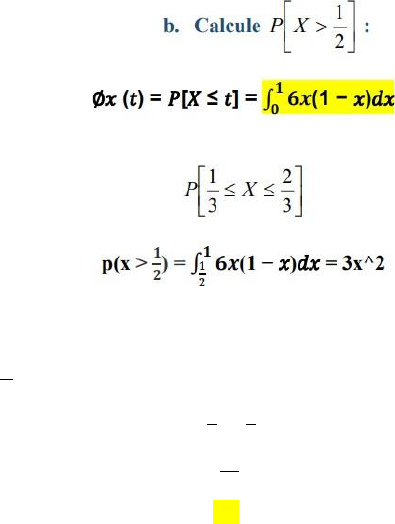 VARIABLES ALEATORIAS CONTINUAS 1. Se supone que el diámetro de un cable eléctrico X es una variable aleatoria continua con función de densidad: f(x)=6x(1-x) para 0<x 1 y cero en cualquier otro caso. a. Obtenga la función de distribución acumulada X (t) . 𝟐 𝟐 𝟏 (-2x^3) 𝟏 = ((3(1) ^2) - (2(1) ^3) - (3((1/2) ^2) - 2(1/2) ^3) 𝟐 (1)-((𝟑)- (𝟐)) 𝟒 𝟔 1 - (𝟏𝟎) 𝟐𝟒 = 𝟕 𝟏𝟐