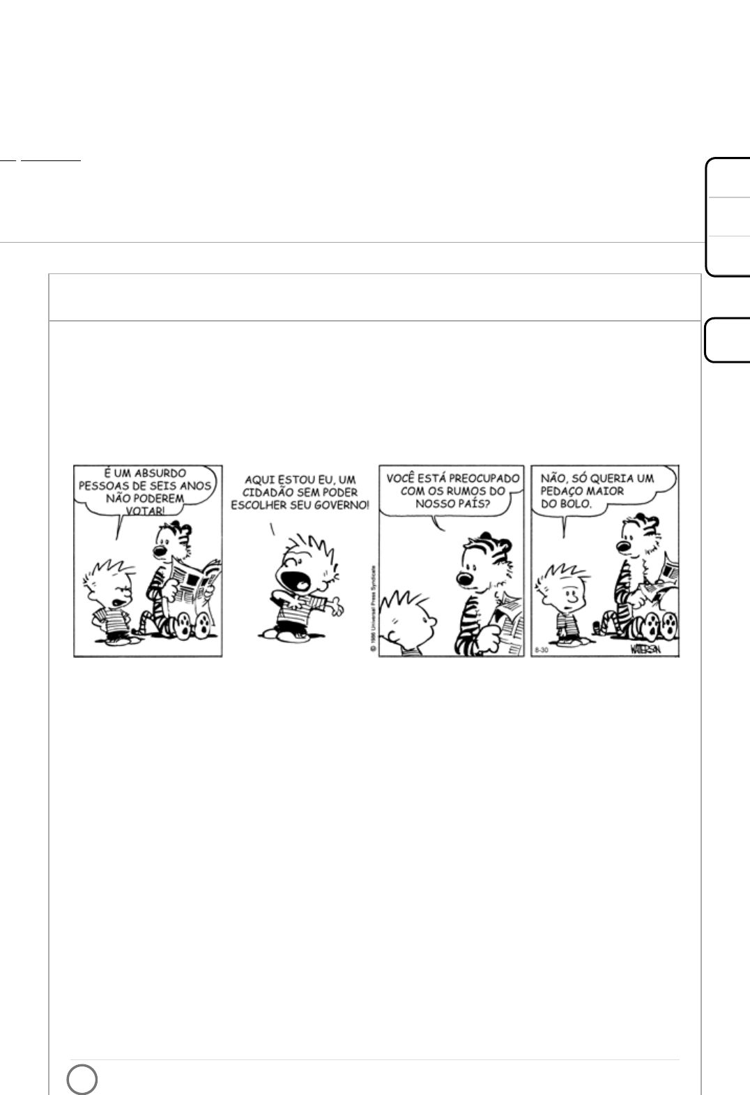 AO2 Iniciado: 5 dez em 8:41 Instruções do teste Importante: Caso você esteja realizando a atividade através do aplicativo "Canvas Student", é necessário que você clique em "FAZER O QUESTIONÁRIO", no final da página. 0,6 ptsPergunta 1 Esse é um conceito que deve ser trabalhado a partir do Ensino Fundamental, pois Dentre os conteúdos interdisciplinares na educação básica, encontramos a discussão sobre o termo cidadania. Com base nisso, leia a tirinha abaixo: Calvin e Haroldo, por Bill Waterson. Assinale a única alternativa com a definição correta de cidadania. A+ A A- envolve um conjunto de ideias abstratas que, para uma criança pequena, podem ser difíceis de entender. As normas políticas, sociais, culturais, geográficas, entre outras, são trabalhadas com mais ênfase nos anos finais do E.F. Os estudos sobre a cidadania na educação básica envolvem entender a estrutura política e governamental do país. Assim, se estuda sobre as três esferas de poder e sobre os papéis e funções dos diferentes cargos políticos eletivos (prefeitos, governadores, deputados, senadores, presidentes, vereadores). A cidadania trata do poder de voto e outros assuntos de ordem política. Portanto, na Educação Infantil e nos anos iniciais do Ensino Fundamental, se refere a prepará-los para esse dever cívico no futuro, ajudando-os a exercer a democracia em momentos de voto em assuntos da turma. Esse conceito deve ser mencionado nas aulas de História, principalmente para entender outros conceitos como nação. Porém, o(a) professor(a) deve evitar aprofundá-lo, pois há o perigo dele(a) expor as suas próprias opiniões políticas, o que pode gerar polêmicas com os alunos e os seus respectivos responsáveis. Dentro da educação básica, trata-se de ajudar os alunos a terem pensamento crítico em relação ao mundo ao seu redor, entendendo que eles possuem direitos (a brincar e à saúde, por exemplo) e deveres (em relação ao convívio social e normas de trânsito, entre outros). 0,6 ptsPergunta 2 Leia o texto abaixo: De acordo com Vygotsky, o desenvolvimento e a aprendizagem estão inter- relacionados desde o nascimento da criança. Como já mencionamos, desde muito pequenas, através da interação com o meio físico e social, as crianças realizam uma série de aprendizados. [...] Como membro de um grupo sociocultural determinado, ela vivencia um conjunto de experiências e opera sobre todo o material cultural (conceitos, valores, ideias, objetos concretos, concepção de mundo etc.) a que tem acesso. Deste modo, muito antes de entrar na escola, já construiu uma série de conhecimentos do mundo que a cerca. Fonte: REGO, C. Vygotsky: uma perspectiva histórico-cultural da educação. 23. ed. Petrópolis: Vozes, 2012. p.76. A+ A A- As asserções I e II são proposições verdadeiras, e a II é uma justificativa da I. A asserção I é uma proposição verdadeira, e a II é uma proposição falsa. As asserções I e II são proposições falsas. A asserção I é uma proposição falsa, e a II é uma proposição verdadeira. As asserções I e II são proposições verdadeiras, mas a II não é uma justificativa da I. Com base no texto e nos seus estudos, analise as asserções abaixo e a relação proposta entre elas: I. A discussão acerca dos conhecimentos prévios da criança é um dos elementos mais indispensáveis da Educação Infantil. Com o aumento de seus conhecimentos acadêmicos, ao chegar no Ensino Fundamental I o(a) professor(a) pode deixar de discuti-los aos poucos. PORQUE II. Como Vygotsky possuía uma perspectiva histórico-cultural sobre o processo de ensino-aprendizagem, as disciplinas dentro das Ciências Humanas devem incorporar as teorias desse pesquisador para que os seus conteúdos e discussões sejam significativos para os alunos. Em relação às asserções, assinale a alternativa correta: 0,6 ptsPergunta 3 Dentre os meios para ajudar os alunos a compreenderem a noção de preservação dentro da História, está o trabalho com o conceito de patrimônio. Leia o texto a seguir, retirado do site da Unesco sobre os patrimônios brasileiros: O Patrimônio Cultural Imaterial ou Intangível compreende as expressões de vida e tradições que comunidades, grupos e indivíduos em todas as partes do mundo A+ A A- O conceito de patrimônio cultural imaterial deve ser trabalhado a partir do 1º ano de E.F.I, pois tal noção pode ser abstrata demais para um aluno da Educação Infantil, que ainda não está no estágio de desenvolvimento cognitivo adequado para formular tal entendimento. A discussão sobre o patrimônio em sala de aula, seja ele material ou imaterial, serve para que os alunos sejam capazes de identificar os patrimônios de sua cidade ou região, para que possam discutir as razões culturais, sociais e políticas para que sejam assim considerados. É preciso trabalhar o conceito de patrimônio desde o começo da educação básica, para que o aluno construa o seu saber histórico. Até o E.F.I, ele deve entender sobre patrimônios culturais materiais, sendo os imateriais trabalhados a partir do 6º ano. O conhecimento sobre patrimônio, por ser mais amplo e mais distante da realidade do aluno, deve ser apresentado a partir do 5º ano do E.F., sendo estudado com maior preocupação a partir dos anos finais. Deve-se discutir tanto patrimônios materiais quanto imateriais. Como o trecho coloca, as manifestações culturais, para serem consideradas patrimônios, devem ser elementos que existem a centenas ou a milhares de anos, além de não serem mais realizadas ou seguidas por gerações atuais. recebem de seus ancestrais e passam seus conhecimentos a seus descendentes. O Patrimônio Cultural Imaterial não se constitui apenas de aspectos físicos da cultura. Há muito mais, contido nas tradições, no folclore, nos saberes, nas línguas, nas festas e em diversos outros aspectos e manifestações, transmitidos oral ou gestualmente, recriados coleti