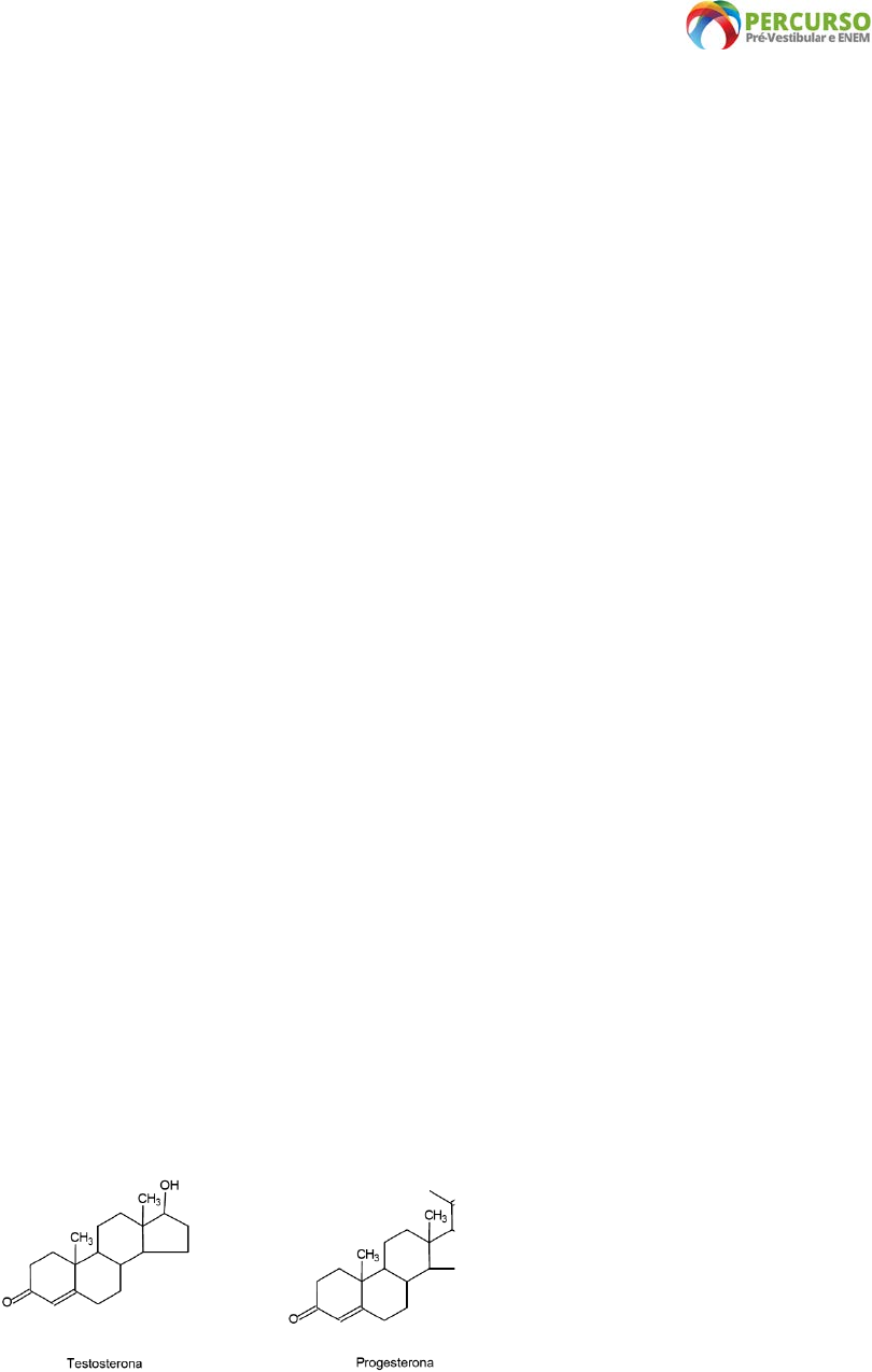 QUÍMICA ORGÂNICA 01 - (IFGO/2013) Em relação ao tolueno (metilbenzeno), é correto afirmar: a) Todos os carbonos são hibridizados sp3. b) Os carbonos 1, 2 e 3 são sp2 e os demais são sp3. c) Todos os carbonos são hibridizados sp2. d) Todos os carbonos são hibridizados sp. e) O carbono do grupo metila é sp3 e os demais são sp2. Gab: E 02 - (UFPR/2013) O átomo de carbono sofre três tipos de hibridação: sp3, sp2 e sp. Essa capacidade de combinação dos orbitais atômicos permite que o carbono realize ligações químicas com outros átomos, gerando um grande número de compostos orgânicos. A seguir são ilustradas estruturas de dois compostos orgânicos que atuam como hormônios. Acerca da hibridação dos átomos de carbono nos dois hormônios, considere as seguintes afirmativas: 1. A testosterona possui dois átomos de carbono com orbitais híbridos sp2. 2. A progesterona possui quatro átomos de carbono com orbitais híbridos sp2. 3. Ambos os compostos apresentam o mesmo número de átomos de carbono com orbitais híbridos sp3. 4. O número total de átomos de carbono com orbitais híbridos sp3 na testosterona é 16. Assinale a alternativa correta. a) Somente as afirmativas 1 e 3 são verdadeiras. b) Somente as afirmativas 2 e 4 são verdadeiras. c) Somente as afirmativas 2, 3 e 4 são verdadeiras. d) Somente as afirmativas 1, 2 e 3 são verdadeiras. e) As afirmativas 1, 2, 3 e 4 são verdadeiras. Gab: B 03 - (UFT TO/2012) O dióxido de carbono pode ser produzido pela combustão completa do metano. A mudança na hibridização do átomo de carbono neste processo reacional é a) sp2 para sp b) sp3 para sp2 c) sp3 para sp d) sp para sp2 e) sp para sp3 Gab: C QUÍMICA ORGÂNICA 04 - (UECE/2011) “Química Orgânica é o ramo da Química que estuda os compostos do carbono”. A maioria dos seus compostos são importantes em nossas vidas, destacando o álcool comum, a gasolina, o ácido acético, as proteínas e as vitaminas. Assinale a alternativa que mostra a característica correta do átomo de carbono. a) Forma ligação tripla, e nesta situação o carbono é do tipo sp3. b) O carbono é tetravalente somente nos hidrocarbonetos. c) Apresenta capacidade de formar cadeias longas, variadas e estáveis. d) Liga-se a várias classes de elementos químicos, com exceção da classe dos calcogênios. Gab: C 05 - (UEM PR/2011) Assinale o que for correto. 01. Carbono, hidrogênio e oxigênio são os principais constituintes dos compostos inorgânicos. 02. A hibridização é um modelo utilizado para explicar a quantidade de ligações formadas somente para o átomo de carbono. 04. No estado fundamental, o átomo de carbono possui dois elétrons desemparelhados nos orbitais p. 08. Na molécula do ácido cianídrico, o carbono efetua duas ligações sigma e duas ligações pi. 16. O átomo de carbono pode formar compostos moleculares e iônicos. Gab: 28 06 - (UFAC/2011) A borracha natural, produzida principalmente a partir do látex de uma árvore originária da Amazônia brasileira, Heveabrasiliensis (seringueira), é um polímero natural da molécula do isopreno, cuja estrutura pode ser representada por: ou A respeito dessa molécula, é correto afirmar que: a) Possui quatro ligações do tipo sigma. b) Possui fórmula molecular C5H6. c) Não possui carbonos com hibridização do tipo sp. d) Não possui átomos de hidrogênio. e) Possui quatro carbonos hibridizados da forma sp3. Gab: C 07 - (UFSM RS/2011) A quimioluminescência é o fenômeno de produzir luz a partir de uma reação química. Esse fenômeno ocorre devido à quebra de ligações ricas em energia, formando intermediários excitados que dissipam a energia excedente na forma de radiação eletromagnética. O primeiro ensaio quimioluminescente envolve o luminol, conforme descrito na reação: QUÍMICA ORGÂNICA Analisando a molécula do luminol, é correto afirmar que ela possui a) todos os carbonos com hibridização sp2. b) os grupos funcionais amina e cetona. c) ligações pi entre orbitais sp2-sp2. d) todos os carbonos quaternários. e) seis elétrons em orbitais pi. Gab: A 08 - (UDESC SC/2010) Dentre os produtos extraídos do petróleo, destaca-se a fração gasosa, composta principalmente pelos gases CH4, C2H6, C3H8 e C4H10. A molécula de metano (CH4) apresenta quatro ligações iguais, com geometria tetraédrica e ângulo de ligação igual a 109o28’. I) pSS ↑↑↑↓↑↓ II) pSS ↑↑↑↑↑↓ III) pSS ↑↓↑↓↑↓ IV) pSS ↑↑↓↑↑↓ V) pSS ↑↓↑↑↑↓ Assinale a alternativa que indica a correta possibilidade de ligação química entre o átomo de carbono com os átomos de hidrogênio para a molécula de metano, relativa a um dos esquemas acima. a) O esquema I, onde está representado o modelo de hibridização sp. b) O esquema II, onde está representado o modelo de hibridização sp3. c) O esquema III, onde está representado o modelo de hibridização sp2. d) O esquema IV, onde está representado o modelo de hibridização sp3. e) O esquema V, onde está representado o modelo de hibridização sp. Gab: B 09 - (UFAL/2010) Os feromônios são substâncias químicas voláteis, que podem agir a longa distância e que podem ser utilizadas para a comunicação entre membros de uma mesma espécie, como insetos, mamíferos e organismos marinhos (algas, peixes, moluscos e crustáceos). O feromônio utilizado pela abelha rainha no controle da colmeia apresenta a fórmula estrutural abaixo. Com relação a essa molécula, as seguintes afirmações foram feitas: 1) possui quatro carbonos com hibridização sp2. 2) não possui carbono com hibridização sp. 3) possui três ligações π. 4) pode sofrer hidrogenação. NH NH O ONH2 PEROXIDADE H2O2/HO- NH Luminol Ex O- O- O ONH2 + N2 + H2O + H2 (425nm) O OH O QUÍMICA ORGÂNICA Dessas afirmações, estão corretas: a) 1 e 2 apenas b) 1, 2 e 3 apenas c) 2, 3 e 4 apenas d) 1, 3 e 4 apenas e) 1, 2, 3 e 4 Gab: E 10 - (UESPI/2010) A dipirona s