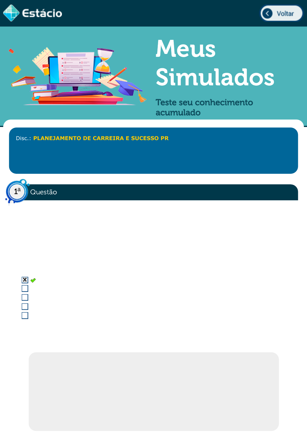 Meus Simulados Teste seu conhecimento acumulado Disc.: PLANEJAMENTO DE CARREIRA E SUCESSO PROFISSIONAL Aluno(a): LUCIANA PINHEIRO ASSAD 201901143163 Acertos: 7,0 de 10,0 29/09/2022 Acerto: 1,0 / 1,0 IBFC (Adaptada) - 2021 Avaliar o desempenho na gestão do tempo é algo muito importante. Todas as pessoas se organizam para perseguirem objetivos. Sendo assim, o desempenho de uma pessoa pode ser avaliado pela medida em que os objetivos são realizados. Assinale a alternativa que apresenta o nome que se dá ao realizar tarefas de maneira correta, sem erros sem atrasos, de maneira inteligente, com o mínimo de esforço e o maior aproveitamento dos recursos disponíveis. Eficiência Efetividade Foco Produtividade Eficácia Respondido em 04/10/2022 16:54:53 Explicação: A eficiência é definida como realizar a coisa da maneira mais rápida e econômica. Esses dois elementos reunidos formam a eficiência. Ela está diretamente ligada aos meios aplicados para a realização das tarefas e não aos resultados alcançados. Mesmo que os resultados sejam diversos dos esperados, a pessoa pode ter sido eficiente em sua execução, consumindo pouco tempo e recursos na sua execução. As demais alternativas tratam ou do resultado final como a eficácia, ou aponto para apenas um dos elementos da eficiência como a produtividade. Temos também a efetividade que o quanto do objetivo atingido fez a diferença e o foco que se refere à ação com concentração e energia. Questão1 a https://simulado.estacio.br/alunos/inicio.asp javascript:voltar(); Acerto: 1,0 / 1,0 (APICE - 2021) Nem sempre a eficácia e a eficiência andam de mãos dadas. Uma empresa pode ser eficiente em suas operações e pode não ser eficaz, ou vice-versa. Pode ser ineficiente em suas operações e, apesar disso, ser eficaz, muito embora a eficácia fosse bem melhor quando acompanhada da eficiência. Com base nestas afirmações informe qual das alternativas está relacionada a eficácia. Relação entre despesa e receita. Fazer corretamente as coisas. Razão entre o esforço e o resultado. Relação técnica entre entradas e saídas. Alcance dos objetivos por meio dos recursos disponíveis. Respondido em 04/10/2022 16:56:27 Explicação: A definição e eficácia está diretamente ligada ao atingimento dos objetivos corretos e não a qualquer objetivo. Ser eficaz é atingir os objetivos independente os meios aplicados. As demais alternativas estão ligadas a ser eficiente e não eficaz, pois tratam dos meios e não dos fins. Acerto: 0,0 / 1,0 Em relação aos eixos do conhecimento para a empregabilidade, assinale a afirmação correta: O conhecimento do porquê é o mais importante dos eixos. O capital social é um dos elementos do conhecimento do quem. O networking faz parte do conhecimento do que. Ter um título de inglês tem a ver com o conhecimento do como. A empregabilidade depende de nosso autoconhecimento. Respondido em 04/10/2022 16:58:01 Explicação: Gabarito: O capital social é um dos elementos do conhecimento do quem. Justificativa: O autoconhecimento é crucial para gerenciar nossas carreiras e para a nossa empregabilidade. Assim, o conhecimento do quem para a empregabilidade está relacionado com o capital social e nossa rede de contatos de trabalho. O networking nos pode ajudar a conseguir empregos e a atingir melhores resultados dentro das organizações. Questão2 a Questão3 a Acerto: 1,0 / 1,0 Definir etapas de desenvolvimento da carreira tem limitações pois não são todas as pessoas vivem até chegar à aposentadoria. depende, entre outros fatores, das decisões pessoais de cada um. depende, entre outros fatores, das exigências físicas de cada ocupação. está condicionado pelas estruturas econômicas de cada país ou região. não é todo o mundo que completa sua carreira profissional. Respondido em 04/10/2022 16:59:06 Explicação: Gabarito: depende, entre outros fatores, das exigências físicas de cada ocupação. Justificativa: O estudo das etapas na evolução da carreira é uma aproximação teórica á realidade. Porém, existem múltiplas variantes de carreiras. Mais ainda nas últimas décadas, com rápidas transformações no mercado de trabalho. Um dos condicionantes dessa multiplicidade de carreiras é o desgaste físico demandado em cada ocupação, afetando, entre outros elementos, à duração da vida profissional. Acerto: 0,0 / 1,0 Um ponto importante para a gestão das finanças pessoais é identificar o foco principal da gestão. Conhecer cada uma das suas __________ e entender que elas são o principal foco da gestão é essencial. Como dizia Peter Drucker, "O que se mede se melhora", assim, para que exista um equilíbrio nas finanças pessoais é necessário medir ________ e __________ pessoais. A opção que completa corretamente a sentença é: Despesa, gastos, gastos. Receita, receita, receita Despesas, despesas, gastos. Receita, ganho, gastos. Despesas, ganhos, gastos. Respondido em 04/10/2022 17:06:36 Explicação: A gestão das finanças pessoais tem seu maior foco nas despesas, pois estudos indicam que se apenas aumentarmos os ganhos, rapidamente eles serão incorporados ao padrão de gastos, alterando o seu padrão. Existe uma forte relação entre renda e consumo, provando que o controle e equilíbrio orçamentário só é possível se os gastos forem o foco direto de ação. Questão4 a Questão5 a Acerto: 1,0 / 1,0 Um dos fatores que aceleram o processo de aterosclerose é: Tabagismo. Comer menos gordura. Comer a quantidade de carboidratos que se precisa todos os dias. Fazer exercício. Ter alta concentração de HDL. Respondido em 04/10/2022 16:47:02 Explicação: Além de conhecer o processo de aterosclerose, é preciso identificar os processos que o provocam e/ou aceleram. Entre os mais importantes, está o hábito de fumar. As demais respostas não contemplam fatores que se associam à aterosclerose. Acerto: 1,0 / 1,0 Escrever - de preferência à mão - é uma das melho