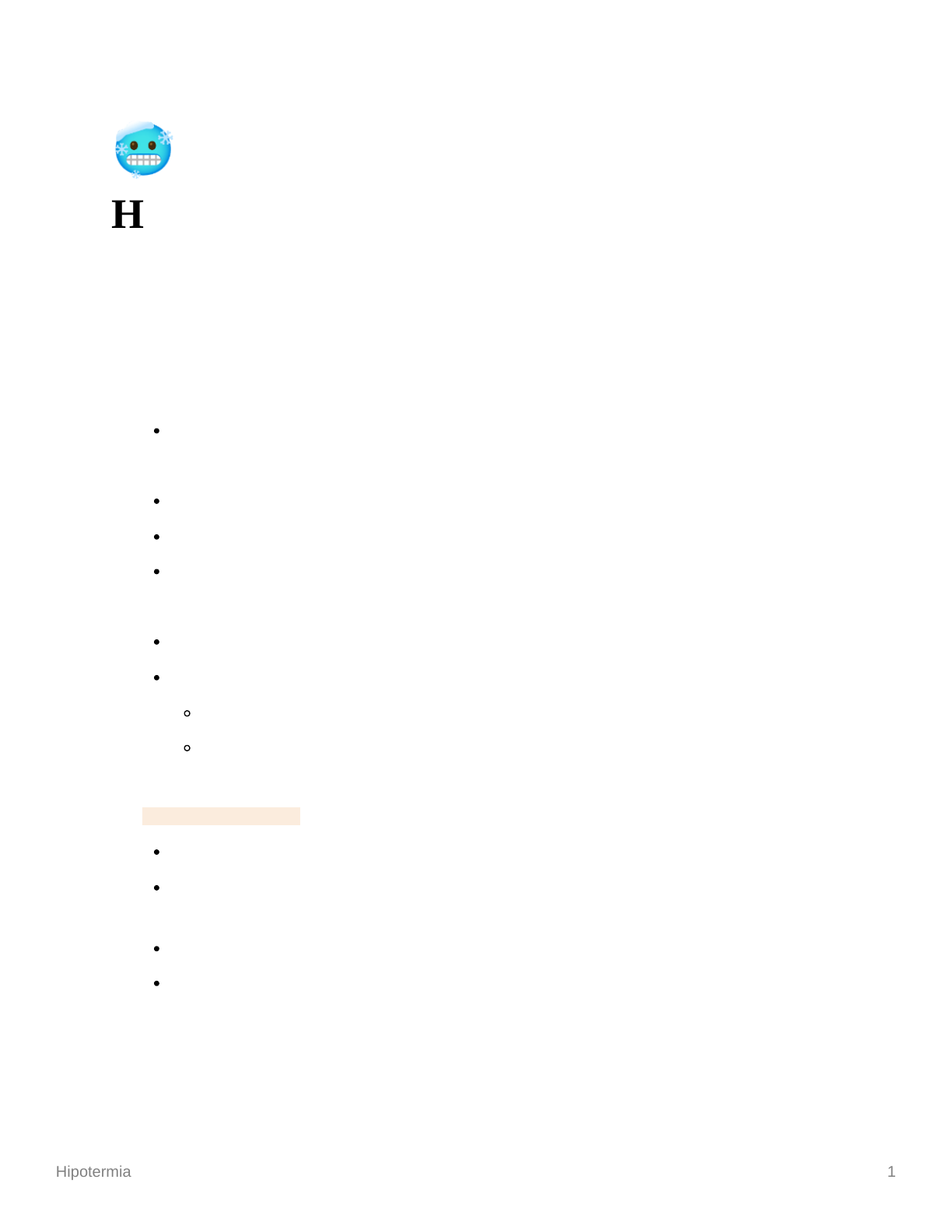 Hipotermia 1 🥶 Hipotermia Causada pela exposição ao frio → A urgência do tratamento dependerá do tempo de exposição e a temperatura corporal da vítima Condutas: 1. Peça ajuda quando julgar necessário Se estiver longe de receber cuidados de saúde comece o reaquecimento ativo 2. Reaquecer a vítima imediatamente Mova-a para um ambiente aquecido Remova roupas molhadas Envolva e cubra todas as superfícies expostas do corpo 3. Reaquecimento ativo NÃO deve atrasar o cuidado definitivo Métodos: Colocar a vítima perto de uma FONTE DE CALOR Colocar recipiente de ÁGUA MORNA em contato com a pele Queimaduras por frio Geralmente afeta partes mais expostas do corpo, como extremidades e nariz Em caso de ULCERAÇÃO remova as roupas molhadas, seque e cubra a vítima para evitar hipotermia Leve a vítima para um centro médico avanaçado NÃO TENTE REAQUECER O CONGELAMENTO se houver chance de congelar de novo ou se estiver perto de um centro médico Reaquicimento de Congelamentos (Frostbite) Hipotermia 2 Congelamento superficiais ou menores ou Frostnip Reaquecimento simples e rápido Uso de contato pele a pele Congelamento profundo ou severo Deve ser reaquecida dentro de 24h após lesão Imergir a parte congelada em água morna por 20 a 30seg → Os aquecedores químicos NÃO DEVEM ser colocados DIRETAMENTE no tecido congelado → Após reaquecimento, esforços devem ser feitos para proteger as partes congeladas de congelamento para evacuar rapidamente o paciente para cuidados posteriores