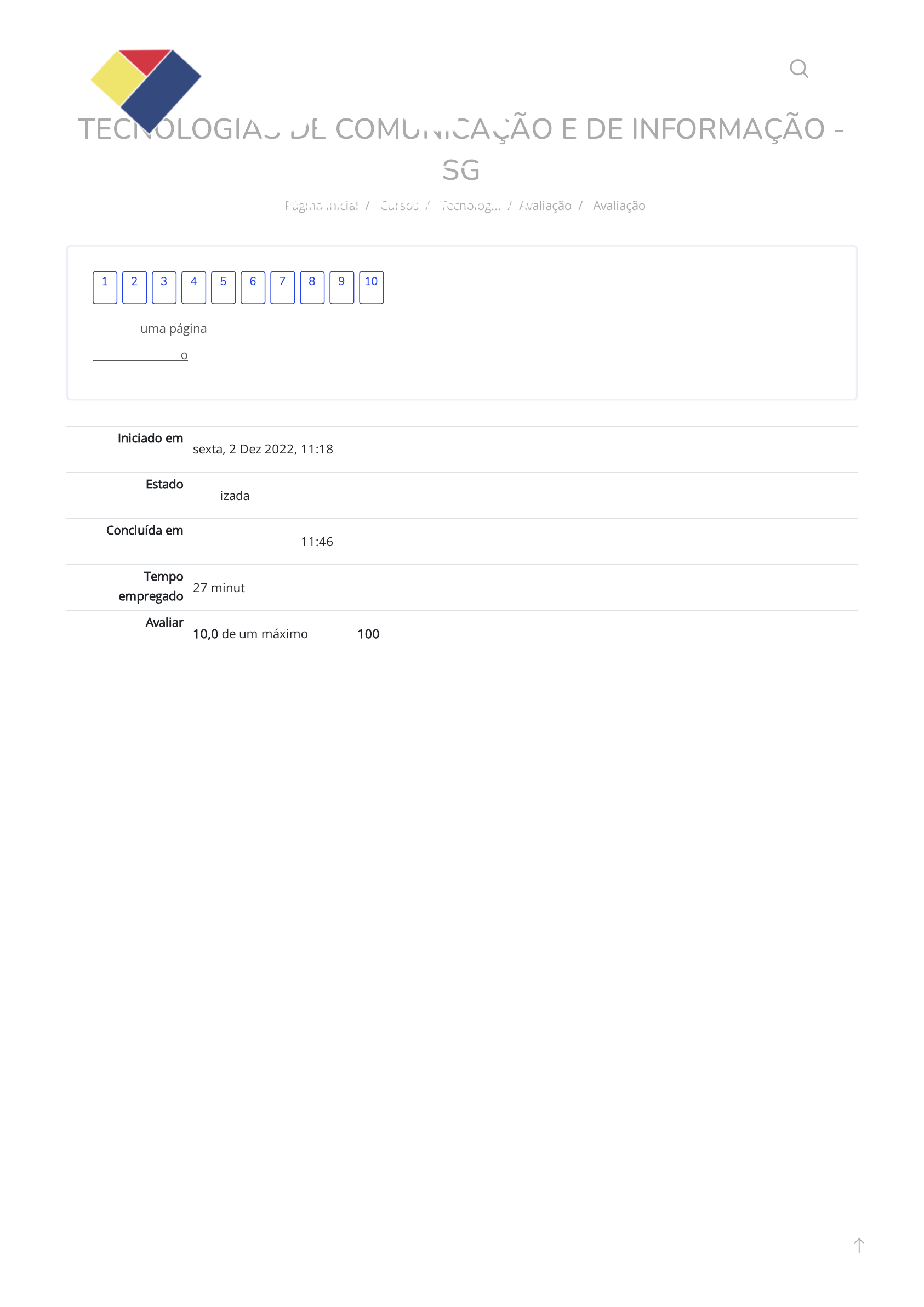 02/12/2022 11:46 Avaliação: Revisão da tentativa https://cpetead.com.br/mod/quiz/review.php?attempt=3289055&cmid=49467 1/10 TECNOLOGIAS DE COMUNICAÇÃO E DE INFORMAÇÃO - SG Página Inicial / Cursos / Tecnolog… / Avaliação / Avaliação Iniciado em sexta, 2 Dez 2022, 11:18 Estado Finalizada Concluída em sexta, 2 Dez 2022, 11:46 Tempo empregado 27 minutos 52 segundos Avaliar 10,0 de um máximo de 10,0(100%) Mostrar uma página por vez Terminar revisão 1 2 3 4 5 6 7 8 9 10 https://cpetead.com.br/ https://cpetead.com.br/course/index.php https://cpetead.com.br/course/view.php?id=2062 https://cpetead.com.br/mod/quiz/view.php?id=49467 https://cpetead.com.br/mod/quiz/review.php?attempt=3289055&cmid=49467&showall=0 https://cpetead.com.br/mod/quiz/view.php?id=49467 https://cpetead.com.br/ 02/12/2022 11:46 Avaliação: Revisão da tentativa https://cpetead.com.br/mod/quiz/review.php?attempt=3289055&cmid=49467 2/10 QUESTÃO Correto Atingiu 1,0 de 1,0 1 Uma das mais tradicionais formas de se utilizar a abordagem sistêmica para desenvolver soluções de sistemas de informação é conhecida como ciclo de vida do desenvolvimento de sistemas, o qual pode ser entendido como um processo repetitivo de múltiplas etapas. Todas as atividades deste ciclo são altamente relacionadas e interdependentes, por isso, várias atividades podem estar ocorrendo ao mesmo tempo, ao passo que algumas atividades dentro de determinado passo podem ser repetidas. Isso signi�ca que tanto usuários como analistas de sistemas podem, a qualquer momento, repetir as atividades prévias para modi�car e melhorar um sistema em desenvolvimento. Analise as alternativas sobre as cinco principais fases do ciclo de desenvolvimento de sistemas e identi�que a CORRETA: Escolha uma opção: a. As fases são fortemente dependentes, ou seja, somente quando as tarefas de determinadas fases terminam é que a equipe de desenvolvimento passa para a próxima fase. b. A fase de implementação gera como resultado um sistema (ou uma versão del funcional e testado de acordo com os requisitos levantados anteriormente. c. O principal objetivo da fase de manutenção de sistemas é desenvolver uma solução de sistemas de informação. d. A codi�cação/desenvolvimento do sistema, realizada na fase de análise de sistemas, é uma das tarefas mais complexas de todo o processo de produção dos sistemas de informação. e. O estudo de viabilidade é um produto gerado pela fase de projeto de sistemas, apresentando o custo-benefício previsto para o sistema a ser desenvolvido. Sua resposta está correta. A resposta correta é: A fase de implementação gera como resultado um sistema (ou uma versão del funcional e testado de acordo com os requisitos levantados anteriormente. 02/12/2022 11:46 Avaliação: Revisão da tentativa https://cpetead.com.br/mod/quiz/review.php?attempt=3289055&cmid=49467 3/10 QUESTÃO Correto Atingiu 1,0 de 1,0 2 O computador pode ser entendido como um sistema de componentes e funções de hardware programado para diversas ações, tais como executar rotinas e gerar resultados de acordo com o solicitado pelos usuários �nais. Sob outro ponto de vista, o computador não é apenas um conjunto de dispositivo eletrônicos responsável por executar tarefas de processamento de informação, mas sim um sistema que envolve componentes inter-relacionados que, por sua vez, executam funções básicas do sistema, como entrada, processamento, saída, armazenamento e controle. Com base nessas funções básicas do sistema, marque a alternativa CORRETA: Escolha uma opção: a. A Unidade Central de Processamento (CPU) é responsável tanto pela função de processamento dos dados quanto pela função de controle nos sistemas de computação. b. A função de entrada objetiva transformar os dados inseridos pelo usuário no sistema em saídas visíveis para os gestores da organização. c. O processamento é sempre realizado pelos dispositivos de saída, os quais possuem sua própria unidade central de processamento (CPU). d. Por padrão, as saídas geradas pelo processamento em sistemas de computação precisam ser obrigatoriamente apresentadas ao usuário �nal em dispositivos como monitores ou impressoras. e. A função de armazenamento de um sistema de computação ocorre exclusivamente nos circuitos da unidade primária de armazenamento do computador. Sua resposta está correta. A resposta correta é: A Unidade Central de Processamento (CPU) é responsável tanto pela função de processamento dos dados quanto pela função de controle nos sistemas de computação. 02/12/2022 11:46 Avaliação: Revisão da tentativa https://cpetead.com.br/mod/quiz/review.php?attempt=3289055&cmid=49467 4/10 QUESTÃO Correto Atingiu 1,0 de 1,0 3 Leia as seguintes a�rmativas: ( A qualidade da imagem da tela depende do tipo de monitor de vídeo usado e da placa de circuito grá�co instalada no computador... ...PORQUE... (2) ...os avanços na tecnologia, como os recursos de matriz ativa e feixe duplo, proporcionam melhoria nas cores e maior nitidez nos monitores de cristal líquido - Liquid Crystal Display (LCD). A respeito dessas duas frases, assinale a alternativa CORRETA. Escolha uma opção: a. A primeira a�rmação é falsa e a segunda é verdadeira. b. As duas a�rmações são falsas. c. As duas a�rmações são verdadeiras e a segunda não justi�ca a primeira. d. As duas a�rmações são verdadeiras e a segunda justi�ca a primeira. e. A primeira a�rmação é verdadeira e a segunda é falsa. Sua resposta está correta. A resposta correta é: As duas a�rmações são verdadeiras e a segunda não justi�ca a primeira. 02/12/2022 11:46 Avaliação: Revisão da tentativa https://cpetead.com.br/mod/quiz/review.php?attempt=3289055&cmid=49467 5/10 QUESTÃO Correto Atingiu 1,0 de 1,0 4 De acordo com o conteúdo apresentado em Dica do Professor, a utilização de recursos tecnológicos nos negócios tem gerado consideráveis i