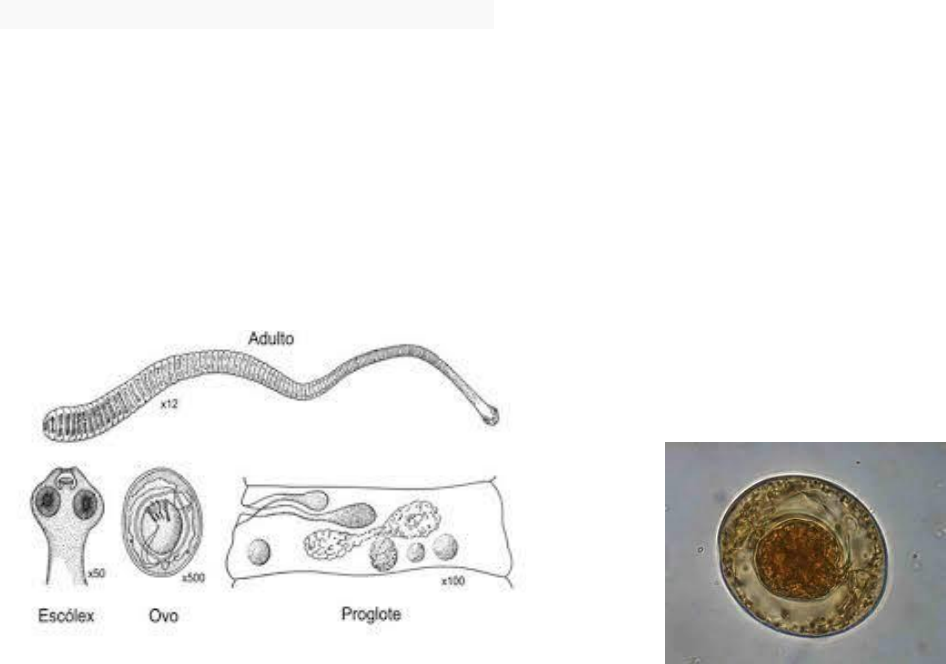 Parasitologia Letícia Iglesias Jejesky Med 106 1 Himenolepíase É uma ANTROPONOSE (exclusivamente humana). Hymenolepis nana Filo: Plathyhelminthes Classe: Cestoda (corpo alongado em forma de fita e segmentado) Ordem: Cyclophillida Família: Hymenolepididae Espécie: Hymenolepis nana Características Gerais Escolex dotado de 4 ventosas e coroa de ganchos – adaptações morfológicas que auxiliam na fixação do parasito na parede do intestino delgado; pode produzir escoriações na parede intestinal que produzem sangramentos. Proglotes mais largas do que longas; O estróbilo tem proglotes; os proglotes grávidos tem ovos e essas proglotes podem sair pelas fezes ou ativamente pelo ânus (quando passam pelo ânus causam prurido anal, mas esse sintoma não é típico dessa doença). Tamanho: 2 a 10 cm de comprimento; Habitat: Intestino delgado humano – os platelmintos cestoda vivem no intestino delgado justamente por não apresentarem aparelho digestivo; eles são incapazes de realizar processos metabólicos, tendo acessos aos nutrientes no intestino humano por meio de difusão. Toda infecção produzida por platelmintos cestoda, ela tem como característica produzir desnutrição, emagrecimento e aumento de apetite. Trata-se de um verme hermafrodita; essa característica permite que eles tenham grande capacidade reprodutiva, fator bastante relevante na dispersão da doença, sobretudo em ambientes coletivos. Sem aparelho digestivo. Ovo tem formato de “chapéu mexicano”; duram em torno de 10 dias no ambiente. No interior do ovo está a larva (oncosfera); o ovo é envolvido pelos filamentos polares. Essas características do ovo são marcantes para o exame parasitológico de fezes. Muitos dos proglotes se rompem dentro do intestino delgado sendo liberados os ovos com formato de chapéu mexicano e dentro desses ovos existe a oncosfera (entre a casca externa e a interna do ovo há filamentos polares; a parte central é a que possui a oncosfera). Isso é uma pista diagnóstica muito importante. Ciclo Biológico H. nana tem hospedeiros paratênicos: besouros e pulgas – eles atuam como disseminadores da verminose; se o ser humano ingere esses insetos contendo a larva (oncosfera) do verme, ele se infecta. Pode ocorrer autoinfecção interna /externa. Cada proglote: 100-200 ovos. Liberação de ovos: 30 dias após infecção Todo ciclo: 1 mês Ciclo monoxênico: o ser humano é o único hospedeiro para esse verme na fase adulta. De dentro do ovo, após ele ser ingerido pelo ser humano, eclode a larva a larva (oncosfera) vai adentrar a mucosa intestinal evolui para larva cisticercóide e irá permanecer por um período de 10 - 12 dias na mucosa do intestino delgado (principalmente na região do jejuno e íleo) após esse período, a larva cisticercóide vai abandonar a mucosa e migrar para o lúmen do intestino delgado (principalmente íleo) a larva cisticercóide se desenvolve e dá origem ao verme adulto vermes adultos não vivem muito tempo, mas estando presentes eles exercem suas atividades espoliativas e reprodutivas. Parasitologia Letícia Iglesias Jejesky Med 106 2 A larva, ao se instalar na mucosa intestinal, produz lesões; essas lesões podem ser mais ou menos importantes, isso vai depender da carga parasitária. Da mesma forma, acontece ação traumática quando a larva cisticercóide migra para o lúmen do intestino. Além disso, o verme adulto possui coroa de ganchos, que produz lesões no epitélio intestinal. Todas essas ações podem gerar ulcerações no intestinal, agravando o quadro clínico. Em geral, essas ulcerações só ocorrem se a carga parasitária for alta. Informação importante! Os ovos que ficarem retidos no intestino do indivíduo não sendo eliminados junto com as fezes, eles podem liberar as oncosferas. Liberando as oncosferas ainda dentro do intestino, elas farão o ciclo biológico normal, acontecendo uma autoinfecção interna. Isso aumenta consideravelmente a carga parasitária. Autoinfecção externa: o indivíduo que tem maus hábitos de higiene, objetos que crianças levam à boca, etc; geram autoinfecção externa. Ou seja, o indivíduo eliminou os ovos do organismo dele e os ovos retornam para ele através desses meios. Heteroinfecção: indivíduo dispersa ovos no ambiente e esses ovos serão ingeridos por outros indivíduos. Hospedeiro paratênico é outra forma de infecção. Patogenia A infecção é maior em crianças que em adultos: a resistência aumenta depois da puberdade. Distúrbios gastrintestinais: carga parasitária alta; crianças menores de 10 anos: Emagrecimento Congestão e ulcerações da mucosa; Diarreia, dor abdominal, náuseas e vômitos – causados por resíduos tóxicos metabólicos desse verme e o próprio processo inflamatório. Esse verme produz ação traumática e ação inflamatória. A inflamação vai gerar edema – com edema, há má absorção intestinal – dessa forma, o indivíduo perde peso – desnutrição. Pode ter anemia por conta da desnutrição e do sangramento nas fezes. Diagnóstico Clínico: através da sintomatologia e anamnese. Laboratorial: parasitológico de fezes ‐ ovos nas fezes. Parasitologia Letícia Iglesias Jejesky Med 106 3 Tratamento Praziquantel: dose única (25 mg/kg de peso). Niclosamida: dose única de 2 gramas. Obs.: Repetir o tratamento mais 1 ou 2 vezes com 2 semanas de intervalo. O tratamento repete porque na fase larvária o medicamento não altera a vida dele; administrar novamente para matar os adultos. Esses remédios não matam ovos e nem larvas, só adultos. Profilaxia Diagnosticar e tratar todos os parasitados Implementar quimioprofilaxia familiar Higienizar frutas, verduras e legumes antes do consumo Higienizar as mãos após o uso do sanitário e antes das refeições Descartar corretamente fraldas Cuidados com a higiene em ambientes coletivos como creches, etc. Adotar medidas de sanitização. Controle de insetos como besouros e pulgas.