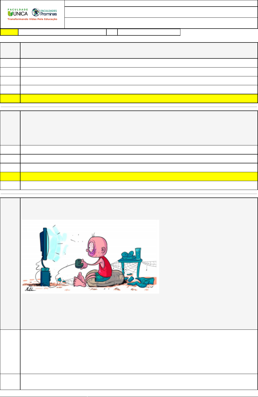 28/11/2022 15:50:02 1/4 REVISÃO DE SIMULADO Nome: WANDERSON MARINHO DA SILVA Disciplina: História da Educação Física Respostas corretas são marcadas em amarelo X Respostas marcardas por você. Questão 001 Nas lojas de aplicativos para smartphones, é possível encontrar aplicativos fitness para monitoramento de atividade física, em qual categoria abaixo? A) Utilitários. X B) Medicina. C) Entretenimento. D) Educação. E) Saúde e atividade física. Questão 002 (IBADE – Pref. de Linhares/ES – 2020) De acordo com o American College of Sports Medicine (ACSM- 2016), o conjunto de atributos ou características que um indivíduo tem ou alcança e que se relaciona com sua habilidade de realizar uma atividade física é definido como: A) exercício. X B) atividade física. C) equivalente metabólico. D) aptidão física. E) habilidade física. Questão 003 (OMINI / Adaptada – Pref. de Miguelópolis/SP – 2021) Games na pandemia Psicólogos apontam os riscos potencializados pelo distanciamento social, mas também fazem ponderações: não é o caso de "demonizar" os jogos virtuais. Disponível em: https://gauchazh.clicrbs.com.br/comportamento/noticia /2020/10/games- na pandemia-seu-filho-esta-jogando-em-excesso-veja-o-que-dizem-especialistas ckgi201ad000c015xwgncrzy2.html. Acesso em 08/06/2021 Figura 1. Perda do sono por conta dos jogos. (CHARGE..., 2018) Sobre os jogos eletrônicos, é correto afirmar: X A) Bem como em outros tipos de jogos, os jogos eletrônicos podem dificultar o desenvolvimento do pensamento lógico e rápido, resolução de problemas, concentração, trabalho em equipe, observação, melhora a coordenação motora e desenvolve a capacidade de tolerância a frustrações. Dessa forma, essas habilidades dificultadas no ambiente online podem se refletir em seu cotidiano do dia a dia, sendo esse um dos perigos dos jogos eletrônicos. B) Além da distração fornecida pelos jogos eletrônicos, alguns games são falsamente criados para a educação, já que isso não existe. 28/11/2022 15:50:02 2/4 C) Mesmo com o direcionamento do professor os jogos eletrônicos não podem trazer benefícios reais de conhecimento uma vez que não são ferramentas pedagógicas. D) Gaming disorder ou transtorno dos jogos eletrônicos não foi incluído no lançamento da Classificação Internacional de Doenças (CID-11) pela Organização Mundial da Saúde (OMS). E) A influência que os jogos eletrônicos exercem sobre as pessoas podem ser positivas quando se pensa em aprendizado e desenvolvimento de estímulos cognitivos, como negativa observado em problemas de saúde como sedentarismo, cansaço físico e mental e também no vício. Com a situação atual da Covid, a influência me meio a sociedade atual é ainda maior, já que são considerados uma forma de “fuga social”. Questão 004 (FEPESE — 2021). No contexto atual, a escola tradicional ficará cada vez mais sem sentido, pois vivemos em um conflito entre duas realidades que torna a escola um “ambiente chato”: do lado de fora a tecnologia e a interatividade e do lado de dentro o processo de aprendizagem de modo vertical. Nesse sentido, o xadrez, como uma estratégia de aprendizagem, pode trazer conceitos e ideias do jogo para o mundo real, favorecendo e incentivando a realização de outras tarefas ou desafios. Assinale a alternativa correta considerando os elementos utilizados no processo ensino- aprendizagem do xadrez. X A) Quando jogamos, nos sentimos desafiados, mesmo sendo derrotado o aluno é estimulado a continuar. B) A gamificação do ensino não está presente no jogo de xadrez. C) Um fator essencial em um ambiente que favorece a inovação, já que correr risco e cometer erros fazem parte do processo de criação. D) O conteúdo didático passa a fazer mais sentido e torna-se lúdico, já que os alunos precisam usar a criatividade para resolver situações – problema. E) No xadrez, todos participam e pensam juntos sobre como vão vencer os desafios apresentados em situação real de jogo. Questão 005 (QUADRIX — 2016 — Adaptada). Quando o assunto são novas tecnologias, qual nova tecnologia refere-se a um extenso conjunto de pontos utilizados para acessar aplicativos e informações ou para interagir com pessoas, redes sociais (...), incluindo dispositivos móveis, wearables (tecnologias para vestir), aparelhos eletrônicos de consumo e domésticos, dispositivos automotivos e ambientais – tais como os sensores da Internet das Coisas (IoT)? A) Malha de dispositivos. B) Impressão 3D. X C) Relação ambiente – usuário. D) Agentes e equipamentos autônomos. E) Aprendizagem avançada de máquinas. 28/11/2022 15:50:02 3/4 Questão 006 (FURB — 2018). A gamificação é uma estratégia de ensino utilizada para despertar o interesse dos alunos nas atividades propostas e que está grande em evidência nos últimos anos. Marque com V as proposições verdadeiras e com F as falsas, sobre os aspectos da gamificação. ( ) Consiste em utilizar recursos de jogos na educação, como forma de estímulo para a participação dos estudantes nas atividades propostas pelos professores. ( ) É eficaz em todos os casos em que é aplicada, independente da faixa etária dos alunos. ( ) Deve explorar a competitividade dos alunos de forma saudável, motivando os alunos a superarem estágios no processo de aprendizagem. ( ) Um grande estímulo da gamificação é o sentimento de conquista dos alunos, pois quando terminada uma determinada etapa da atividade proposta, será despertado o interesse para as próximas etapas propostas. Assinale a alternativa que contém a sequência correta para as proposições acima: A) V – F – F – V X B) F – V – F – F C) V – F – V – F D) V – F – V – V E) F – V – V – F Questão 007 (AMAUC – Pref. de Seara/SC – 2018) Segundo Gaspar e Barbosa (2006), "há algum tempo, era muito comum nas cidades, as crianças brincarem e jogarem na frente das suas casas, nas c