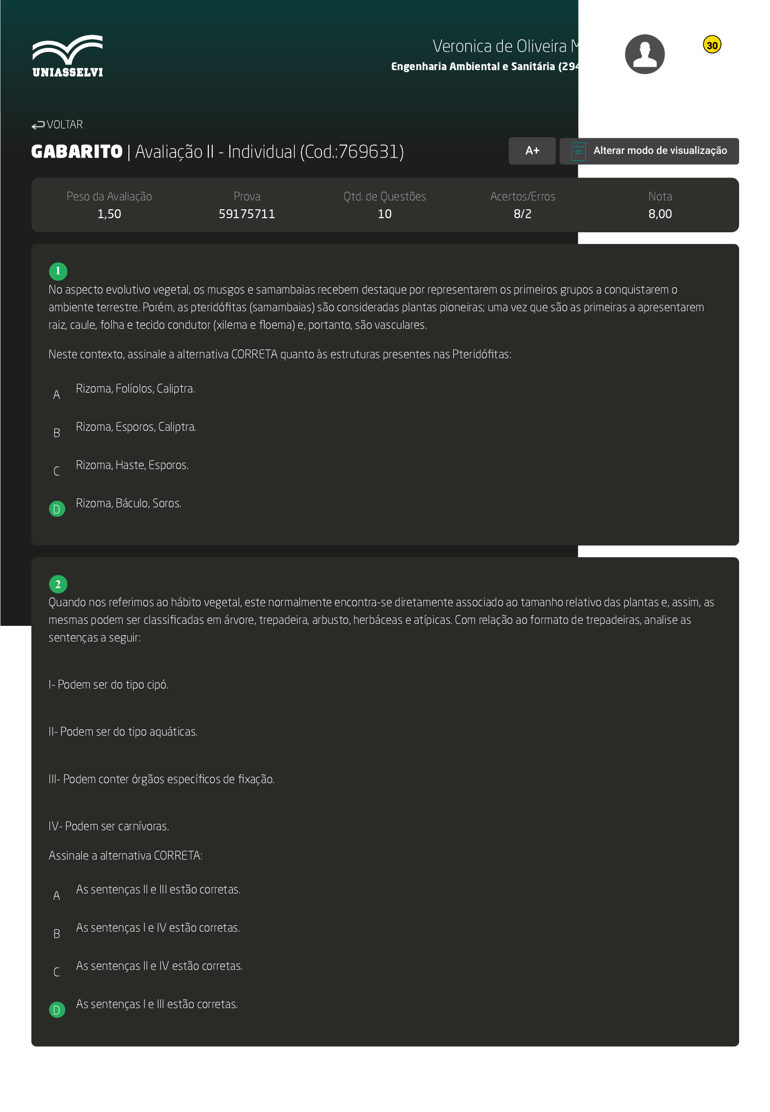 07/12/2022 20:32 AVA https://ava2.uniasselvi.com.br/subject/grades-and-tests/answer-book/eyJ0ZXN0Ijp7InRlc3RDb2RlIjoiNzY5NjMxIiwiZGVzY3JpcHRpb24iOiJBdmFsaWHDp8OjbyBJSSAtIEluZGl2aWR1YWwiLCJwYXJhbWV0ZXIiOjU0… 1/6 GABARITO | Avaliação II - Individual (Cod.:769631) Peso da Avaliação 1,50 Prova 59175711 Qtd. de Questões 10 Acertos/Erros 8/2 Nota 8,00 No aspecto evolutivo vegetal, os musgos e samambaias recebem destaque por representarem os primeiros grupos a conquistarem o ambiente terrestre. Porém, as pteridófitas (samambaias) são consideradas plantas pioneiras; uma vez que são as primeiras a apresentarem raiz, caule, folha e tecido condutor (xilema e floema) e, portanto, são vasculares. Neste contexto, assinale a alternativa CORRETA quanto às estruturas presentes nas Pteridófitas: A Rizoma, Folíolos, Caliptra. B Rizoma, Esporos, Caliptra. C Rizoma, Haste, Esporos. D Rizoma, Báculo, Soros. Quando nos referimos ao hábito vegetal, este normalmente encontra-se diretamente associado ao tamanho relativo das plantas e, assim, as mesmas podem ser classificadas em árvore, trepadeira, arbusto, herbáceas e atípicas. Com relação ao formato de trepadeiras, analise as sentenças a seguir: I- Podem ser do tipo cipó. II- Podem ser do tipo aquáticas. III- Podem conter órgãos específicos de fixação. IV- Podem ser carnívoras. Assinale a alternativa CORRETA: A As sentenças II e III estão corretas. B As sentenças I e IV estão corretas. C As sentenças II e IV estão corretas. D As sentenças I e III estão corretas. VOLTAR A+ Alterar modo de visualização 1 2 Veronica de Oliveira Matte Engenharia Ambiental e Sanitária (2944880) 30 07/12/2022 20:32 AVA https://ava2.uniasselvi.com.br/subject/grades-and-tests/answer-book/eyJ0ZXN0Ijp7InRlc3RDb2RlIjoiNzY5NjMxIiwiZGVzY3JpcHRpb24iOiJBdmFsaWHDp8OjbyBJSSAtIEluZGl2aWR1YWwiLCJwYXJhbWV0ZXIiOjU0… 2/6 As plantas evoluíram para poderem conquistar o ambiente terrestre; porém, no grupo das Pteridófitas, ainda são dependentes da água para completarem o seu ciclo de vida. Este ciclo ocorre com a chamada alternância de gerações. Sobre o ciclo de vida das pteridófitas, com relação aos eventos a partir da fecundação, ordene os itens a seguir: I- Fecundação. II- Meiose. III- Gametófito. IV- Zigoto. V- Esporófito. Assinale a alternativa que apresenta a sequência CORRETA: A II - III - I - IV - V. B I - IV - V - II - III. C I - II - IV - III - V. D I - III - V - IV - II. As briófitas são plantas simples, que não possuem raiz verdadeira; porém, muitas apresentam estruturas frágeis que permitem a sua fixação junto ao solo. Nesse sentido, avalie as asserções a seguir e a relação proposta entre elas: I- As briófitas são de tamanho reduzido. PORQUE II- Seus vasos condutores são muito primitivos e ineficientes na condução de nutrientes. Assinale a alternativa CORRETA: A A primeira asserção é uma proposição falsa, e a segunda, uma proposição verdadeira. B As duas asserções são proposições verdadeiras, mas a segunda não é uma justificativa correta da primeira. C As duas asserções são proposições verdadeiras, e a segunda é uma justificativa correta da primeira. D A primeira asserção é uma proposição verdadeira, e a segunda, uma proposição falsa. 3 4 Veronica de Oliveira Matte Engenharia Ambiental e Sanitária (2944880) 30 07/12/2022 20:32 AVA https://ava2.uniasselvi.com.br/subject/grades-and-tests/answer-book/eyJ0ZXN0Ijp7InRlc3RDb2RlIjoiNzY5NjMxIiwiZGVzY3JpcHRpb24iOiJBdmFsaWHDp8OjbyBJSSAtIEluZGl2aWR1YWwiLCJwYXJhbWV0ZXIiOjU0… 3/6 Nas gimnospermas há o desenvolvimento de tecidos vasculares primários. A raiz e o caule destas plantas possuem uma região medular, chamada de cilindro central ou estelo, que é constituída de tecido fundamental. A organização do estelo pode ser denominada de protostelo, sifonostelo e eustelo. Sobre o exposto, associe os itens, utilizando o código a seguir: I- Traqueídes. II- Protostelo. III- Eustelo. ( ) É um cilindro vascular primário constituído de feixes isolados em torno de uma medula, encontrados na maioria das plantas vasculares com sementes ( ) São as formas mais primitivas do processo de condução e sustentação. ( ) É um cilindro sólido de tecidos vasculares; o xilema se localiza disperso dentro dele, e o floema circundando. Assinale a alternativa que apresenta a sequência CORRETA: A II - I - III. B III - II - I. C III - I - II. D II - III - I. Os vacúolos representam grandes cavidades existentes no interior do citoplasma vegetal, e podem ocupar até 90% do volume em células adultas, sendo a sua composição a base de água. Com relação aos vacúolos, analise as sentenças a seguir: I- Contêm sais minerais, açúcares e algumas proteínas. II- Possuem pH alcalino, conferindo o sabor adstringente. III- Podem acumular pigmentos. IV- São responsáveis pela realização da fotossíntese. Assinale a alternativa CORRETA: A As sentenças II e III estão corretas. B As sentenças I e III estão corretas. C As sentenças I e II estão corretas. D As sentenças II e IV estão corretas. 5 6 Veronica de Oliveira Matte Engenharia Ambiental e Sanitária (2944880) 30 07/12/2022 20:32 AVA https://ava2.uniasselvi.com.br/subject/grades-and-tests/answer-book/eyJ0ZXN0Ijp7InRlc3RDb2RlIjoiNzY5NjMxIiwiZGVzY3JpcHRpb24iOiJBdmFsaWHDp8OjbyBJSSAtIEluZGl2aWR1YWwiLCJwYXJhbWV0ZXIiOjU0… 4/6 As células vegetais evoluíram para a realização de funções específicas inexistentes nas células animais. Assim, há organelas específicas que só são encontradas nas células das plantas. Dentre estas estruturas celulares vegetais, podemos citar a parede celular, os vacúolos e os cloroplastos. Sobre as organelas citoplasmáticas vegetais específicas, associe os itens, utilizando o código a seguir: I- Cloroplasto. II- Vacúolo. III- Parede celular. ( ) Determina a forma e função celular. ( ) É composto por água. ( ) Apresentam tilacoides. ( ) Estruturas para realizaç