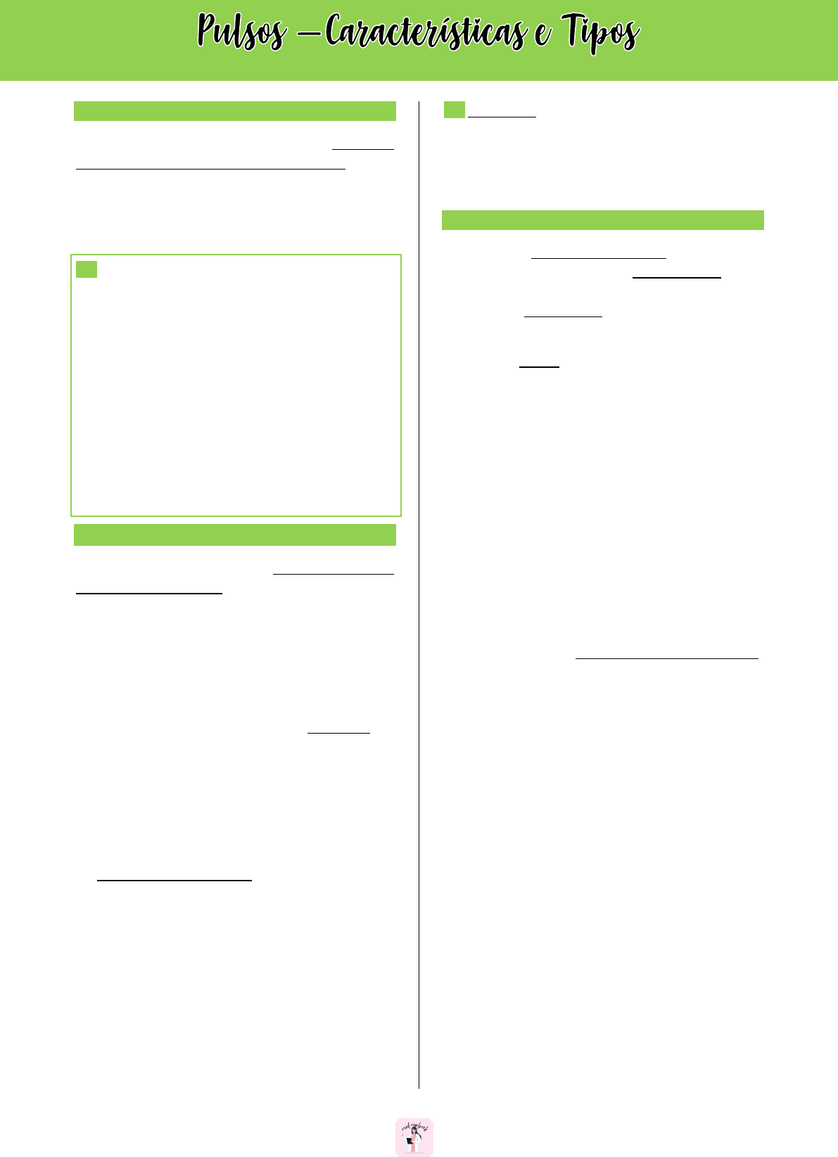 1 Júlia Morbeck – @med.morbeck ESTADO DA PAREDE ARTERIAL ↠ Em condições normais, percebe-se uma parede lisa, sem tortuosidades e que se deprime facilmente. Quando se nota uma parede vascular endurecida, irregular e tortuosa, às vezes comparada a “traqueia de passarinho”, é sinal de uma vasculopatia que se denomina genericamente de arteriosclerose. OBS.: No caso da artéria radial, a afecção que a torna dura e tortuosa é a mediosclerose de Mönckeberg, que não deve ser confundida com a aterosclerose. São duas patologias distintas, sem qualquer relação entre uma e outra, cumprindo ressaltar que mediosclerose na radial não indica aterosclerose em outras artérias (coronárias e cerebrais, por exemplo). A mediosclerose de Mönckeberg é uma esclerose da camada média das artérias de médio calibre, principalmente braquiais, radiais, ulnares, femorais, tibiais, uterinas e dos órgãos genitais que pode culminar em calcificação. Era uma afecção considerada sem importância clínica por não se acompanhar de redução da luz do vaso. Contudo, tem sido considerada como responsável pelo registro de pseudo-hipertensão arterial em pessoas idosas. Por isso, quando se observa uma artéria radial endurecida, deve-se valorizar este achado para interpretar corretamente os valores da pressão arterial. FREQUÊNCIA ↠ É necessário contar sempre o número de pulsações durante um minuto inteiro, comparando-se estes valores com o número de batimentos cardíacos. ↠ A frequência do pulso varia com a idade e com diversas outras condições fisiológicas. Em pessoas adultas, considera-se normal a frequência de 60 a 100 bpm, em repouso. ↠ Acima de 100 pulsações designa-se taquisfigmia ou, como é mais usado na linguagem comum, taquicardia. Em várias condições fisiológicas, como exercício, emoção e gravidez, ocorre taquicardia, a qual pode ser observada também em estados febris, hipertireoidismo, insuficiência cardíaca, taquicardia paroxística, miocardite, colapso periférico e hipovolemia. ↠ Bradisfigmia ou bradicardia significa menos de 60 pulsações por minuto. Não é raro tal achado em pessoas saudáveis, especialmente atletas, contudo a bradicardia costuma indicar anormalidade cardíaca ou extracardíaca. Entre as causas extracardíacas estão algumas enfermidades infecciosas (febre tifoide e viroses), hipertensão intracraniana e icterícia. As causas principais de bradicardia são as afecções cardíacas com lesões do sistema excitocondutor, seja por comprometimento do nó sinoatrial (bradicardia sinusal), seja por transtorno na condução do estímulo (bloqueio atrioventricular). OBS.: Déficit de pulso - Significa que o número de batimentos cardíacos é maior que o número das pulsações na artéria radial. Decorre do fato de algumas contrações ventriculares serem ineficazes, ou seja, não impulsionarem sangue para a aorta e, ipso facto, não determinarem onda de pulso. A extrassistolia ventricular e a fibrilação atrial constituem as principais causas de déficit de pulso. RITMO ↠ É dado pela sequência das pulsações. Se elas ocorrem a intervalos iguais, diz-se que o ritmo é regular. Se os intervalos são variáveis – ora mais longos ora mais curtos –, trata-se de ritmo irregular. ↠ A irregularidade do pulso indica alteração do ritmo cardíaco – arritmia –, que pode ser fisiológica ou patológica. ↠ As principais arritmias são: arritmia sinusal, extrassistolia, fibrilação atrial e bloqueio cardíaco. Arritmia sinusal: Consiste na alternância de pulsações, ora mais rápidas ora mais lentas, variações essas quase sempre relacionadas com a respiração. Na inspiração, as pulsações sucedem-se mais rapidamente, enquanto, na expiração, ocorre o contrário. A arritmia sinusal é comum e mais intensa em crianças e adolescentes, sendo, portanto, um fenômeno fisiológico na maioria dos casos. Extrassistolia: É a arritmia mais comum, e não indica, obrigatoriamente, a presença de lesão cardíaca. O que se nota no pulso radial são falhas na sequência das pulsações; em outras palavras, não são as contrações extras que mais chamam a atenção do examinador; na verdade, o que se percebe são as pausas compensadoras que se seguem às contrações prematuras. As extrassístoles propriamente costumam ser imperceptíveis no pulso porque, se ocorrem antes de o coração estar cheio de sangue, não se acompanham, obviamente, de uma onda no pulso. Todavia, às vezes, pode-se perceber uma pulsação prematura, quase sempre de pequena amplitude, que corresponde à contração extrassistólica.. FIBRILAÇÃO ATRIAL: Nesta arritmia, chama a atenção do examinador a completa e constante irregularidade do pulso. Os intervalos entre as pulsações variam de uma para a outra, e a amplitude das ondas modifica-se a todo momento. Esta arritmia não deve ser confundida com a arritmia sinusal ou com extrassístoles frequentes. Na vigência de fibrilação atrial, costuma-se observar déficit de pulso, principalmente quando a frequência cardíaca é alta. 2 Júlia Morbeck – @med.morbeck BLOQUEIO CARDÍACO: O bloqueio atrioventricular que determina irregularidade do pulso é o de segundo grau. AMPLITUDE OU MAGNITUDE ↠ Esta característica é avaliada pela sensação captada em cada pulsação e está diretamente relacionada com o grau de enchimento da artéria durante a sístole e seu esvaziamento durante a diástole. ↠ Quanto à amplitude, classifica-se o pulso em amplo, mediano e pequeno. Bom exemplo de pulso amplo é o da insuficiência aórtica. Na estenose aórtica, observa-se o contrário, ou seja, o pulso é pequeno. Na hipotensão arterial, a amplitude do pulso também é pequena, podendo ser quase imperceptível. TENSÃO OU DUREZA ↠ Avalia-se a tensão ou dureza do pulso pela compressão progressiva da artéria. Se a pressão necessária para interromper as pulsações for pequena, caracteriza-se o pulso mole. 