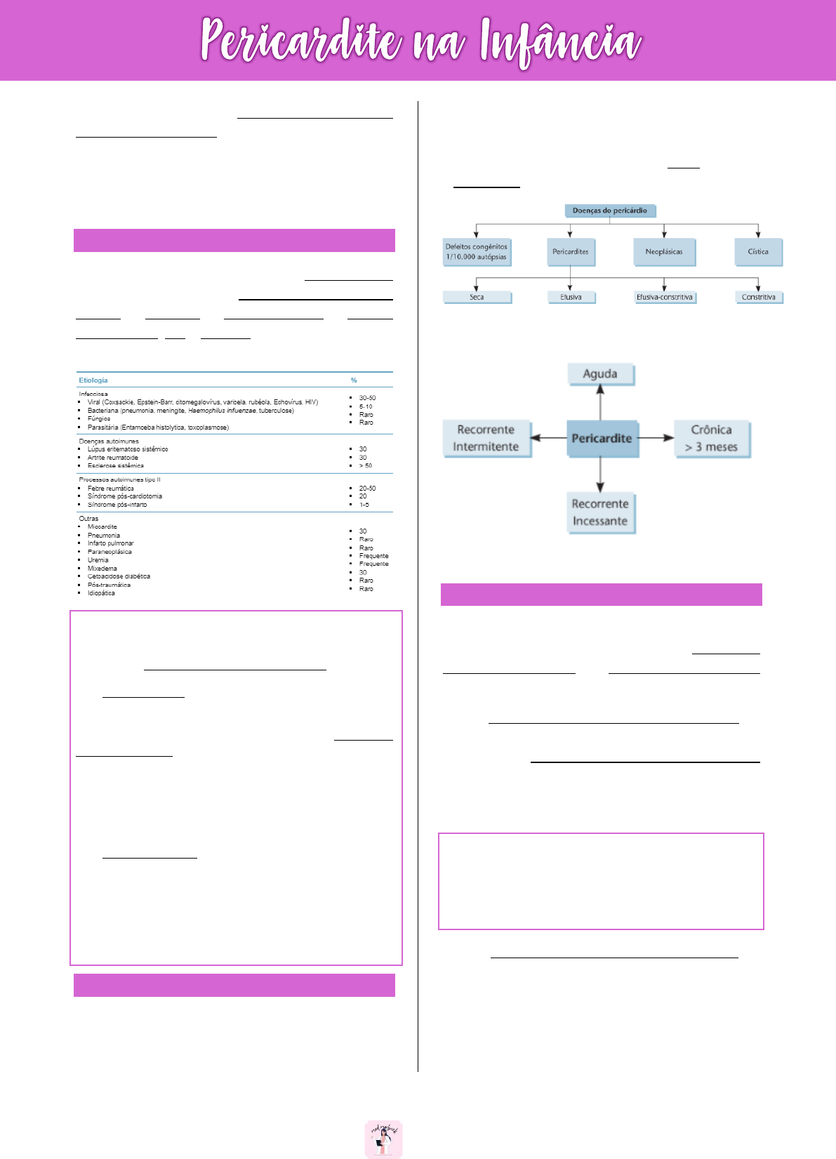 1 Júlia Morbeck – @med.morbeck ↠ Inflamação do pericárdio acometendo as membranas que envolvem o coração. A incidência estimada é de 3,3 casos/100.000 pessoas por ano e é responsável por cerca de 5% dos pacientes com queixa de dor torácica. Não existem dados epidemiológicos em crianças e adolescentes (JANETE; WAGENFUHR; FORONDA, 2021). Etiologia ↠ A pericardite em crianças tem uma etiologia variada. As principais causas são: pós-operatório de cirurgia cardíaca, neoplasias, doenças renais, doenças reumatológicas, viral e idiopática (JANETE; WAGENFUHR; FORONDA, 2021). CAUSAS ↠ As infecções virais provavelmente constituem a causa mais comum de pericardite, particularmente no primeiro ano de vida (PARK, 2015). ↠ A doença reumática aguda constitui causa comum de pericardite, especialmente em certas partes do mundo (PARK, 2015). ↠ A infecção bacteriana (pericardite purulenta) é uma forma rara e grave de pericardite. Os agentes comumente encontrados são S. aureus, Streptococcus pneumoniae, Haemophilus influenzae, Neisseria meningitidis e estreptococos (PARK, 2015). ↠ A tuberculose constitui causa ocasional de pericardite constritiva e apresenta um início insidioso (PARK, 2015). ↠ A doença do colágeno, como, por exemplo, a artrite reumatoide pode provocar pericardite (PARK, 2015). ↠ A pericardite pode constituir uma complicação da doença oncológica ou do seu tratamento, incluindo a radioterapia (PARK, 2015). ↠ A uremia (pericardite urêmica) constitui uma causa rara (PARK, 2015). Classificação ↠ A pericardite tem várias causas e pode se apresentar de diversas formas. Pode ser uma doença primária ou secundária, geralmente benigna e autolimitada. A principal complicação é o derrame pericárdico, que pode levar à morbidade (JANETE; WAGENFUHR; FORONDA, 2021). ↠ Pode ser classificada de acordo com o tipo ou quanto à sua duração (JANETE; WAGENFUHR; FORONDA, 2021). Fisiopatologia ↠ A patogênese dos sinais e sintomas do derrame pericárdico é determinada por dois fatores: a velocidade do acúmulo de líquidos e a competência do miocárdio (PARK, 2015). ↠ Um acúmulo rápido de uma grande quantidade de líquido pericárdico produz distúrbios circulatórios mais graves. Um acúmulo lento de uma quantidade relativamente pequena de líquido pode resultar em graves distúrbios circulatórios (tamponamento cardíaco) se a extensão da miocardite for significante (PARK, 2015). Com o desenvolvimento do tamponamento pericárdico, vários mecanismos compensatórios são deflagrados, incluindo constrição venosa sistêmica e a pulmonar para melhorar o enchimento diastólico, um aumento da resistência vascular sistêmica, para elevar a pressão sanguínea em queda, e taquicardia para melhorar o débito cardíaco (PARK, 2015). ↠ Um acúmulo lento de uma grande quantidade de líquido pode ser acomodado pelo estiramento do pericárdio se o miocárdio estiver intacto (PARK, 2015). Classificação da pericardite quanto ao seu tipo. Classificação da pericardite quanto à sua duração. 2 Júlia Morbeck – @med.morbeck Manifestações Clínicas Crianças com pericardite não complicada frequentemente se apresentam assintomáticas ou oligossintomáticas. As manifestações clínicas são decorrentes de 3 fisiopatologias: inflamação do pericárdio gerando dor torácica e febre; derrame pericárdico podendo levar ao tamponamento cardíaco; e espessamento, retração e calcificação do pericárdio configurando a pericardite constritiva (LOUREIRO; SILVA, 2019). ↠ As manifestações da pericardite são variáveis. A pericardite aguda costuma apresentar os sinais e sintomas mais evidentes de pericardite, podendo ter um quadro febril acompanhado de dor retroesternal ou precordial e mialgia. No exame se observam taquicardia e atrito pericárdico. Pode ocorrer abafamento das bulhas cardíacas (JANETE; WAGENFUHR; FORONDA, 2021). ↠ O pulso paradoxal pode estar presente e consiste em uma exacerbação da redução fisiológica da pressão arterial sistólica durante a inspiração. Quando extremo, o pulso desaparece durante a inspiração e pode ser percebido em qualquer artéria. Em situações menos intensas, o pulso apenas diminui de intensidade e é mais bem observado em uma grande artéria. Nesses casos, a palpação da artéria femoral pode facilitar a percepção do pulso paradoxal (JANETE; WAGENFUHR; FORONDA, 2021). ↠ Na presença de hipotensão arterial grave, arritmias cardíacas, respiração rápida e superficial, raramente o pulso paradoxal é verificado (JANETE; WAGENFUHR; FORONDA, 2021). O pulso paradoxal pode ser quantificado por meio do esfigmomanômetro. Raramente a redução fisiológica da pressão arterial sistólica excede 10 mmHg. Quando esse limite é ultrapassado, o pulso paradoxal está presente. O registro da pressão sistólica deve ser obtido no final da inspiração e expiração (JANETE; WAGENFUHR; FORONDA, 2021). ↠ O pinçamento (estreitamento) da pressão arterial, ou seja, a diferença entre a pressão arterial sistólica e a diastólica, será menor ou igual a 20 mmHg, caracterizando a pressão arterial convergente. Consiste em um sinal clínico de gravidade e de possível tamponamento cardíaco (JANETE; WAGENFUHR; FORONDA, 2021). Anamnese e Exame Físico A síndrome pericárdica pode se apresentar de distintas formas, devendo fazer parte da investigação nos casos de dor retroesternal, crianças com doenças oncológicas, renais e reumatológicas. Também deve ser investigada nos casos de pós-operatório cardíaco, em especial no pós-operatório de comunicação interatrial. A grande preocupação decorre da evolução com derrame pericárdico, principalmente na pericardite aguda, em que a formação de derrame pode ocorrer rapidamente e levar a tamponamento cardíaco (JANETE; WAGENFUHR; FORONDA, 2021). HISTÓRIA ↠ O paciente pode apresentar uma história de infecção do trato respiratório sup