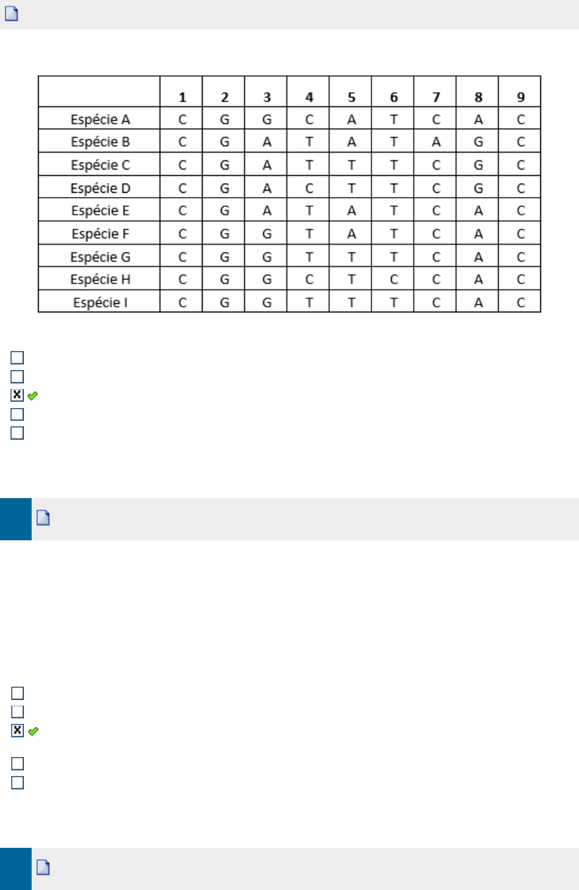 Ref.: 6069794 Pontos: 1,00 / 1,00 O quadro a seguir mostra uma matriz de dados táxons x caracteres, sendo apresentados 9 espécies (de A ao I) e 9 caracteres (de 1 ao 9): Fornecida a matriz de dados acima, qual a distância genética entre a espécie A e C? 0,9 1 0,44 0,2 0,6 2. Ref.: 6069792 Pontos: 1,00 / 1,00 A construção da árvore filogenética começa no tempo atual e vai estimando as relações no tempo passado. Os fósseis servem como retratos de um período da evolução e fornecem importantíssimas compreensões. Numa árvore filogenética, o fóssil é representado por um ramo em que seu ponto terminal está numa idade anterior a atual. Todas as espécies vivas, entretanto, terminam alinhadas na parte mais extrema do gráfico, representando a idade atual. Para a construção de uma árvore uma metodologia empregada é a máxima parcimônia. Assim, uma matriz de táxon/caracter produz uma única árvore parcimoniosa de comprimento 43. A que se refere o número 43? É a maior probabilidade de uma árvore ser escolhida. É o número de clados da árvore mais parcimoniosa. É o número de mudanças de estado do caractere necessárias para explicar todos os dados na árvore. É o número de caracteres previamente escolhidos. É a probabilidade posterior de uma árvore ser escolhida. 3. Ref.: 6069487 Pontos: 0,00 / 1,00 O estudo da classificação e evolução dos organismos é um dos principais assuntos da Biologia moderna. Isso tudo graças aos conceitos de Darwin e Wallace, no século XIX, e a metodologia de Hennig, no século XX. Sobre esse assunto podemos dizer que atualmente os cientistas procuram agrupar os organismos que possuem? javascript:alert('C%C3%B3digo%20da%20quest%C3%A3o:%206069792.'); javascript:alert('C%C3%B3digo%20da%20quest%C3%A3o:%206069487.'); Descendentes de linhagens modernas Ancestral comum e todos os descendentes Linhagem ancestral polifilética Hábitats amórficos Morfologias com funções descentralizadas 02925 - NCBI E ALINHAMENTO DE SEQUÊNCIAS 4. Ref.: 6045362 Pontos: 0,00 / 1,00 O programa BLAST é uma ferramenta disponível em vários bancos de dados como uma opção de busca. O portal do NCBI também conta com essa opção para que o usuário possa fazer buscas em bancos como GenBank e RefSeq. Qual tipo de dado biológico é usado pelo BLAST em suas execuções? Sequências de nucleotídeos ou aminoácidos. Artigos científicos. Número da atividade enzimática de proteínas. Anotação de função de proteínas. Estrutura tridimensional de proteínas. 5. Ref.: 6045575 Pontos: 0,00 / 1,00 Sobre a figura abaixo, é correto afirmar que: Fonte: LarsonGCD/Wikimedia.org/CC BY 3.0 https://commons.wikimedia.org/wiki/File:FAM149A_Promoter_region_(FASTA_format).png Mostra uma sequência de nucleotídeos no formato PDF. Representa o formato Docx de uma sequência de aminoácidos. Exibe uma sequência de nucleotídeos em formato PDB. Apresenta o formato FASTA de uma sequência de nucleotídeos. Ilustra uma sequência de aminoácidos no formato FASTA. javascript:alert('C%C3%B3digo%20da%20quest%C3%A3o:%206045362.'); javascript:alert('C%C3%B3digo%20da%20quest%C3%A3o:%206045575.'); 6. Ref.: 6045336 Pontos: 0,00 / 1,00 Qual ferramenta é uma das mais comuns em bioinformática para alinhamento múltiplo de sequências biológicas de forma heurística? Clustal. GenBank. PubMed. Primer3. BLAST. 03015 - ANOTAÇÃO GÊNICA 7. Ref.: 6054821 Pontos: 1,00 / 1,00 Eduarda é bioinformata e trabalha com a análise de genomas. Seu chefe lhe enviou um arquivo com várias sequências de genes separadas. Ele disse que precisava que ela terminasse o processo de anotação genômica, e que estava faltando apenas a última etapa, de anotação funcional. O que Eduarda precisa fazer com esses dados para realizar a anotação funcional? Determinar a estrutura tridimensional das proteínas codificadas pelos genes por meio da técnica de Ressonância Magnética Nuclear (RMN). Comparar as sequências dos genes entre si, identificando o maior número de similaridade entre elas. Encontrar regiões de sobreposição entre as sequências dos genes, a fim de montar o genoma final. Comparar a sequências de proteínas traduzidas a partir dos genes com sequências presentes em bancos de dados curados como o UniProtKB/Swiss-Prot. Armazenar as sequências de nucleotídeos correspondentes aos genes em um arquivo de sequência, como o formato FASTA. 8. Ref.: 6054629 Pontos: 0,00 / 1,00 Após determinar a ordem de nucleotídeos do genoma de um organismo a partir do sequenciamento, a próxima etapa é a anotação genômica. Ela pode ser dividida em duas fases: predição gênica e anotação funcional. O que é feito durante a predição gênica? Os genes, principalmente de regiões codificadoras de proteínas, são identificados ao longo da sequência de DNA. A relação evolutiva entre as sequências é determinada a partir do resultado de alinhamentos múltiplos. Os fragmentos de DNA sequenciados são sobrepostos a partir das suas regiões alinhadas e sequências maiores de nucleotídeos podem ser definidas. A ordem dos nucleotídeos no DNA é determinada. A função biológica das proteínas codificadas pelos genes é identificada por meio de comparação com banco de dados. javascript:alert('C%C3%B3digo%20da%20quest%C3%A3o:%206045336.'); javascript:alert('C%C3%B3digo%20da%20quest%C3%A3o:%206054821.'); javascript:alert('C%C3%B3digo%20da%20quest%C3%A3o:%206054629.'); 03017 - INTRODUÇÃO À BIOINFORMÁTICA 9. Ref.: 6075023 Pontos: 1,00 / 1,00 Observe a figura a seguir: Conceitualmente, a estrutura das proteínas pode ser dividida em quatro diferentes níveis de organização: primário, secundário, terciário e quaternário. Baseado na figura e em seus conhecimentos, assinale a alternativa correta. A estrutura quaternária é formada pelas interações entre as α-hélices, folhas-β e regiões de loop de uma única subunidade. A estrutura terciária é formada por α-hélices, folhas-β e r