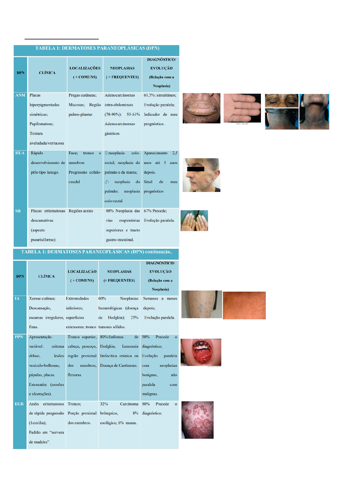 Dermatoses paraneoplásicas Histologia da ANM: hiperqueratose ortoqueratótica (que gera hiperpigmentação) e papilomatose com acantose mínima. Histologia da HLA: folículos horizontalizados, em fase anagênica, não medulados e com sebócitos imaturos. Histologia da SB: achados variáveis e inespecíficos. Hiperqueratose, acantose, paraqueratose, infiltrado perivascular de linfócitos e histiócitos. Histologia IA: hiperqueratose, acantose ou atrofia da camada espinhosa da epiderme. Histologia PPN: biópsias das vesículas. Disqueratose (excesso de queratina torna a pele sólida) e células inflamatórias, predominantemente linfócitos. Histologia EGR: inespecífica. Hiperqueratose, paraqueratose, acantose e espongiose. Infiltrado mononuclear superficial e perivascular. Acantose Nigricans Maligna Aspecto das lesões: placas hiperpigmentadas, simétricas, com graus variáveis de hipertrofia epidérmica. Apesar de toda a superfície corporal poder ser afectada, a dermatose tem preferência pelas pregas, principalmente axilas, faces laterais ou posterior do pescoço (local mais frequentemente envolvido, principalmente em crianças, até 99%), face interna das coxas, sulco infra-mamário, umbigo e pregas resultantes da obesidade. ❖ “tripe palms” ❖ queratoses seborreicas eruptivas (sinal de Leser-Trélat) ❖ papilomatose cutânea florida ❖ acometimento de mucosas Fisiopatologia ANM: produção exagerada de fatores de crescimento (TGF-alfa, IGF-1, FGF, MSH-alfa, FGFR3) → hiperplasia e hiperpigmentação. Tratamento: visa tratar o aspecto cosmético, sintomático (prurido) e funcional (odinofagia). Terapêutica de retinóides, ciproheptadina e PUVA, embora com escassos resultados. DD: Quando as lesões de ANM envolvem apenas a mucosa oral é importante considerar outras situações, tais como o nevo branco esponjoso (white sponge nevus), a papilomatose oral florida, a disqueratose intraepitelial benigna hereditária, a granulomatose de Wegener, a doença de Cowden, a doença de Darier, o xantoma verruciforme, entre outras. Nas lesões cutâneas há que considerar a doença de Addison, a hemocromatose, a pelagra, a dermatite atópica, o eritrasma, as queratoses seborreicas hipertróficas, a ictiose histrix, o pênfigo vegetante, o nevo de Becker, entre muitos outros. Hipertricose lanuginosa adquirida A hipertricose lanuginosa adquirida (HLA) é uma dermatose paraneoplásica obrigatória rara, caracterizada pelo desenvolvimento rápido de pêlo do tipo lanugo, ou seja, de pêlo não pigmentado, sem medula, fino, de tamanho aumentado (até 10-15 cm)e que se desprende com facilidade. Afecta principalmente a face (nariz, sobrancelhas, cílios, fronte e pavilhões auriculares), podendo também envolver o tronco, as axilas e os membros. No entanto, poupa as palmas das mãos, as plantas dos pés e as regiões supra-púbica e genital. Por razões ainda desconhecidas, apresenta uma progressão céfalo-caudal. ❖ glossite ❖ hipertrofia papilar da língua ❖ hiperpigmentação oral ❖ tricomegalia ❖ alterações do gosto e do cheiro ❖ diarreia ❖ adenopatias ❖ perda de peso ❖ esclerodermia ❖ queratoses seborreicas ❖ papilomatose cutânea florida ❖ acantose nigricans ❖ hiperqueratose palmo-plantar Fisiopatologia: citocinas, FGF, IGF → produção e rápido crescimento de pelos Tratamento: a terapêutica anti-tumoral parece estar associada à regressão do crescimento piloso. DD: hipertricoses congénitas, tanto as lanuginosas como as não lanuginosas (Síndrome de Ambras, de Hurler, de Cornelia e de Lange). A diferença estabelece-se relativamente à idade de aparecimento e às alterações associadas. Deve-se ainda diferenciar a HLA de outras formas adquiridas, nomeadamente as medicamentosas (ex:.minoxidil, ciclosporina, diazóxido, interferon, difenilhidantoína, psoralenos, corticosteróides, zidovudina, estreptomicina, penicilina, espironolactona, entre outros) e as associadas a outras doenças sistêmicas (infecção pelo VIH, anorexia nervosa, hipo e hipertiroidismo, porfiria cutânea tarda, cirrose biliar primária, lúpus eritematoso sistêmico, polimiosite, etc). Nestas formas adquiridas, a hipertricose é caracterizada pela presença de pêlos terminais, ou seja, com medula, mais escuros e mais espessos. O hirsutismo também pode ser considerado como diagnóstico diferencial em mulheres; no entanto, este resulta da produção/atividade aumentada dos androgénios ou de hipersensibilidade dos seus receptores, sendo os pêlos de tipo terminal e com uma distribuição topográfica tipicamente andróide. Porém, também o hirsutismo pode ter natureza paraneoplásica, principalmente quando surge numa idade mais avançada e de forma súbita, podendo traduzir a presença de tumores ováricos ou suprarrenais. Acroqueratose paraneoplásica de Bazex (ou síndrome de Bazex) Clinicamente, caracteriza-se pela presença de placas descamativas de cor eritematosa a violácea, simétricas, de aspecto psoarisiforme, mas com uma distribuição diferente da psoriase vulgar. Os locais acrais são mais frequentemente envolvidos, incluindo tanto a face dorsal como as faces palmar e plantar das mãos e dos pés, respectivamente. Bolognia et al referem que os locais mais frequentemente envolvidos são os pavilhões auriculares (79%), as unhas (75%), o nariz (63%), as mãos (57%) e os pés (50%). Os joelhos e os cotovelos apresentam lesões em menos de um quarto dos doentes e, quando ocorrem, surgem numa fase tardia da doença. Nas localizações palmo-plantares, observam-se frequentemente placas hiperqueratósicas nos pontos de maior pressão, poupando característicamente as áreas centrais. Ao contrário da psoriase, as lesões cutâneas na AP são mal definidas, com descamação pitiriasiforme e apresentam geralmente um aspecto mais azulado. Em doentes com fototipos altos, as lesões são tipicamente máculas hiperpigmentadas. Também podem ser observadas vesículas e bolhas. As un