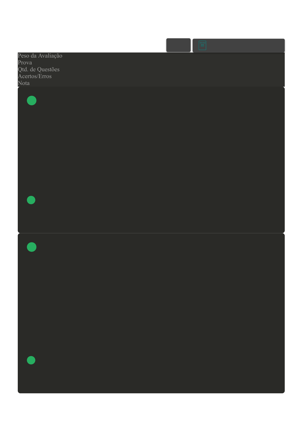 01/12/2022 21:13 Avaliação I - Individual about:blank 1/5 Prova Impressa GABARITO | Avaliação I - Individual (Cod.:770500) Peso da Avaliação 1,50 Prova 58549261 Qtd. de Questões 10 Acertos/Erros 10/0 Nota 10,00 A avaliação do consumo alimentar de um indivíduo ou coletividade é realizada através de inquéritos alimentares. Acerca da importância do profissional de nutrição conhecer o consumo dietético do seu paciente, classifique V para as sentenças verdadeiras e F para as falsas: ( ) Avaliar a ingestão alimentar de forma qualitativa e quantitativa. ( ) Avaliar o consumo de macro e micronutrientes. ( ) Possibilitar o planejamento de um plano alimentar. ( ) Possibilitar a avaliação antropométrica. Assinale a alternativa que apresenta a sequência CORRETA: A F - F - F - V. B F - V - V - V. C V - V - V - F. D V - F - V - F. O inquérito alimentar, instrumento utilizado para avaliar o consumo alimentar de indivíduos e coletividades, pode ser apresentado de diferentes formas, de acordo com algumas especificidades. O Questionário de Frequência Alimentar (QFA) é um desses inquéritos e reflete a dieta atual. É classificado como sendo um método retrospectivo. Sobre o QFA, classifique V para as sentenças verdadeiras e F para as falsas: ( ) Pode ser aplicado em estudos epidemiológicos. ( ) Possui baixo custo de aplicação, sendo fácil e rápido. ( ) Como desvantagem apresenta não ser possível saber a hora ou circunstância de consumo. ( ) Como desvantagem, exige alto nível de motivação e colaboração. Assinale a alternativa que apresenta a sequência CORRETA: A V - F - V - V. B F - F - F - V. C V - V - V - F. D F - V - F - F. VOLTAR A+ Alterar modo de visualização 1 2 01/12/2022 21:13 Avaliação I - Individual about:blank 2/5 Aprender a identificar e utilizar corretamente os inquéritos alimentares, seja para indivíduos e/ou grupos, é de suma importância no crescimento profissional. Nesse sentido, o inquérito alimentar, recordatório 24h, um dos mais empregados no Brasil, é um instrumento que reflete a dieta atual, sendo classificado como sendo um método retrospectivo. Sobre as vantagens na aplicação do recordatório 24h, assinale a alternativa CORRETA: A Fácil e rápida aplicação com baixo custo. B Não depende da memória, pois os alimentos são anotados no momento do consumo. C Pode ser aplicado em estudos epidemiológicos. D A ingestão prévia das últimas 24 horas pode ter sido atípica. A avaliação do consumo alimentar na prática clínica é realizada com a finalidade de fornecer subsídios para o desenvolvimento e a implantação de planos nutricionais. Fatores como condições do estado geral do indivíduo/paciente, evolução da condição clínica e os motivos pelos quais o indivíduo necessita de orientação nutricional direcionam a escolha do método de avaliação do consumo alimentar. Sobre as funções da avaliação do consumo dietético, assinale a alternativa CORRETA: A Independentemente do consumo alimentar habitual relatado pelo indivíduo em acompanhamento nutricional, as condutas do profissional devem utilizar exclusivamente as recomendações pautadas em uma alimentação saudável. B O consumo alimentar pode ser a base para planejamento de medidas individuais, como educação alimentar, porém é inadequado ao planejamento de políticas públicas. C A avaliação do consumo alimentar é essencial para a identificação de indivíduos ou grupos em risco nutricional, além de direcionar a prescrição dietética, avaliando a eficiência da intervenção. D Uma das dificuldades encontradas na avaliação do consumo alimentar é a falta de informações qualitativas da dieta, visto que todos os métodos avaliam quantitativamente os hábitos alimentares. O estado nutricional de um indivíduo é resultado da relação entre o consumo de alimentos e as necessidades nutricionais. Nesse sentido, no contexto da prática clínica, os inquéritos alimentares contribuem para a realização da avaliação nutricional. Assinale a alternativa CORRETA que apresenta os objetivos dos inquéritos alimentares na avaliação nutricional: A Tem como objetivo: elaborar a recomendação de micronutrientes para o paciente e diagnosticar a composição corporal. B Tem como objetivo: avaliar a necessidade energética do paciente, quantificar a ingestão de nutrientes e diagnosticar doenças. C Tem como objetivo: quantificar a ingestão de nutrientes, avaliar o consumo de alimentos ou grupos alimentares, avaliar o padrão alimentar individual. D Tem como objetivo: avaliar a saúde do paciente, quantificar a ingestão de nutrientes, avaliar o consumo de alimentos ou grupos alimentares e verificar alterações bioquímicas. 3 4 5 01/12/2022 21:13 Avaliação I - Individual about:blank 3/5 A antropometria é composta pelas medidas das dimensões corporais do paciente e inclui altura, peso, Índice de Massa Corporal, composição corporal, reservas de gordura e músculos. Esses dados auxiliam na avaliação do estado nutricional e no acompanhamento da evolução corporal do indivíduo, norteando a terapia nutricional. Com relação às medidas antropométricas, classifique V para as sentenças verdadeiras e F para as falsas: ( ) O percentual de gordura pode ser obtido de 2 formas, tanto pelo cálculo padronizado das dobras cutâneas quanto pela realização da impedância bioelétrica. Entretanto, é necessário que, para a comparação das medidas do indivíduo ao longo do tempo, o método utilizado seja sempre o mesmo. ( ) As medidas corporais de peso, circunferências corporais e dobras cutâneas não devem ser utilizadas quando o paciente estiver com edema ou ascite, visto que essa condição altera os valores obtidos e consequentemente a sua interpretação. ( ) Para a obtenção do peso corporal, é indicado o uso de balança calibrada de plataforma ou eletrônica, para a coleta da altura utiliza-se um adipômetro, e para a medida das circunferên
