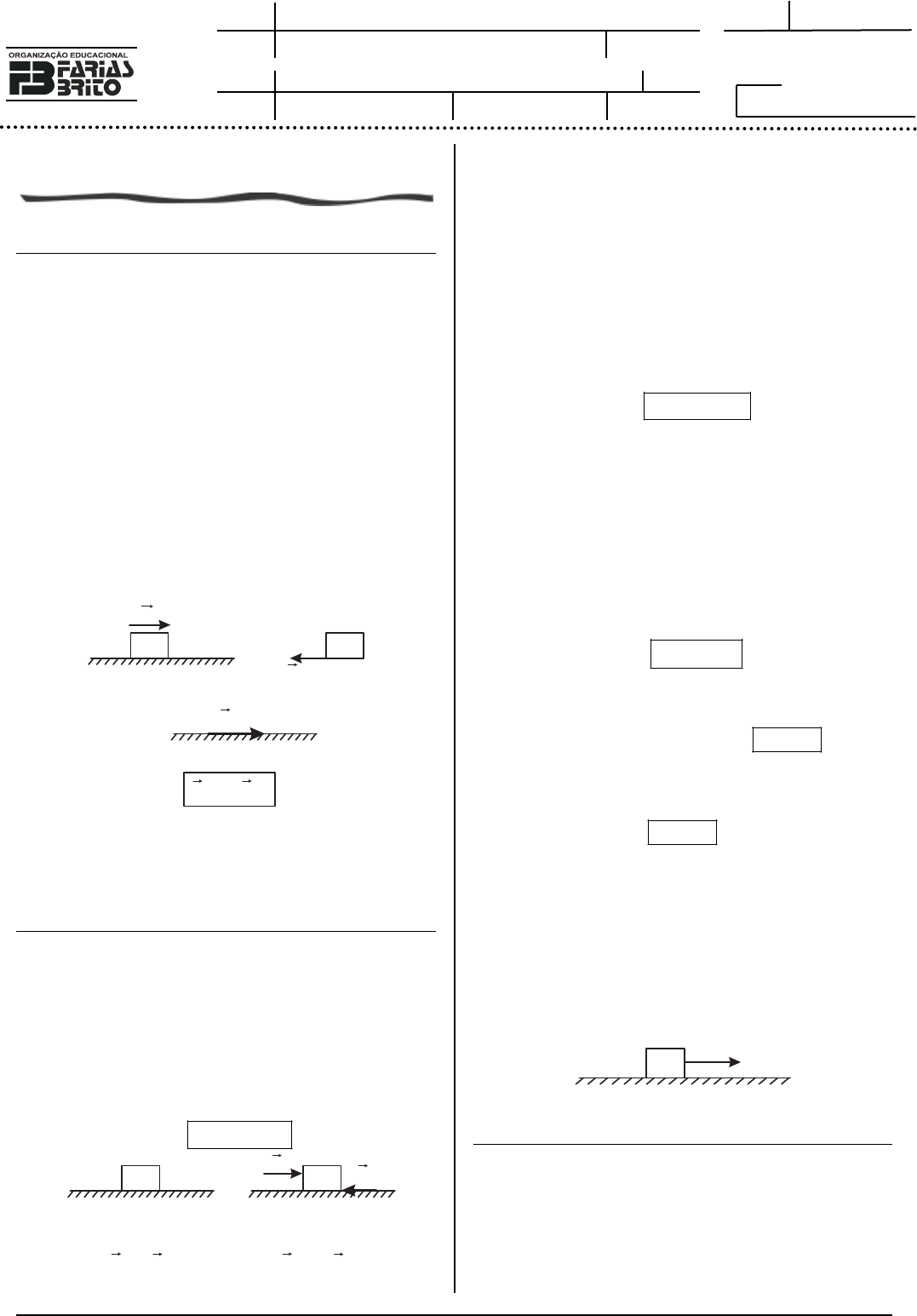 OSG.: 36035/10 ENSINO PRÉ-UNIVERSITÁRIO TC FÍSICA TURNO DATA ALUNO(A) TURMA Nº SÉRIE PROFESSOR(A) TADEU CARVALHO ITA/IME SEDE ___/___/___ Força de Atrito Conceito de Atrito Atrito é um estado de aspereza ou rugosidade entre dois sólidos em contato, que permite a troca de forças em uma direção tangencial à região de contato entre os sólidos. O fato de existir atrito entre dois sólidos não implica, necessariamente, a existência de uma força de atrito entre eles. A força de atrito só se manifesta quando há deslizamento entre os sólidos (atrito dinâmico) ou quando houver tendência de deslizamento entre os sólidos (atrito estático). O sentido de força de atrito é sempre contrário ao deslizamento ou à tendência de deslizamento entre os sólidos em contato. De acordo com a Lei de Newton (Ação e Reação) os sólidos A e B trocam entre si forças de atrito, isto é, existe uma força de atrito que A aplica em B e outra força de atrito que B aplica em A. É evidente que tais forças de atrito, são opostas, isto é, têm mesma intensidade, mesma direção e sentidos opostos. As forças de atrito trocadas entre A e B ( )AB BAat atF e F� � nunca se equilibram porque estão aplicadas em corpos distintos. Atrito Estático Quando entre dois sólidos A e B existe e, embora não haja movimento relativo entre eles, há uma tendência de deslizamento, isto é, há uma solicitação ao movimento, surge uma força de atrito no sentido de evitar o deslizamento relativo e denominada força de atrito estática. Não havendo deslizamento, a força de atrito estática tem intensidade igual à da força que solicitou o sistema a se mover, força esta chamada de força motriz. estáticaat motriz F F= À medida que a força motriz vai aumentando (maior solicitação ao movimento), a força de atrito estática também vai aumentando, de modo a continuar evitando o movimento relativo entre os sólidos. Contudo, existe uma limitação para o valor da força de atrito estática, isto é, existe uma força de atrito máxima que é denominada força de atrito máxima. Dependendo da intensidade da força motriz ( )F � , a força de atrito estática ( )EatF � tem intensidade que pode variar de zero (não há solicitação ao movimento) até um valor máximo chamado força de atrito máxima (o deslizamento entre os sólidos em contato é iminente). E Máxat at 0 F F≤ ≤ A força de atrito máxima ( )MáxatF tem intensidade proporcional à intensidade da força normal de contato entre os sólidos (N), isto é, a força que tende a apertar um sólido contra o outro. A constante de proporcionalidade entre a força de atrito de destaque ( )MáxatF e a força normal (N) só depende dos sólidos em contato (material dos corpos, polimento, lubrificação) e é denominado coeficiente de atrito estático ( )eµ . ( )máxat e F N= µ Atenção: O valor de µe geralmente é menor do que 1. No entanto, alguns pares de superfície têm em média µe > 1. Exemplos: Níquel sobre níquel + E 1,10µ = aço fundido sobre aço fundido ↓ E 1,10µ = Fundamental University Phisics Alonso & Fine Exemplo 1 (UFC/87.2) O bloco da figura tem massa M = 10kg e repousa sobre uma superfície horizontal. Os coeficientes de atrito, estático e cinético, entre o bloco e a superfície são µE = 0,5 e µe = 0,4, respectivamente. Aplicando no bloco uma força horizontal F = 20N, determine a força de atrito que atua sobre ele (g = 10m/s2). Atrito Dinâmico Quando a intensidade da força motriz (F) supera a intensidade da força de atrito máxima ( )( )máxatF tem início o deslizamento entre os sólidos em contato e o atrito é chamado dinâmico ou cinético. Verifica-se experimentalmente que o coeficiente dinâmico ( )dµ é menor que o coeficiente de atrito estático A B FatBAA B F Bloco A em repouso. Não há força motriz. FatBA = O Bloco A em repouso. Atua uma força motriz F. FatBA = – F M F A V B A FatBA FatAB B FatBA FatBA= – TC – FÍSICA 2 OSG.: 36035/10 ( )Eµ , o que significa que, ao iniciar o movimento, a força de atrito diminui sua intensidade. d Eµ < µ Durante o deslizamento entre os sólidos, supondo que as superfícies de contato sejam homogêneas (µd = constante), a força de atrito terá intensidade constante, não importando a velocidade relativa entre os sólidos nem a intensidade da força motriz. Fat (dinâmico) = µd N → constante. GRÁFICO DA FORÇA DE ATRITO Exemplo 2 Em cada um dos desenhos abaixo, assinalar as forças de atrito trocadas pelos corpos indicados. A) Entre a bengala e o chão. B) Entre o corpo A e o apoio. C) Entre o corpo A e o corpo C. (Entre A e o apoio não há atrito). D) Entre o corpo B e a parede vertical. E) Entre o corpo A e o apoio. F) Entre o pneu e o chão, assinalando somente a componente no plano da figura. Exemplo 3 A intensidade da força de atrito recebida por um bloco do plano de apoio ( )atF , varia com a intensidade da força exercida pelo homem (F) conforme o gráfico. Calcule: A) µE e µd B) a aceleração do bloco para F = 120N. Dados: massa do bloco = 40kg g = 10m/s2 F Fat 45º mEN mdN A B V = 00 C A B V = 00 A B V = 00 C m = mB C A B V = 00 F(N) F (N)at 45º 100 80 100 TC – FÍSICA 3 OSG.: 36035/10 q P Fat N a Corpo na Iminência de Movimento Sobre um Plano Inclinado Se o corpo está prestes a se movimentar, então: Fat = µE N. N = Pcos θ Fat = Psen θ Daí: Psen θ = µE · Pcos θ E tgµ = θ Exemplo 4 Se inclinarmos gradativamente a superfície S, os corpos M e N ficam na iminência de escorregar para ângulos da superfície com a horizontal respectivamente iguais a 30º e 60º. Colocando-se M e N colados, a iminência se dará para um ângulo α. Determine α. A razão entre os pesos PM e PN dos corpos é: M N P 3 P = Aceleração de Um Corpo num Plano Inclinado com Atrito FR = µa FR = mgsen θ – Fat Fat = µdN = µd ⋅ Pcos θ Daí: ma = mgsen θ – µdmg ⋅ cos θ a = 0 → µd = tg θ a = gsen θ – µdg ⋅ cos θ 