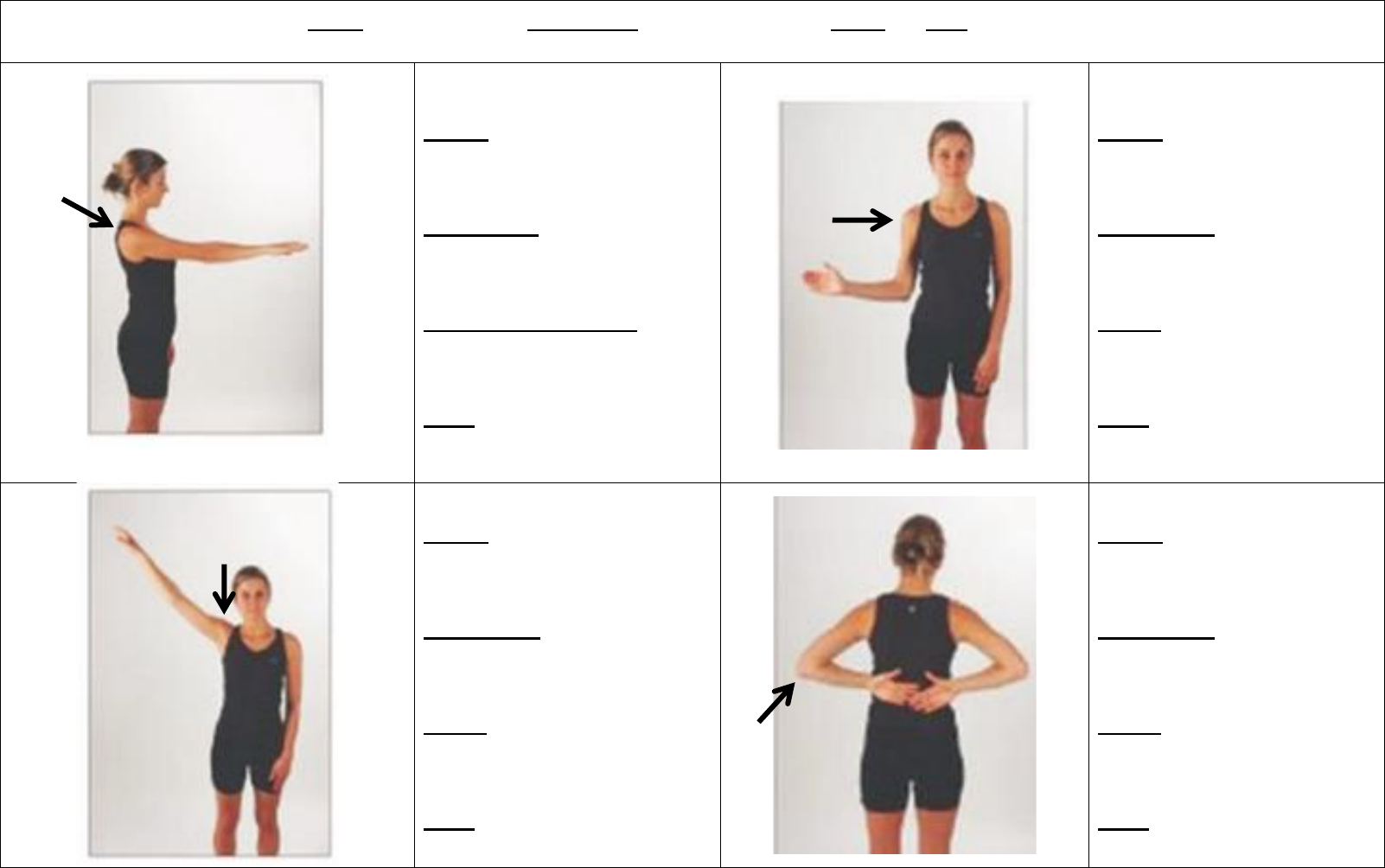 1) Nas figuras abaixo escreva o nome da articulação, o movimento realizado e qual é o plano e o eixo do movimento. Nome: Abdução Movimento: Extensão Plano: Sagital, frontal Eixo: Latero, lateral Nome: flexão rotação Movimento: rotação Plano: sagital Eixo: Latero lateral Nome: Abdução Movimento: Extensão Plano: Sagital Eixo: latero lateral Nome: flexão Movimento: flexão Plano: coronal Eixo: posterior 2) Nas figuras abaixo escreva o nome da articulação, o movimento realizado pela articulação apontada pela flecha, dê o nome do plano e do eixo do movimento. Nome: flexão de quadril Movimento: flexão Plano: Axial transversal Eixo: Longitudinal Nome: Extensão Membro inferior e abdução Movimento: Extensão e Abdução Plano: Transverso Eixo: Longitudinal Nome: supinação Movimento: flexão supinação Plano: sagital Eixo: latero lateral Nome: Flexão de Quadril Movimento: Flexão Plano: Axial Eixo: Longitudinal 3) Nas figuras abaixo escreva o nome da articulação, o movimento realizado pela articulação apontada pela flecha ,qual o plano do movimento e desenhe e dê o nome do eixo do movimento. Nome: rotação do tornozelo Movimento: inversão Plano: transversal Eixo: Vertical longitudinal Nome: Flexão Movimento Flexão Posterior Plano: coronal Eixo: Posterior Nome: flexão do quadril Movimento: flexão Plano: longitudinal Eixo: transverso Nome: Rotação Movimento: Rotação Medial Plano: Transversal Eixo: Longitudinal