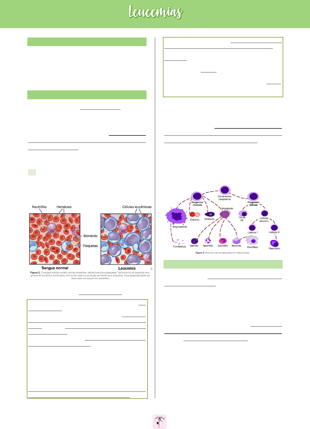 1 Júlia Morbeck – @med.morbeck Objetivos 1- Discutir a epidemiologia, etiologia e classificação das leucemias; 2- Explicar sobre a fisiopatologia e manifestações clínicas das leucemias; 3- Debater sobre o diagnóstico das leucemias. Leucemias ↠ As leucemias são neoplasias malignas de células originalmente derivadas de células precursoras hematopoéticas (PORTH, 10ª ed.). ↠ As leucemias se caracterizam pela substituição difusa da medula óssea por células neoplásicas imaturas em proliferação desregulada. Na maioria dos casos, as células leucêmicas entram na corrente sanguínea, onde podem ser observadas em grande número (PORTH, 10ª ed.). OBS.: O termo leucemia foi utilizado pela primeira vez por Virchow para descrever uma inversão da razão habitual entre hemácias e leucócitos. As células leucêmicas também podem infiltrar o fígado, o baço, os linfonodos e outros tecidos por todo o organismo, causando aumento desses órgãos (PORTH, 10ª ed.). ↠ A leucemia é uma doença maligna dos glóbulos brancos, geralmente, de origem desconhecida (PUGGINA). A incidência de leucemia entre pessoas que foram expostas a altos níveis de radiação é extraordinariamente alta. Um aumento da incidência de leucemia também está associado à exposição ao benzeno, muitas toxinas desconhecidas, fármacos, produtos químicos e gases. A leucemia pode ocorrer como um segundo câncer após quimioterapia agressiva de outros tipos de câncer, como linfoma de Hodgkin. A existência de predisposição genética para o desenvolvimento de leucemia aguda é sugerida por maior incidência da doença entre inúmeras doenças congênitas, incluindo síndrome de Down, neurofibromatose e anemia de Fanconi. Há também numerosos relatos de casos de leucemia aguda ocorrendo em uma mesma família (PORTH, 10ª ed.). A biologia molecular da leucemia aponta que o evento ou eventos causadores de distúrbios exercem seus efeitos por meio da desregulação dos genes que normalmente regulam o desenvolvimento e a homeostasia das células sanguíneas. Estudos citogenéticos têm demonstrado que há alterações cromossômicas recorrentes em mais da metade de todos os casos de leucemia. Mais comumente, são alterações estruturais classificadas como translocações, representadas como t(8;21), em que uma parte do cromossomo (p. ex., 8) passa a se localizar em outro cromossomo (p. ex., 21) e vice-versa; inversões, representadas como inv(16), em que parte de um cromossomo (p. ex., 16) está invertida e agora em ordem inversa, mas ainda ligada ao cromossomo original; e deleções, representadas como del(7), ou –7, em que parte de um cromossomo (p. ex., 7) se perdeu (PORTH, 10ª ed.). ↠ A medula óssea é a responsável pela produção das células que dão origem aos glóbulos brancos (leucócitos), aos glóbulos vermelhos (hemácias ou eritrócitos) e às plaquetas. Na leucemia, uma célula sanguínea que ainda não atingiu a maturidade sofre uma mutação genética que a transforma em uma célula cancerosa. Essa célula anormal não funciona de forma adequada, multiplica-se mais rápido e morre menos do que as células normais. Dessa forma, as células sanguíneas saudáveis da medula óssea vão sendo substituídas por células anormais cancerosas (PUGGINA). Epidemiologia ↠ A leucemia é a causa mais comum de câncer em crianças e adolescentes. É responsável por 29% dos cânceres na infância. Embora comumente seja considerada uma doença da infância, a leucemia é diagnosticada 10 vezes mais frequentemente em adultos do que em crianças (PORTH, 10ª ed.). ↠ No Brasil, atualmente a leucemia é o 9º câncer mais comum entre os homens e o 11º entre as mulheres. Existem mais de 12 tipos de leucemia, sendo que os quatro primários são leucemia mielóide aguda (LMA), leucemia mielóide crônica (LMC), leucemia linfocítica aguda (LLA) e leucemia linfocítica crônica (CLL) (PUGGINA). APG 22 – “DEPENDE DA MEDULA” 2 Júlia Morbeck – @med.morbeck Classificação ↠ Classificam-se em leucemias agudas e crônicas, que, por sua vez, subdividem-se em linfoides e mieloides, dependendo da linhagem acometida (CIMOLIN et. al., 2015). AGUDAS OU CRÔNICAS ↠ Nas leucemias agudas há um crescimento rápido e desordenado dos glóbulos brancos gerando um acúmulo de células imaturas, chamados de blastos e a doença agrava-se num curto intervalo de tempo. As células leucêmicas não exercem função normal das células sanguíneas (PUGGINA). ↠ Nas leucemias crônicas também ocorrem pela multiplicação desordenada dos glóbulos brancos, mas a progressão é lenta, demora de meses a anos e lentamente ela se agrava. No início da doença, as células leucêmicas ainda conseguem fazer algum trabalho dos glóbulos brancos normais. A descoberta da doença geralmente é durante exame de sangue de rotina. À medida que o número de células leucêmicas aumenta, aparecem inchaço nos linfonodos (ínguas) ou infecções. Quando surgem, os sintomas são brandos, agravando-se gradualmente (PUGGINA). RESUMO: Elas podem ser divididas em agudas, quando as células sanguíneas não conseguem completar seu processo de maturação, levando ao rápido crescimento das células imaturas (células embrionárias) e crônicas, onde as células atingem um estado maturo, porém, devido a erros genéticos, se tornam morfológica, histológica e funcionalmente “anormais” (ABREU et. al., 2021). LINFOIDES OU MIELOIDES ↠ Concomitantemente, as leucemias podem ser subclassificadas em linfoides ou mieloides, dependendo da origem celular hematopoiética. Células de defesa, tais como, linfócitos B, T e células NK (natural killer), tem como origem as células progenitoras linfoides. Já as células-tronco, mieloides originam as progenitoras de células vermelhas do sangue (eritrócitos), a maioria das células brancas (neutrófilos, eosinófilos, basófilos, monócitos, mastócitos e células dendríticas) e as cé