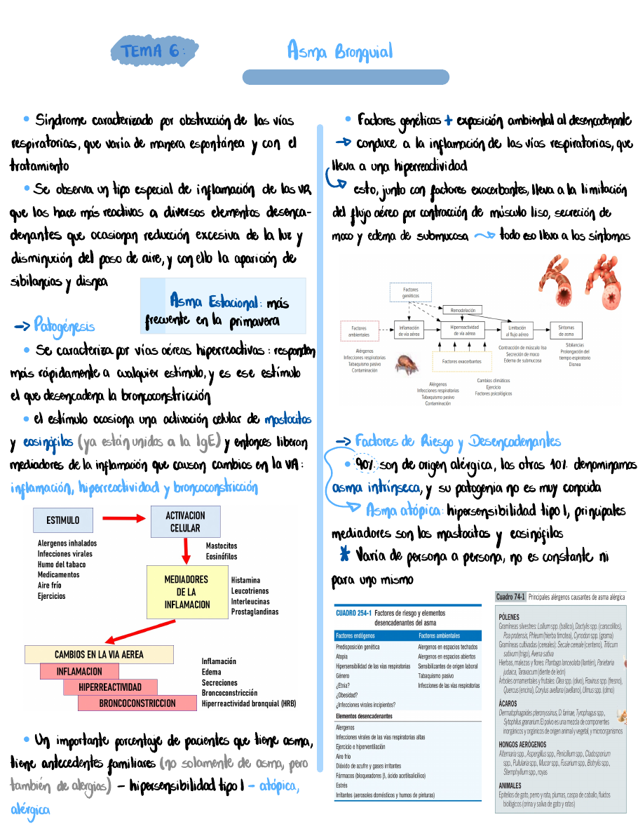 TEMA 6 : Asma Brongvial ' Sindrome caracterizado por obstruction de las vias - Factores genetics + exposition ambiental al desencadenante respiratorias , que varia de manera espontoinea yoon et → conduce a la inflamacion de las vias respiratorias, que tratamiento Neva a unahiperreactividad.seobserver on Tipo especial de inflamacidn de lasur ↳ esto,junto con factores exacerbates, Ileva a 1a limitation que Ias trace ma's reactivas a diversos elements desenca- del flujoaéreo por contraction de Misato Iiso, secretion de demantes que Ocasioman reduction excesiva de la luz y mccoy edema de submucosa→ Todo eso Neva a lossintomas disminucidn del paso de aire, yoonello la aparicio ' n de sibilance ' as y dispea Asma Estacionat : ma's → Patogénesis frewen te en la primavera . se caracterizapor vias aéreashiperreaotivas : responders ma's roipidamente a walquierestimulo,yes ese estimulo el que desencadena la broncoconstriction - et estimulo ocasiona una activation cellar de mastocitos y eosinofilos (ya estoin unidos a la 1gE) yentaxes liberan → Factores de Riesgo y Desencadenantes mediadores de la information que causan Cambio en laVA : . iii.son de Origen alérgica, los otros 10% denominamos information, hiperreactividady broncoconstriction €5 intrinse.ca, y su patogenia no es muy conooida Asma atopica: hipersonsibilidad tip01, principales Mediadores son 10s mastoa-tosyeosino.fi10s * Varia de persona a persona, no es Constante ni para Uno mismo • Un importante poroentaje de patientes que tiene asma, tiene antecedents familiares Ino solamentede asma, pero también de alergias) - hipersonsibilidadtipo I - atdpica, alérgica • El pacientedebe vivir en ambientessumamente relationada con et ritmo circadian, siendo ma's frewente por controlados, para witar esos periods de broncoconstriction la noche) , puede tener disneaeinduso Harar a una IR ↳ entoncesd primer factor para el tratamientoadewado . La broncoconstriction causalas sibilance'as del asma es control ambientat . Algunospacientesrefieren presidn end pedro • Los asmoiticoscomunmentepadeoenotrasenfermedades ↳ no tiene que presentarsetodojuntonecesariamente, atopicas : rinitisalérgica (Mois del 80%1 y dermatitis pero en Ias exacerbationessudeaparecertodo atopica leccema) - El pacientepuede referir " difiwHad de que llegueaire a 10s putMones " - Asma lntrinse.ca: no depende del ambiente . En algonos armenta la production de Mao que es espeso, • solo 10% de los pacientes pegajosoydifioil de expectorate ; con frewencia se aoompaña de • concentrationes séricas normales de IgE hiperventilation y empleo de musculature accesoria • también se Comoce Como asmade comienzotardio o Antes de las crisis a veoes surgeon algunos sintomas asma del adulto prodrdmicos : priorito debajo de la quijada/Menton lqueixol, - Ios pacientessuden tener pcilipos nasales y a Veles son moléstiasinterescapolareso sensation de muerte inminute sensible at a'a'do acetilsalicilico ↳ AINEs inhibidores de la Cox-1 estarn contraindicados en → Gasification por la Clinica patientes asmoiticos, utiliear Ios que seam selectivos de la Cox-2 1. Asma Intermitenter • + persistente ygrave . la mais frewente ' episodios de disnea con sibilance _ as , intensidad variable ' se interCala con periods asinformatics - forma clinica que predomina en la infarcia, relacionada con la hipersensibilidad tipo 1 . hay on factor desencadenante , que poede ser de origen alérgicao no • Ias crisis suelenser loves, percibidas Como opresiones toroicicas , pero también se pueden presentar Como crisis muy intensas ↳ Cuando la crisis es intensa dpaoiente experimenta sensation → Manifestaa'ones clinicas de dispea, sobretodo durante la inspiration . Hay que considerar a - puedenowswltarse abundantes ronous y sibilamias Cada paciente de forma - en general tiene buen promo'stico individual . frewente que enlosnin-osvayamejorandoconlaedad.la gram mayoriawrsa con : tos Seca (produce nooo, 2. Asma Persistente pero es viscosa y deficit de - sinTomas continuous de tos, sibilance ' as , sensation de disnea eliminate, y sude estar oscilantey de variable intensidad, que puedeavmentar por Ias noches y durante Ias primeras horas de la Madrugada . Para diferemoiar asma de EPOO en et adulto tenemos que - se debe inchoir bronoodilatadores en et tratamiento si o si, tracer si o si una prueba broncodilatordora : le hacemos una porque puede tener crisisgraves espirometriayluego administramos on broncodilatador y ' puede evolutionar a laoronicidadtras on Corto period0 de tiempo repetimos la espirometria - muohosenfermosrelacionaneliniciode.su patologia a un ↳ si FEU se incrementa miniMO 12-1. 0 200mL, tenemos cuadro viral - teoria de la reactive_dad que producers 10s virus una respvesta positives para asma - la alergia Como factor desencadenante es detectada em on ↳ si no owrre, estamos ante una obstruction irreversible o Menor numero de pacientes en comparacion con asma intermitente poco reversible→ EPOC • si se realiza un control continuado de lafunction ventilatoria, • en et adult0 SIEMPRE hacemos la espirometria con por ejemplo, mediante la determination del flujoespiratorio maximo prueba broncodilatadora (salbutamol em puff) (PEF) , se observer que la obstruction bronchial Sigue un ritmo . en algonos patientes no podemos considerar asma de entrada, circadiano y se acentia por Ias marianas se recomiendarepetir la espirometria despise's de una panta de tratamiento con glucocorticoids orates por A Mes 130-40mg 3. Asma Atipica de prednisone 0 prednisonena al dial - se presenta en formade too persistente - Pruebas hematologicas : no sullen arrojar dats muy itiles - et diagnostic se debe considerar sobreTodo si latosseacompaña en algonos patientes podemos solicitor IgE desibilance'as, y ta exploration de la funcion ventilatoria nuestra . Rx de tcirax : suele ser normal, no aporta muchosdatos. Puede una obstruction bronquial reversiblecon broncodilatador aparecerhiperinsuflacidnpulmo