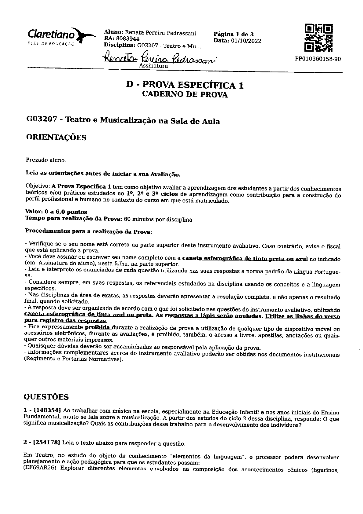 Renata Máquina de escrever 3 - [382819] Pontuação: 0.0 Retorno do Professor: As unidades temáticas são: artes visuais, teatro, música, dança e artes integradas.As Artes visuais são os processos e produtos artísticos e culturais, nos diversos tempos históricos e contextos sociais, que têm a expressão visual como elemento de comunicação. Essas manifestações resultam de explorações plurais e transformações de materiais, de recursos tecnológicos e de apropriações da cultura cotidiana (BRASIL, 2017, p 195).A Dança se constitui como prática artística pelo pensamento e sentimento do corpo, mediante a articulação dos processos cognitivos e das experiências sensíveis implicados no movimento dançado. Os processos de investigação e produção artística da dança centram-se naquilo que ocorre no e pelo corpo, discutindo e significando relações entre corporeidade e produção estética (BRASIL, 2017, p 195).A Música é a expressão artística que se materializa por meio dos sons, que ganham forma, sentido e significado no âmbito tanto da sensibilidade subjetiva quanto das interações sociais, como resultado de saberes e valores diversos estabelecidos no domínio de cada cultura (BRASIL, 2017, p 196).O Teatro instaura a experiência artística multissensorial de encontro com o outro em performance. Nessa experiência, o corpo é lócus de criação ficcional de tempos, espaços e sujeitos distintos de si próprios, por meio do verbal, não verbal e da ação física. Os processos de criação teatral passam por situações de criação coletiva e colaborativa, por intermédio de jogos, improvisações, atuações e encenações, caracterizados pela interação entre atuantes e espectadores (BRASIL, 2017, p 196).Na BNCC de Arte, cada uma das quatro linguagens do componente curricular – Artes visuais, Dança, Música e Teatro – constitui uma unidade temática que reúne objetos de conhecimento e habilidades articulados às seis dimensões apresentadas anteriormente. Além dessas, uma última unidade temática, Artes integradas, explora as relações e articulações entre as diferentes linguagens e suas práticas, inclusive aquelas possibilitadas pelo uso das novas tecnologias de informação e comunicação (BRASIL, 2017, p 197).