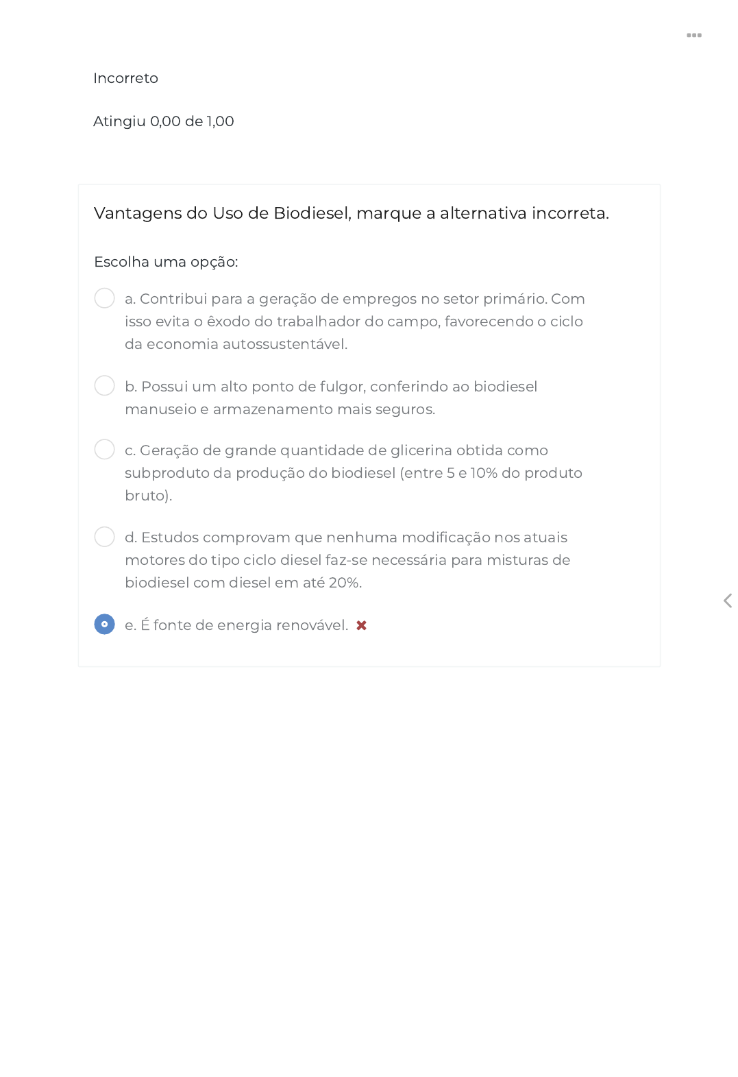 Questão 1 Incorreto Atingiu 0,00 de 1,00 Vantagens do Uso de Biodiesel, marque a alternativa incorreta. Escolha uma opção: a. Contribui para a geração de empregos no setor primário. Com isso evita o êxodo do trabalhador do campo, favorecendo o ciclo da economia autossustentável. b. Possui um alto ponto de fulgor, conferindo ao biodiesel manuseio e armazenamento mais seguros. c. Geração de grande quantidade de glicerina obtida como subproduto da produção do biodiesel (entre 5 e 10% do produto bruto). d. Estudos comprovam que nenhuma modi�cação nos atuais motores do tipo ciclo diesel faz-se necessária para misturas de biodiesel com diesel em até 20%. e. É fonte de energia renovável. https://ava.politecnicabr.com.br/ Questão 2 Correto Atingiu 1,00 de 1,00 Sobre os Derivados não Energéticos, marque a alternativa correta. Escolha uma opção: a. Nafta b. Óleo diesel c. Óleo lubri�cante d. Para�na e. Coque https://ava.politecnicabr.com.br/ Questão 3 Correto Atingiu 1,00 de 1,00 As macroetapas da cadeia produtiva do GN são: essa etapa constitui os estudos geológico e geofísico necessários para reconhecer o potencial de uma área e em seguida a perfuração do poço para a descoberta da jazida. nessas unidades ele é desidratado e fracionado em produtos especí�cos como gás de cozinha, gasolina, GNV etc. é transportado tanto na fase gasosa (via dutos) como na fase líquida. Para se tornar líquido, o gás é resfriado a - 162°C, quando diminui de volume (1 m de um produto líquido equivale a 600 mm do mesmo produto gasoso). ao chegar ao destino �nal, o gás é regasei�cado em estações e destinado à distribuição. quando da extração do gás, este vem acompanhado de água, hidro- carbonetos em estado líquido e partículas sólidas. Parte do gás é reinjetada e a outra parte é enviada para processamento. Explor Proces 3 3 Transp Distrib Produ https://ava.politecnicabr.com.br/ Questão 4 Correto Atingiu 1,00 de 1,00 Nas re�narias, o petróleo é submetido a processos químicos como o craqueamento e a destilação fracionada, sendo o resulta- do desses processos separado em grupos. Nessa destilação encontram-se os seguintes componentes conforme faixas de temperatura. Marque a alternativa incorreta. Escolha uma opção: a. De 20 a 60°C → benzina b. De 90 a 120°C → nafta c. De 150 a 300°C → querosene d. De 250 a 350°C → gasóleo ou óleo diesel e. De 40 a 200°C → gasolina https://ava.politecnicabr.com.br/ Questão 5 Correto Atingiu 1,00 de 1,00 Marque Verdadeiro ou Falso sobre o Programa Pro-Álcool: ( ) A decisão de produzir etanol a partir da cana-de-açúcar por via fermentativa foi por causa do aumento nos preços do açúcar na época. ( ) A produção de álcool no Brasil no período de 1975-76 foi de 600 milhões de litros, no período de 1979-80 foi de 3,4 bilhões e de 1988-89 chegou ao auge, com 12,3 bilhões de litros. ( ) A chamada “crise do petróleo” de 1982 foi a mola propulsora para intensi�cação das pesquisas de melhoria da produtividade dos canaviais realizadas na época. ( ) A primeira fase do programa Pro-Álcool, que possuía uma meta de produção de 7,7 bilhões de litros em cinco anos. Os �nanciamentos chegavam a cobrir até 80% do investimento �xo para destilarias à base de cana-de-açúcar e até 90% para destilarias envolvendo outras matérias- -primas, como a mandioca, o sorgo saca- rino, o babaçu e outros. Escolha uma opção: a. V, V, F, F. b. F, V, V, F. c. V, V, F, V. d. V, V, V, V. e. F, F, F, F. https://ava.politecnicabr.com.br/ Questão 6 Correto Atingiu 1,00 de 1,00 Está em estudo no Brasil um novo Marco Regulatório para atender às ocorrências da cama- da do Pré-Sal e em áreas que venham a ser consideradas estratégicas. Os projetos foram enviados pelo governo brasileiro para apreciação do Poder Legislativo no dia 31 de agosto de 2009, na forma de quatro projetos de lei (PL). Os projetos de lei de�nem: Escolha uma opção: a. A formação de um Fundo Social. b. O sistema de partilha e de produção para a exploração e a produção nas áreas ainda não licitadas do Pré-Sal. c. A criação de uma nova estatal, a Petro-Sal. d. A cessão onerosa à Petrobrás do direi- to de exercer atividades de exploração e produção (E & P) de petróleo e gás natural em determinadas áreas do Pré-Sal, até o limite de 5 bilhões de barris, além de capitalização da companhia. e. Todas as alternativas corretas. https://ava.politecnicabr.com.br/ Questão 7 Correto Atingiu 1,00 de 1,00 Marque Verdadeiro ou Falso: ( ) A palma é uma palmeira que tem como fruto o dendê. A região de atuação da Biopalma abrange uma grande área, entre outros municípios: Moju, Tailândia, Acará e Concórdia do Pará. Serão utilizadas as áreas antropizadas, que correspondem a 24% do território paraense (30 milhões de hectares). Escolha uma opção: Verdadeiro Falso https://ava.politecnicabr.com.br/ Questão 8 Correto Atingiu 1,00 de 1,00 Marque Verdadeiro ou Falso sobre Regime Jurídico para Exploração de Petróleo e Gás Natural: ( ) A Constituição Federal, em seu artigo 20, estabelece que “São bens da União os re- cursos minerais, inclusive os do subsolo”; em seu artigo 176 cita que “As jazidas, em lavra ou não, e demais recursos minerais e os potenciais de energia hidráulica constituem propriedade distinta do solo, para efeito de exploração ou aproveitamento, e pertencem à União, garantida ao concessionário a propriedade do produto da lavra”; e, �nalmente, o artigo 177 cita que “Constituem monopólio da União a pesquisa e a lavra das jazidas de petróleo e gás natural e outros hidrocarbonetos �uídos”. Escolha uma opção: Verdadeiro Falso https://ava.politecnicabr.com.br/ Questão 9 Correto Atingiu 1,00 de 1,00 Com a substituição do combustível, os automóveis precisaram passar por alterações na tecnologia de fabricação. Marque a alternativa correta. Esc