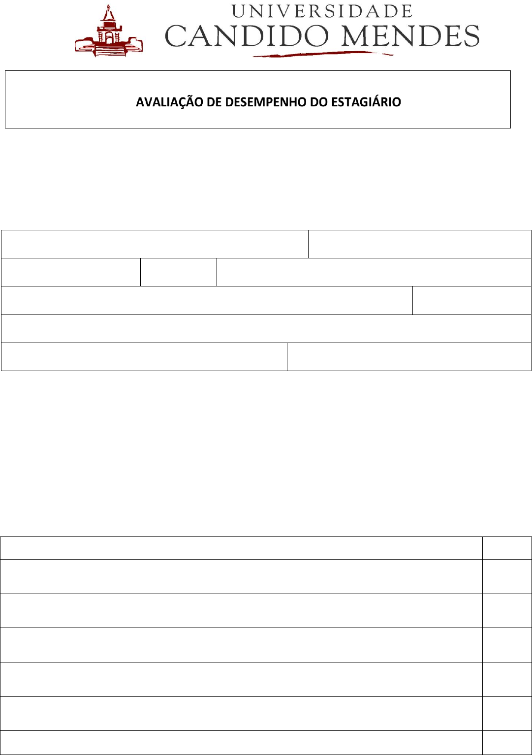 Este documento, a ser preenchido pelo Estagiário e pelo Supervisor de Estágio da instituição concedente, integra o processo de Acompanhamento de Estágio Supervisionado Obrigatório. IDENTIFICAÇÃO DO ESTAGIÁRIO Nome: Curso: Polo: Período: Acompanhamento do Estágio: ____/____/____ a ____/____/____ Local de estágio: Tel.: ( ) Segmento de Ensino: Supervisor de Estágio: Cargo do Supervisor: CONSIDERAÇÕES DO ESTAGIÁRIO De acordo com o desenvolvimento do seu estágio, avalie as afirmativas abaixo conforme a legenda: 5 – CONCORDO COMPLETAMENTE 4 – CONCORDO PARCIALMENTE 3 – NEM CONCORDO NEM DISCORDO 2 – DISCORDO PARCIALMENTE 1 – DISCORDO TOTALMENTE RESULTADOS OBTIDOS Avaliação A) O estágio proporcionou experiência de trabalho e envolveu informações/conhecimentos de aplicação prática, contribuindo para minha formação profissional. B) O estágio levou-me a estudar mais e melhor, fazendo com que me preocupasse mais com o conteúdo do programa das matérias, gerando um melhor aproveitamento do curso. C) O estágio permitiu conhecer a filosofia, diretrizes, organização e funcionamento de uma instituição de ensino, transmitindo experiências úteis para o exercício profissional futuro. D) O estágio permitiu a identificação com maior clareza de meus valores pessoais e de trabalho, ajudando a confirmar (ou repensar) minha escolha profissional. E) O estágio permitiu melhorar meu relacionamento humano, fazendo-me sentir a importância do trabalho em equipe. F) O estágio permitiu familiarização com sistemas, novas tecnologias e metodologias de trabalho, facilitando o desenvolvimento do senso crítico necessário à minha atividade profissional. G) Pelas necessidades na prática, o estágio fez sentir que os programas das disciplinas estudadas no curso podem ser ampliados e enriquecidos, beneficiando minha qualificação profissional. H) A experiência adquirida no estágio contribuiu para o desenvolvimento de habilidades comportamentais e técnicas. SUPERVISÃO DE ESTÁGIO A supervisão recebida na Instituição de Ensino – Unidade Concedente, foi considerada: ( ) MUITO BOA ( ) BOA ( ) REGULAR ( ) RUIM ( ) MUITO RUIM AVALIAÇÃO PESSOAL DO ESTAGIÁRIO Comente sucinta e sinceramente a validade do seu estágio para sua formação profissional, experiência de trabalho e vida. ______________________________________________________________________________________________ ______________________________________________________________________________________________ ______________________________________________________________________________________________ ______________________________________________________________________________________________ ______________________________________________________________________________________________ ______________________________________________________________________________________________ AVALIAÇÃO DE DESEMPENHO DO ESTAGIÁRIO Estagiário e Supervisor, de acordo com o desempenho do estagiário no estágio, deverão avaliar as competências abaixo, nas colunas respectivas, conforme a legenda: 5 – MUITO BOM 4 – BOM 3 – REGULAR 2 – RUIM 1 – MUITO RUIM FATORES DE AVALIAÇÃO AUTOAVALIAÇÃO ESTAGIÁRIO AVALIAÇÃO SUPERVISOR 1. Postura Profissional – capacidade de apresentar postura adequada ao ambiente profissional, atuando com disciplina, assiduidade, responsabilidade e ética, respeitando as normas técnicas e regimento interno da instituição. 2. Aprendizado - capacidade de apreender instruções e informações novas, utilizando-se delas na execução das tarefas, demonstrando interesse para adquirir novos conhecimentos e autodesenvolver- se. 3. Adaptabilidade/flexibilidade – capacidade de ambientação à instituição e de adequar o comportamento a necessidades, situações e circunstâncias diversas no ambiente de trabalho, encarando as mudanças de forma positiva. 4. Comunicação – capacidade para expressar ideias de forma clara e objetiva, oralmente ou por escrito, com linguagem adequada a cada situação, de modo que a mensagem seja bem compreendida e a troca de ideias, efetiva. 5. Motivação – capacidade de mobilizar esforços e apresentar interesse, energia e envolvimento no desenvolvimento de tarefas, além de iniciativa para propor ações visando a solução de problemas ou melhoria de processos já existentes. 6. Criatividade – capacidade de inovar, propor soluções e realizar práticas de maneira nova e inventiva. Ousar fazer diferente. 7. Relacionamento Interpessoal – capacidade para interagir e se relacionar cordialmente com colaboradores, professores e alunos, demonstrando empatia e lidando com dificuldades e eventuais conflitos de forma ajustada. 8. Qualidade e Produtividade – capacidade de realizar as atividades propostas de forma eficiente e precisa, determinando prioridades e aproveitando eventual disponibilidade de forma produtiva, visando o alcance ou superação dos resultados esperados. 9. Equilíbrio Emocional – capacidade de controlar seus pensamentos e ações em momentos difíceis, de contrariedade ou de pressão, principalmente quando enfrenta obstáculos. 10. Trabalho em Equipe – capacidade para se integrar em equipes de trabalho de constituição variada, partilhando habilidades e conhecimentos de forma ativa e colaborativa para o alcance de objetivos comuns. 11. Conhecimento de leis, normas, materiais e tecnologias – capacidade de apresentar conhecimentos teóricos sobre recursos diversos específicos da área de atuação. 12. Utilização de leis, normas, materiais e tecnologias – capacidade de atuação prática aplicando recursos diversos específicos da área de atuação. SOMA DOS PONTOS (60 a 51) – MUITO BOM (50 a 41) – BOM (40 a 32) – REGULAR (31 a 22) – RUIM (21 a 12) – MUITO RUIM CONSIDERAÇÕES DO SUPERVISOR DE ESTÁGIO DA CONCEDENTE O estagiário poderá ser considerado para futuras vagas efetivas na instituição? ( ) SIM