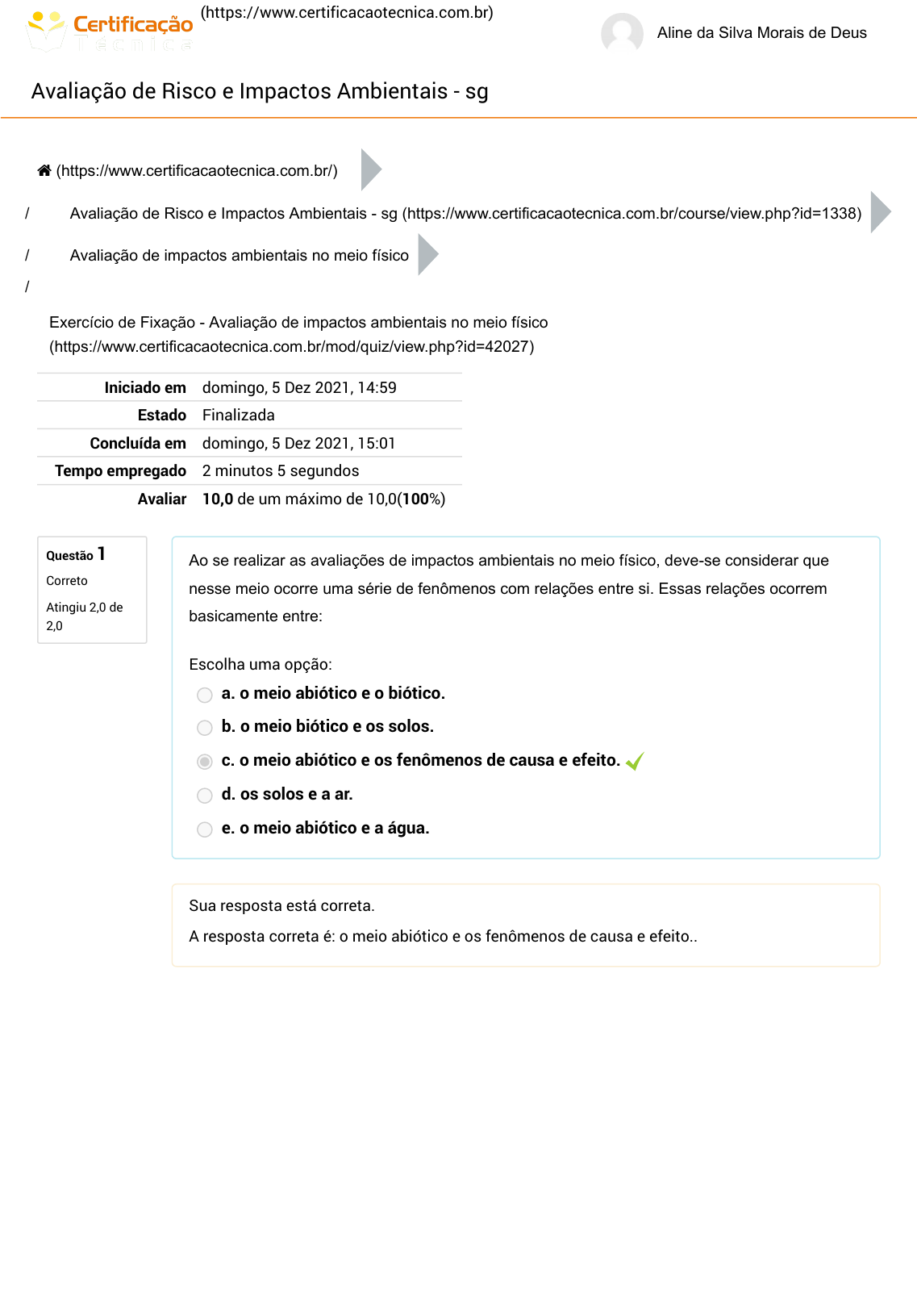 (https://www.certificacaotecnica.com.br) Aline da Silva Morais de Deus Avaliação de Risco e Impactos Ambientais - sg Questão 1 Correto Atingiu 2,0 de 2,0 / / / Iniciado em domingo, 5 Dez 2021, 14:59 Estado Finalizada Concluída em domingo, 5 Dez 2021, 15:01 Tempo empregado 2 minutos 5 segundos Avaliar 10,0 de um máximo de 10,0(100%) Ao se realizar as avaliações de impactos ambientais no meio físico, deve-se considerar que nesse meio ocorre uma série de fenômenos com relações entre si. Essas relações ocorrem basicamente entre: Escolha uma opção: a. o meio abiótico e o biótico. b. o meio biótico e os solos. c. o meio abiótico e os fenômenos de causa e efeito. d. os solos e a ar. e. o meio abiótico e a água. Sua resposta está correta. A resposta correta é: o meio abiótico e os fenômenos de causa e efeito.. (https://www.certificacaotecnica.com.br/) Avaliação de Risco e Impactos Ambientais - sg (https://www.certificacaotecnica.com.br/course/view.php?id=1338) Avaliação de impactos ambientais no meio físico Exercício de Fixação - Avaliação de impactos ambientais no meio físico (https://www.certificacaotecnica.com.br/mod/quiz/view.php?id=42027) https://www.certificacaotecnica.com.br/ https://www.certificacaotecnica.com.br/ https://www.certificacaotecnica.com.br/course/view.php?id=1338 https://www.certificacaotecnica.com.br/mod/quiz/view.php?id=42027 Questão 2 Correto Atingiu 2,0 de 2,0 Questão 3 Correto Atingiu 2,0 de 2,0 Questão 4 Correto Atingiu 2,0 de 2,0 O meio físico pode ter sua dinâmica deflagrada, catalisada, acelerada ou retardada por alguns agentes. Qual dos seguintes impactos está diretamente relacionado ao meio físico? Escolha uma opção: a. O aumento da renda per capta. b. A fragmentação de populações. c. O aumento da violência. d. A perda da qualidade do ar. e. O afugentamento de fauna Sua resposta está correta. A resposta correta é: A perda da qualidade do ar.. Na avaliação de impactos ambientais no meio físico, identifica-se o aspecto "geração de particulados, gases e fumaça" na área de influência direta (AID). Qual exemplo de monitoramento poderia ser proposto? Escolha uma opção: a. Monitoramento atmosférico das fontes emissoras. b. Conhecimento da direção dos ventos na região c. Conhecimento das características dos solo da região. d. Monitoramento das chuvas na região. e. Observação da AID. Sua resposta está correta. A resposta correta é: Monitoramento atmosférico das fontes emissoras.. Na avaliação de impactos ambientais no meio físico, podem-se avaliar diferentes indicadores para um estudo detalhado nas áreas de influência, como: Escolha uma opção: a. Geração de gases. b. Desmatamento. c. Geração de efluentes. d. Plantio de vegetação nativa. e. Dinâmica da água no subsolo. Sua resposta está correta. A resposta correta é: Dinâmica da água no subsolo.. Questão 5 Correto Atingiu 2,0 de 2,0 Qual das opções a seguir apresenta exemplos de componentes que agem ativamente nos processos físicos? Escolha uma opção: a. Energia elétrica b. Fauna e flora c. Energia gravitacional d. Rochas e. Água Sua resposta está correta. A resposta correta é: Energia gravitacional.