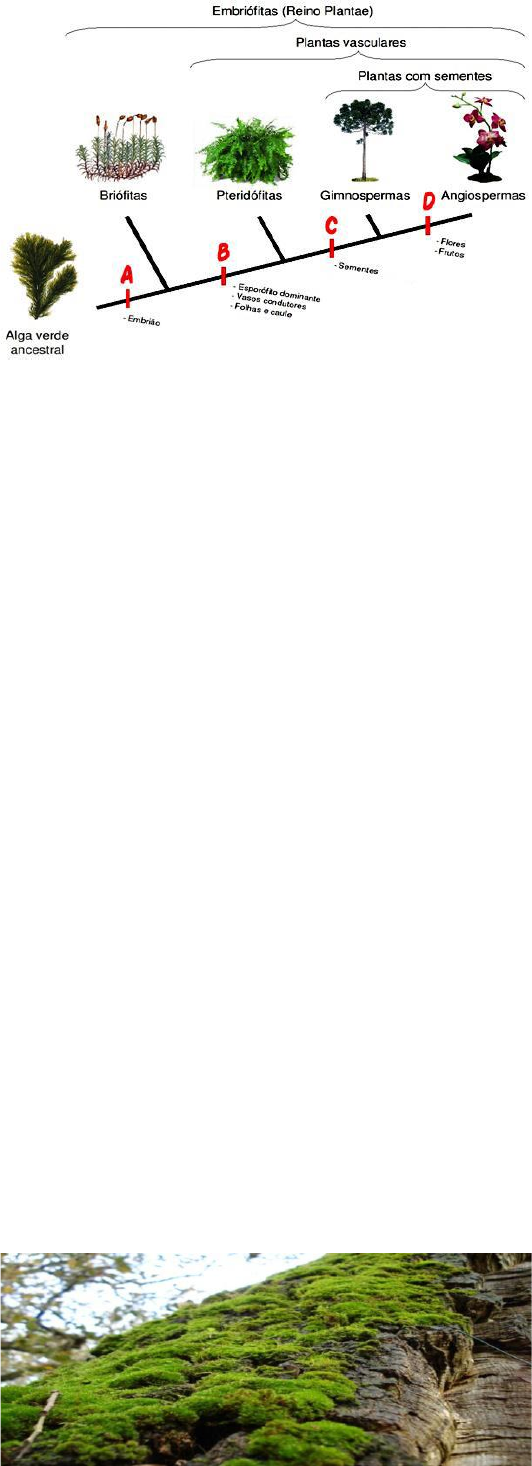 BOTÂNICA Fala, pessoal! Tudo certinho? Vamos iniciar o estudo das plantas, um universo magnífico. Infelizmente é um conteúdo com muitos “nomes” complicados, mas lembre- se: minha missão é facilitar para você, vamos juntos! AULA 1 – CARACTERÍSTICAS GERAIS DAS PLANTAS - São eucariontes. - São autótrofos fotossintetizantes (cloroplasto – possui outros plastos). - São multicelulares. - Possuem embrião e esse se desenvolve as custas do organismo materno. - Possui parede celular de celulose. - Reserva de energia em forma de amido. - Tecidos verdadeiros. - Fecundação é interna. - As plantas evoluíram de algas semelhantes às algas verdes atuais (que viveram a aproximadamente 500 milhões de anos atrás). - Características como a parede celular composta principalmente por celulose e a existência de clorofila a e b nos cloroplastos indicam o parentesco evolutivo entre as plantas e as algas. - Apesar de ter algumas características em comum, as plantas adquiriram muitas outras características que diferem das algas, as mais evidentes estão relacionadas ao habitat terrestre, o que trouxe uma vantagem evolutiva. Veja; - As plantas ao conquistarem o ambiente terrestre tinham um grande desafio: evitar a perda de água. Para isso apresentam em sua superfície uma camada de células muito unidas entre si, a epiderme. Essa camada reveste o corpo das plantas e evita a desidratação. Sobre a epiderme existe a cutícula: uma camada de cera (lipídio) que também evita a desidratação. - As plantas completam o seu ciclo de vida em duas geração (alternância de gerações ou metagênese), uma assexuada que produz esporos (esporófito) e outra sexuada que produz gametas (gametófito). Esporófito: é diplóide e produz por meiose os esporos haplóides, que se desenvolve em um gametófito. Gametófito: é haplóide e gera por mitose os gametas também haplóides. Quando o gameta masculino e feminino se fundem, formam o zigoto diplóide. Esse zigoto se desenvolve em embrião dentro do gametófito feminino (novidade nas plantas). Nesse local o embrião está protegido! - Quando o embrião protegido se desenvolve, forma um novo esporófito. Perceba que o embrião nas plantas é multicelular e maciço. - O desenvolvimento do embrião dentro do gametófito feminino é uma novidade evolutiva nas plantas e por isso elas são chamadas de embriófitas. Ao longo do desenvolvimento das plantas outras novidades evolutivas surgiram: vasos condutores, sementes, flores e frutos. Perceba que existem 4 grupos de plantas: briófitas, pteridófitas, gimnosperma e angiosperma. Classificamos as plantas de acordo com essas características. Veja o que surgiu em cada grupo: A- O embrião maciço se desenvolve protegido no corpo do gametófito feminino / Epiderme e cutícula / tecido verdadeiro /. (Todas as plantas) B- Vasos condutores / órgãos verdadeiros / fase dominante é o esporófito. (Pteridófitas, gimnosperma e angiosperma) C- Semente e grão de pólen. (Gimnosperma e angiosperma) D- Flores e frutos. (Angiosperma) Alguns termos importantes: - As plantas que apresentam vasos condutores (plantas vasculares) são chamadas também de traqueófitas. Te liga que briófita é o único grupo que não é traqueófita. - Fanerógamas são as plantas que possuem sementes, portanto são as gimnospermas e angiospermas. E as criptógamas não possuem sementes (nem flores), portanto são as briófitas e pteridófitas. - As plantas com sementes também são conhecidas por espermatófitas. Vantagens evolutivas das plantas: Perceba que cada uma das novidades evolutivas das plantas trouxe vantagens para o grupo. - Fecundação e desenvolvimento interno deram proteção. Os vasos condutores permitiram o maior tamanho nas plantas, o pólen a flor e o fruto aumentam a chance de dispersão da semente. A semente protege, nutre e também auxilia na dispersão do embrião. AULA 2 – BRIÓFITAS CARACTERÍSTICAS - Primeiras plantas no ambiente terrestre. - Exemplos: musgos e hepáticas. - São avasculares (sem vasos condutores). - Gametas dependem da água para fecundação. - Pequenas e delicadas (maioria não ultrapassa 5 cm de altura – raras espécies atingem até 50 centímetros, na Nova Zelândia). - Não possuem caule, folha nem raiz. - Vivem geralmente em ambientes úmidos e sombreados. - Embora vivam predominantemente em ambientes úmidos, existem musgos que conseguem sobreviver em ambientes mais secos (superfície de rocha, local exposto ao sol etc.) e com temperaturas baixas como em algumas áreas do Círculo Polar Ártico. - Algumas hepáticas vivem em água doce. - Nenhuma vive em ambiente marinho. - Como toda planta, possui alternância de geração em seu ciclo de vida, mas nas briófitas a fase dominante é o gametófito haplóide. DIVERSIDADE DAS BRIÓFITAS Possuem três filos: - Bryophyta (musgos) – cerca de 9500 espécies. - Hepatophyta (hepáticas) – cerca de 6000 espécies. - Antocerophyta (antóceros) – cerca de 100 espécies. ORGANIZAÇÃO CORPORAL DE UMA BRIÓFITA - Exemplo de uma briófita. - O corpo da briófita é chamado de talo. - Esporos são haplóides (n) - Rizoide, cauloide e filóide possuem funções semelhantes as raízes, caules e folhas. CICLO DE VIDA E REPRODUÇÃO DAS BRIÓFITAS Reprodução assexuada: - Fragmentação do corpo. Uma parte do corpo se fragmenta, cai no chão e se desenvolve em um novo gametófito. - Gemulação. Gemas ou propágulos são pequenos pedaços da planta se desprendem e são transportados por gotas de água, originando novas plantas. Reprodução sexuada: Como exemplo, veremos o que os vestibulares podem cobrar, o ciclo de um musgo. Para entender direitinho, veja a imagem e acompanhe cada etapa com a aula e com as etapas listadas abaixo da figura. - A maioria das espécies é dióica, ou seja, cada indivíduo com um sexo, masculino ou feminino. - Anterídios: estrutura reprodutora masculina. Dentro deles são formados os anterozoides – gametas 