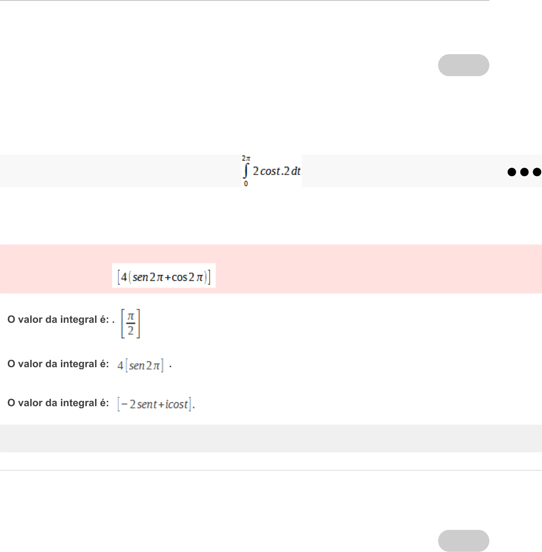 13/12/2022 20:03 Comentários https://sereduc.blackboard.com/ultra/courses/_109118_1/outline/assessment/_5660615_1/overview/attempt/_23589668_1/review/inline-feedback… 1/7 Conteúdo do exercício Ocultar opções de resposta Pergunta 1 0 / 0 Calcule a integral da função: . Incorreta: O valor da integral é: O valor da integral é: . O valor da integral é: . O valor da integral é: Resposta corretaO valor da integral é: 0. Pergunta 2 0 / 0 13/12/2022 20:03 Comentários https://sereduc.blackboard.com/ultra/courses/_109118_1/outline/assessment/_5660615_1/overview/attempt/_23589668_1/review/inline-feedback… 2/7 Ocultar opções de resposta Ocultar opções de resposta As séries de potências são usadas para representar aproximações de algumas funções complexas. Entre elas, destaca-se a série de Taylor, quando em sua fórmula o ponto, assume o valor de zero. Dessa forma, a qual série corresponde? A série exponencial. A série trigonométrica cosseno. A série de Laurent. Resposta corretaA série de MacLaurin. A série Binomial. Pergunta 3 0 / 0 A fórmula integral de Cachy é decorrente do desenvolvimento do coeficiente de uma série de potência bastante conhecida no estudo de funções complexas. Qual é esta série? Incorreta: Decorrente dos termos da série de exponencial. Dos termos da série de Taylor. Resposta corretaDecorrente do coeficiente da série de Laurent. Dos termos e coeficientes das séries trigonométricas. Decorrente do coeficiente da série de MacLaurin. Pergunta 4 0 / 0 13/12/2022 20:03 Comentários https://sereduc.blackboard.com/ultra/courses/_109118_1/outline/assessment/_5660615_1/overview/attempt/_23589668_1/review/inline-feedback… 3/7 Ocultar opções de resposta Ocultar opções de resposta Uma série contínua é considerada uniformemente convergente em uma região conexa R, caso a função f satisfaça condições para que ocorra a convergência. O ponto de divergência da função tende a se aproximar o infinito. O ponto de divergência faz com que a função seja contínua em qualquer região R. Incorreta: O ponto de convergência da função não é uniforme e possui derivadas. Resposta correta O ponto de convergência é uniforme em uma região simplesmente conexa R se função for analítica, contínua e admitir derivada. O ponto de convergência é uniforme em uma região simplesmente conexa se a função for descontínua em um ponto do conjunto D. Pergunta 5 0 / 0 As séries de Laurent podem ser usadas em funções não regulares no ponto z e apresentam uma característica em seus termos que difere das demais séries. Incorreta: As séries de Laurent são decorrentes das séries de Taylor e seus termos são iguais. As séries de Laurent são decorrentes das séries trigonométricas, assim seus termos podem ser expressos em termos de seno e cosseno. As séries de Laurent admitem em seus termos potências com apenas expoente positivo. As séries de Laurent possuem os mesmos termos das séries de MacLaurin. Resposta corretaAs séries de Laurent admitem em seus termos potências com expoente negativo. Pergunta 6 0 / 0 13/12/2022 20:03 Comentários https://sereduc.blackboard.com/ultra/courses/_109118_1/outline/assessment/_5660615_1/overview/attempt/_23589668_1/review/inline-feedback… 4/7 Ocultar opções de resposta Ocultar opções de resposta A fórmula integral de Cachy é aplicada no cálculo de regiões ou ambientes específicos. A fórmula integral de Cauchy é aplicada em uma linha reta. A fórmula integral de Cauchy é aplicada no cálculo de regiões definidas em intervalo aberto. Incorreta: A fórmula integral de Cauchy pode ser aplicada em qualquer superfície e regiões. Resposta correta A fórmula integral de Cauchy é aplicada em regiões definidas sobre ou dentro de um círculo ou circunferência. A fórmula integral de Cauchy pode ser aplicada em superfícies retangulares ou triangulares. Pergunta 7 0 / 0 Encontrar a série de Laurent da função complexa para 1<|z|. A série de Laurent é: A série de Laurent é: A série de Laurent é: 13/12/2022 20:03 Comentários https://sereduc.blackboard.com/ultra/courses/_109118_1/outline/assessment/_5660615_1/overview/attempt/_23589668_1/review/inline-feedback… 5/7 Ocultar opções de resposta Resposta corretaA série de Laurent é . A série de Laurent é : Pergunta 8 0 / 0 Calcule a integral da função: . O valor da integral é:. Resposta corretaO valor da integral é:. O valor da integral é:2 O valor da integral é: O valor da integral é:. Pergunta 9 0 / 0 13/12/2022 20:03 Comentários https://sereduc.blackboard.com/ultra/courses/_109118_1/outline/assessment/_5660615_1/overview/attempt/_23589668_1/review/inline-feedback… 6/7 Ocultar opções de resposta Ocultar opções de resposta Encontre a série de Taylor da função complexa e torno do ponto . A função em termos de série é: . A função em termos de série é: . A função em termos de série é: Resposta corretaA função em termos de série é: . Incorreta: A função em termos de série é: . Pergunta 10 0 / 0 Determine a série de Laurent da função em torno do ponto . A série de Laurent é: . A série de Laurent é: . 13/12/2022 20:03 Comentários https://sereduc.blackboard.com/ultra/courses/_109118_1/outline/assessment/_5660615_1/overview/attempt/_23589668_1/review/inline-feedback… 7/7 Incorreta: A série de Laurent é: . Resposta corretaA série de Laurent é: . A série de Laurent é: .