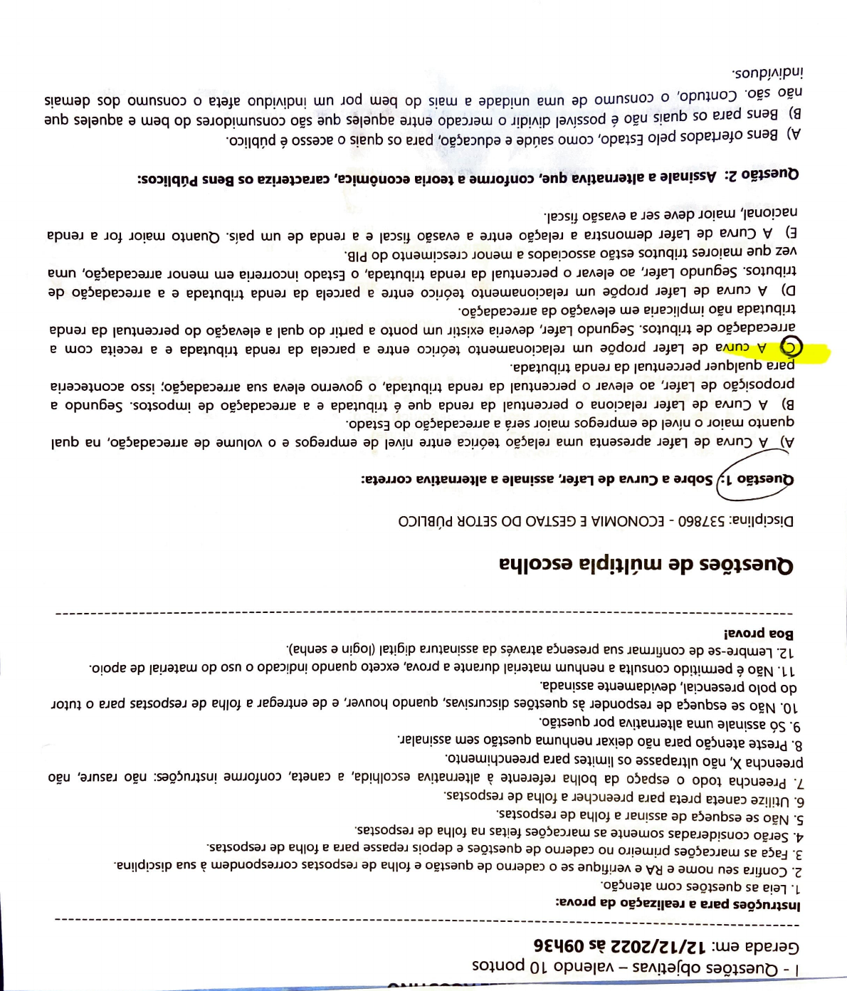 1 -Questões objetivas -valendo 1 O pontos Gerada em: 12/12/2022 às 09h36 -------------------------------------------------------------------------------------------- Instruções para a realização da prova: 1. Leia as questões com atenção. 2. Confira seu nome e RA e verifique se o caderno de questão e folha de respostas correspondem à sua disciplina. 3. Faça as marcações primeiro no caderno de questões e depois repasse para a folha de respostas. 4. Serão consideradas somente as marcações feitas na folha de respostas. 5. Não se esqueça de assinar a folha de respostas. 6. Utilize caneta preta para preencher a folha de respostas. 7. Preencha todo o espaço da bolha referente à alternativa escolhida, a caneta, conforme instruções: não rasure, não preencha X, não ultrapasse os limites para preenchimento. 8. Preste atenção para não deixar nenhuma questão sem assinalar. 9. Só assinale uma alternativa por questão. 1 O. Não se esqueça de responder às questões discursivas, quando houver, e de entregar a folha de respostas para o tutor do polo presencial, devidamente assinada. 11. Não é permitido consulta a nenhum material durante a prova, exceto quando indicado o uso do material de apoio. 12. Lembre-se de confirmar sua presença através da assinatura digital (login e senha). Boa prova! Questões de múltipla escolha Disciplina: 537860 -ECONOMIA E GESTAO DO SETOR PÚBLICO Sobre a Curva de lafer, assinale a alternativa correta: A) A Curva de Lafer apresenta uma relação teórica entre nível de empregos e o volume de arrecadação, na qual quanto maior o nível de empregos maior será a arrecadação do Estado. B) A Curva de Lafer relaciona o percentual da renda que é tributada e a arrecadação de impostos. Segundo a proposição de Lafer, ao elevar o percentual da renda tributada, o governo eleva sua arrecadação; isso aconteceria para qualquer percentual da renda tributada. © A curva de Lafer propõe um relacionamento teórico entre a parcela da renda tributada e a receita com a arrecadação de tributos. Segundo Lafer, deveria existir um ponto a partir do qual a elevação do percentual da renda tributada não implicaria em elevação da arrecadação. D) A curva de Lafer propõe um relacionamento teórico entre a parcela da renda tributada e a arrecadação de tributos. Segundo Lafer, ao elevar o percentual da renda tributada, o Estado incorreria em menor arrecadação, uma vez que maiores tributos estão associados a menor crescimento do PIB. E) A Curva de Lafer demonstra a relação entre a evasão fiscal e a renda de um país. Quanto maior for a renda nacional, maior deve ser a evasão fiscal. Questão 2: Assinale a alternativa que, conforme a teoria econômica, caracteriza os Bens Públicos: A) Bens ofertados pelo Estado, como saúde e educação, para os quais o acesso é público. B) Bens para os quais não é possível dividir o mercado entre aqueles que são consumidores do bem e aqueles que não são. Contudo, o consumo de uma unidade a mais do bem por um individuo afeta o consumo dos demais indivíduos. C) Bens que o Estado oferece ao público porque os mercados são incapazes de fazê-lo, uma vez que a demanda é muito alta. D) São os Bens do Estado, como as edificações públicas, inalienáveis, e pertencem a toda a sociedade. São bens não rivais, ou seja, o consumo de uma unidade a mais do bem por um indivíduo não afeta o consumo '-fos demais indivíduos. São bens não divisíveis e não excludentes. Questão 3: Ao longo das diversas fases de atuação do Estado na economia, alternaram-se fases nas quais o seu nível de atuação se intensificava ou diminuía. Após a grande depressão de 1929, intensificou-se a intervenção do Estado na promoção de benefícios sociais com o objetivo de garantir a todos os cidadãos padrões mínimos de vida digna. Como ficou conhecido esse modelo de atuação estatal? A) Estado liberal. B) Estado socialista. C) Estado justo. (g) Estado de bem-estar social. E) Estado populista. Questão 4: Assinale a alternativa que apresenta corretamente princípios dos sistemas tributários: A) Arrecadação máxima, neutralidade e eficiência. ''© Neutralidade, equidade tributária e simplicidade. C) Redução de custos, mínima interferência e eficiência. D) Evasão fiscal, neutralidade e justiça tributária. E) Eficiência da arrecadação, tributação mínima e justiça tributária. Questão 5: A atuação dos governos para realizar as atividades que são de sua competência pressupõe um corpo funcional capaz de por em prática tais atividades. A administração desse corpo técnico é conhecida como burocracia estatal. A alternativa que melhor descreve a burocracia estatal é: @ Tipo de administração caracterizada por uma hierarquia formal de autoridade, na qual existem regras definidas para a classificação e solução de problemas. 8) Corpo funcional formado pelos representantes eleitos e por seus indicados para gerir a máquina pública. C) Funcionamento moroso e detalhista dos funcionários públicos na execução de suas tarefas. D) Corpo técnico estatal capaz de atuar de modo autônomo às diretrizes de um governo. E) Corpo de comissionados contratados exclusivamente para realizar as operações políticas de governo. Questão 6: A teoria econômica pressupõe que a ação de indivíduos racionais em mercados competitivos seja capaz de produzir mercados eficientes em termos de Pareto. Contudo, nem todos os mercados são caracterizados pela concorrência perfeita (bens homogêneos, informação perfeita, firmas sem poder de interferência nos preços e sem barreiras à entrada), e, assim, essa mesma teoria pressupõe que o Estado deve atuar nesses mercados, nos quais existem falhas. Assinale a alternativa que apresenta corretamente as falhas de mercado: A) Existência de bens públicos, mercados com excesso de demanda, existência de desemprego e mercados com 1!! ação assimétrica. ercados c