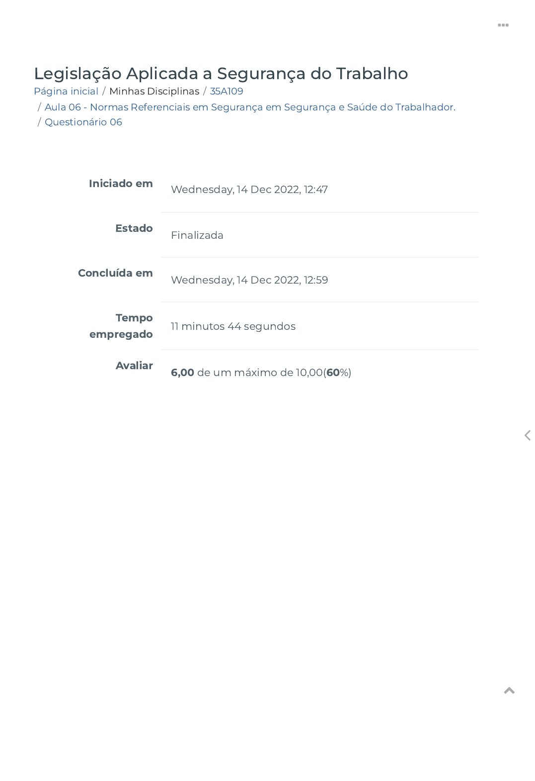Página inicial / Minhas Disciplinas / 35A109 / Aula 06 - Normas Referenciais em Segurança em Segurança e Saúde do Trabalhador. / Questionário 06 Legislação Aplicada a Segurança do Trabalho Iniciado em Wednesday, 14 Dec 2022, 12:47 Estado Finalizada Concluída em Wednesday, 14 Dec 2022, 12:59 Tempo empregado 11 minutos 44 segundos Avaliar 6,00 de um máximo de 10,00(60%) https://ava.politecnicabr.com.br/ https://ava.politecnicabr.com.br/course/view.php?id=1031 https://ava.politecnicabr.com.br/course/view.php?id=1031#section-8 https://ava.politecnicabr.com.br/mod/quiz/view.php?id=25813 https://ava.politecnicabr.com.br/ Questão 1 Incorreto Atingiu 0,00 de 4,00 Julgue a a�rmativa a seguir: “Na ausência de limites de tolerâncias previstos na NR-15 e seus anexos, devem ser utilizados como referência para a adoção de medidas de prevenção aqueles previstos pela American Conference of Governmental Industrial Higyenists – ACGIH.” Escolha uma opção: Verdadeiro Falso https://ava.politecnicabr.com.br/ Questão 2 Correto Atingiu 3,00 de 3,00 Acerca da OIT (Organização Internacional do Trabalho) julgue os itens a seguir. I- A OIT nº 29 trata da discriminação (emprego e ocupação). II- A OIT nº 87 trata da liberdade sindical e proteção do direito de sindicalização. III – A OIT nº 100 trata da igualdade de remuneração. IV – A OIT nº 105 trata da inspeção do trabalho. Escolha uma opção: a. Todos os itens estão corretos. b. Apenas os itens II e III estão corretos. c. Apenas os Itens I e IV estão corretos d. Apenas o II item está correto. e. Apenas o item I está incorreto. https://ava.politecnicabr.com.br/ © 2022 - Escola Politécnica Brasileira Questão 3 Correto Atingiu 3,00 de 3,00 As Normas Regulamentadoras são emitidas pelo OIT - Organização Internacional do Trabalho. Escolha uma opção: Verdadeiro Falso Entre em Contato https://www.politecnicabr.com.br 0800 084 2627 0800 084 2627 Links Úteis Dicas da nossa Diretora Acadêmica Planner de Estudos Declaração de Matrícula Orientações do AVA Abertura de Ticket Fale com o Tutor Cronograma de Estudos Manual de Estágio Manual de Competência Siga-nos nas redes sociais https://ava.politecnicabr.com.br/mod/quiz/0 https://www.politecnicabr.com.br/ https://soundcloud.com/user-501638417/sets/escola-politecnica-brasileira https://storage.googleapis.com/sirius-pubstore/semestre_plannerdeestudo%20poli.pdf https://storage.googleapis.com/sirius-pubstore/declaracao_matricula.pdf https://storage.googleapis.com/sirius-pubstore/orientacoes_ava.pdf https://storage.googleapis.com/sirius-pubstore/abertura_ticket.pdf https://storage.googleapis.com/sirius-pubstore/fale_com_tutor.pdf https://storage.googleapis.com/sirius-pubstore/cronograma_estudos.pdf https://storage.googleapis.com/sirius-pubstore/manual_estagio.pdf https://storage.googleapis.com/sirius-pubstore/manual_competencia.pdf https://www.facebook.com/politecnicabr https://www.instagram.com/politecnicabr_oficial https://ava.politecnicabr.com.br/ https://ava.politecnicabr.com.br/