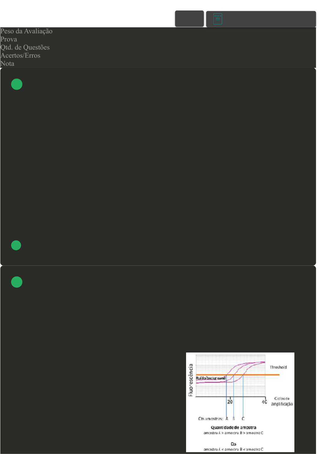 13/12/2022 08:06 Avaliação I - Individual about:blank 1/6 Prova Impressa GABARITO | Avaliação I - Individual (Cod.:739228) Peso da Avaliação 1,50 Prova 50474181 Qtd. de Questões 10 Acertos/Erros 9/1 Nota 9,00 A escolha do gel para a técnica de eletroforese deve-se dar através do tamanho da molécula a ser isolada e do objetivo do isolamento. Com base nas matrizes de agarose e poliacrilamida para a técnica de eletroforese em gel, analise as sentenças a seguir: I- A poliacrilamida pode separar fragmentos de DNA com até mesmo uma única base nitrogenada de diferença. II- A agarose, apresenta menor resolução, ou seja, cada banda presente no gel, representa um agrupamento de moléculas de tamanho semelhantes. III- No gel de poliacrilamida, uma menor faixa de tamanho das moléculas pode se movimentar, enquanto fragmentos maiores de DNA podem migrar facilmente no gel de agarose. Assinale a alternativa CORRETA: A Somente a sentença I está correta. B Somente a sentença III está correta. C Somente a sentença II está correta. D As sentenças I, II e III estão corretas. O gráfico a seguir ilustra uma curva de amplificação da PCR em tempo real. De acordo com a interpretação do gráfico, classifique V para as sentenças verdadeiras e F para as falsas: ( ) A amostra A possui maior quantidade do gene avaliado, uma vez que possui menor Ct. ( ) A amostra C possui maior quantidade de amostra, pois quanto maior o Ct, maior a quantidade de material disponível para iniciar a amplificação do gene de interesse. ( ) A amostra B ultrapassou o Threshold após o ciclo 20, apresentando uma quantidade intermediária de amostra, quando comparadas às amostras A e C. Assinale a alternativa que apresenta a sequência CORRETA: VOLTAR A+ Alterar modo de visualização 1 2 13/12/2022 08:06 Avaliação I - Individual about:blank 2/6 A V - F - V. B F - F - V. C V - V - F. D V - F - F. A hibridização in situ foi elaborada com o objetivo de isolar e identificar fragmentos, através do anelamento entre duas fitas simples de origens distintas, sejam elas DNA ou RNA. Sobre essa técnica, associe os itens, utilizando o código a seguir: I- Northen-blotting. II- Southern-blotting. III- Hibridização in situ. ( ) Técnica que utiliza sondas de ácidos nucleicos, com marcação química, no local em que a molécula de interesse deve ser encontrada (RNA dentro da célula, DNA específico em cromossomos). ( ) Técnica que avalia padrões de sequências de nucleotídeos de genes do DNA e utiliza sondas de DNA molde, os quais são marcados com radiação ou quimicamente. ( ) Nesta técnica, o RNA mensageiro (mRNA) é utilizado a fim de buscar comparar situações distintas, como, por exemplo, utilizar amostras controle como padrão para expressão do gene de interesse e, assim, comparar com a amostra de interesse. Assinale a alternativa que apresenta a sequência CORRETA: A I - III - II. B I - II - III. C III - II - I. D II - I - III. Para construir uma biblioteca de DNA, utiliza-se técnicas de clivagem com enzimas de restrição e clonagem em vetor. Com base nas etapas para construção de uma biblioteca de DNA, ordene os itens a seguir: I- Fragmentos de DNA são inseridos em vetores idênticos e ligados através da DNA ligase. II- Clivado do DNA com uma enzima de restrição, formando centenas a milhares de fragmentos de DNA. III- Inserção do vetor em células hospedeiras, produzindo a clonagem dos diferentes fragmentos. IV- Extrair e isolar o DNA genômico de uma célula, tecido ou até mesmo de um organismo. Assinale a alternativa que apresenta a sequência CORRETA: A I - IV - III - II. B IV - II - I - III. 3 4 13/12/2022 08:06 Avaliação I - Individual about:blank 3/6 C I - III - II - IV. D IV - II - III - I. Através da técnica de eletroforese, ocorre a separação de moléculas em populações de tamanhos semelhantes, as quais são visualizadas como bandas no gel através de marcadores específicos. Sobre os marcadores para técnica de eletroforese em gel, assinale a alternativa CORRETA: A O marcador ideal é o brometo de etídio, um corante fluorescente, que se liga ao DNA ou RNA e possibilita a sua visualização através de luz ultravioleta (UV). B O corante ideal para eletroforese de DNA e RNA é aquele que não se liga ao DNA ou ao RNA, ficando somente na solução tampão da técnica. C O marcador ideal para a técnica de eletroforese em gel será aquele capaz de separar as bandas de DNA em diferentes tons de cores. D O corante mais utilizado para marcação de DNA é o azul de brometo. O advento das técnicas de biologia molecular possibilitou o estudo genético de diversos organismos, incluindo os seres humanos. Esses estudos têm trazido ganhos significativos no entendimento de doenças, síndromes e mecanismos de ação de substâncias. De acordo com a importância das técnicas de clonagem do DNA e construção de bibliotecas genômicas, classifique V para as sentenças verdadeiras e F para as falsas: ( ) As enzimas de restrição são utilizadas na construção de bibliotecas de DNA, com o objetivo de fragmentar o DNA genômico, já que podem ser conhecidas como tesouras moleculares. ( ) Os vetores são essenciais na técnica de clonagem e são utilizados tanto na construção de bibliotecas de DNA, quanto de cDNA, uma vez que carregam os fragmentos de DNA ou o cDNA extraído. ( ) As bibliotecas de cDNA são construídas a partir da extração do DNA de células ou tecidos, que posteriormente é submetido à clonagem do DNA. ( ) O mRNA é convertido em cDNA pela transcrição reversa, para então serem introduzidos em vetores e submetidos ao processo de clonagem para originar as bibliotecas de cDNA. Assinale a alternativa que apresenta a sequência CORRETA: A F - F - V - F. B V - F - F - V. C V - F - V - V. D V - V - F - V. O processo de replicação do DNA é relativamente simples, envolvendo diversas enzimas para que a síntese de uma nova fita de DNA seja realizada. Com base nas