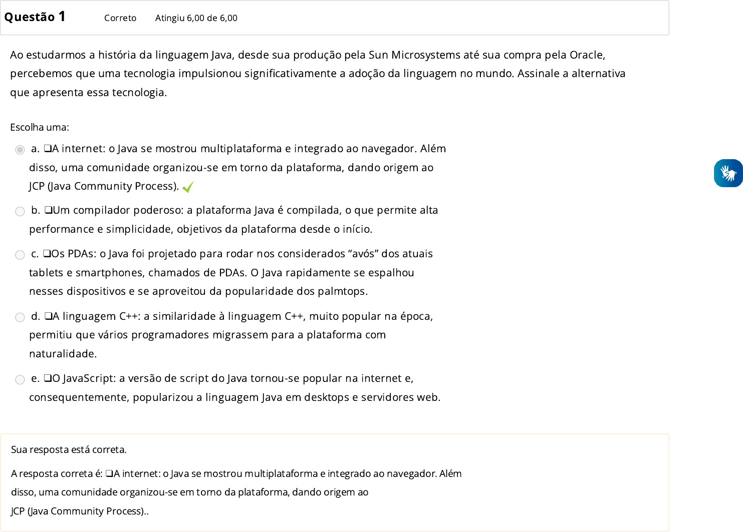 Questão 1 Correto Atingiu 6,00 de 6,00 Ao estudarmos a história da linguagem Java, desde sua produção pela Sun Microsystems até sua compra pela Oracle, percebemos que uma tecnologia impulsionou signi�cativamente a adoção da linguagem no mundo. Assinale a alternativa que apresenta essa tecnologia. Escolha uma: a. ❑A internet: o Java se mostrou multiplataforma e integrado ao navegador. Além disso, uma comunidade organizou-se em torno da plataforma, dando origem ao JCP (Java Community Process). b. ❑Um compilador poderoso: a plataforma Java é compilada, o que permite alta performance e simplicidade, objetivos da plataforma desde o início. c. ❑Os PDAs: o Java foi projetado para rodar nos considerados “avós” dos atuais tablets e smartphones, chamados de PDAs. O Java rapidamente se espalhou nesses dispositivos e se aproveitou da popularidade dos palmtops. d. ❑A linguagem C++: a similaridade à linguagem C++, muito popular na época, permitiu que vários programadores migrassem para a plataforma com naturalidade. e. ❑O JavaScript: a versão de script do Java tornou-se popular na internet e, consequentemente, popularizou a linguagem Java em desktops e servidores web. Sua resposta está correta. A resposta correta é: ❑A internet: o Java se mostrou multiplataforma e integrado ao navegador. Além disso, uma comunidade organizou-se em torno da plataforma, dando origem ao JCP (Java Community Process).. Questão 2 Correto Atingiu 6,00 de 6,00 Considere as declarações de variável e constantes a seguir. Sobre elas, assinale a alternativa correta. Escolha uma: a. Por conter um único caractere, a variável d é do tipo char. b. A constante c é do tipo int. c. A variável b é do tipo �oat. d. A variável a é do tipo int. e. A declaração da variável c é inválida. Sua resposta está correta. A resposta correta é: A constante c é do tipo int.. Questão 3 Correto Atingiu 6,00 de 6,00 Assinale a alternativa que contém apenas atributos da classe Carros. Escolha uma: a. ❑Cor, tamanho, peso, pneus e motor. b. ❑Cor, peso, ligar e transportar passageiros. c. ❑Cor, peso, tamanho, envergadura da asa e peso. d. ❑Amarelo, motor 1.6 e tração 4x4. e. ❑Ligar, transportar, frear e rebocar. Sua resposta está correta. A resposta correta é: ❑Cor, tamanho, peso, pneus e motor.. Questão 4 Correto Atingiu 6,00 de 6,00 Considere as associações a seguir: a) O �lamento de uma lâmpada b) Um presente em uma embalagem c) Uma caneta e um papel Assinale a alternativa que indica corretamente se essas associações são agregação ou composição. Escolha uma: a. ❑Composição – agregação – agregação. b. ❑Composição – composição – agregação. c. ❑Agregação – composição – composição. d. ❑Todas são composição. e. ❑Todas são agregação. Sua resposta está correta. A resposta correta é: ❑Composição – agregação – agregação.. Questão 5 Correto Atingiu 6,00 de 6,00 Para implementar boas abstrações, objetos “escondem” a funcionalidade interna de seus usuários, enquanto expõem uma interface pública simples. Assinale a alternativa que representa o nome dessa característica. Escolha uma: a. ❑Modi�cadores de acesso. b. ❑Métodos de acesso (getters e setters). c. ❑Encapsulamento. d. ❑Empacotamento. e. ❑Imutabilidade. Sua resposta está correta. A resposta correta é: ❑Encapsulamento.. Questão 6 Correto Atingiu 6,00 de 6,00 Sobre a relação de herança, assinale a alternativa correta: Escolha uma: a. ❑É implementada no Java por meio da palavra-chave extends, colocada no topo da classe. b. ❑É implementada no Java por meio da palavra-chave abstract, colocada em classes e métodos. c. ❑Tem como foco reduzir a duplicação de código, já que todo código duplicado vai para a superclasse. d. ❑É preferível a relação de composição, uma vez que se pode compartilhar também atributos. e. ❑A palavra-chave �nal deve ser utilizada em métodos para que �quem mais otimizados. Sua resposta está correta. A resposta correta é: ❑É implementada no Java por meio da palavra-chave extends, colocada no topo da classe.. Questão 7 Correto Atingiu 6,00 de 6,00 Sobre generics, assinale a alternativa correta: Escolha uma: a. ❑O parâmetro formal é uma espécie de variável, que será substituída por um tipo de dado, em vez de um valor. b. ❑O método void m(List<Object>) poderia ser chamado com um List<String> pois String é �lho de Object. c. ❑Para que um método aceite como parâmetro de entrada uma classe de lista genérica que aceite o tipo Animal e seus �lhos, sua declaração será Lista<? super Animal>. d. ❑Generics é um recurso para tornar classes �exíveis. Desse modo, quanto mais frequente o seu uso, melhor. e. ❑O recurso de Type erasure é quando se utiliza um objeto que permite um tipo T sem especi�car esse tipo. Sua resposta está correta. A resposta correta é: ❑O parâmetro formal é uma espécie de variável, que será substituída por um tipo de dado, em vez de um valor.. Questão 8 Incorreto Atingiu 0,00 de 6,00 Sobre os tipos de coleções que implementam a interface Collection, assinale a alternativa correta: Escolha uma: a. ❑São três tipos: listas, conjuntos e mapas. b. ❑São quatro tipos: �las, listas, conjuntos e mapas. c. ❑São dois tipos: ArrayList e LinkedList. d. ❑São cinco tipos: ArrayList, LinkedList, HashSet, TreeSet, LinkedHashSet. e. ❑São três tipos: �las, listas e conjuntos. Sua resposta está incorreta. A resposta correta é: ❑São três tipos: �las, listas e conjuntos.. Questão 9 Correto Atingiu 6,00 de 6,00 Sobre as listas, assinale a alternativa correta: Escolha uma: a. ❑A classe ArrayList, apesar de dinâmica, baseia-se em um vetor. Já a classe LinkedList possui elementos dispersos na memória em estruturas de nós. b. ❑Ambas as classes permitem acesso por índice, porém o método get LinkedLists é mais e�ciente 