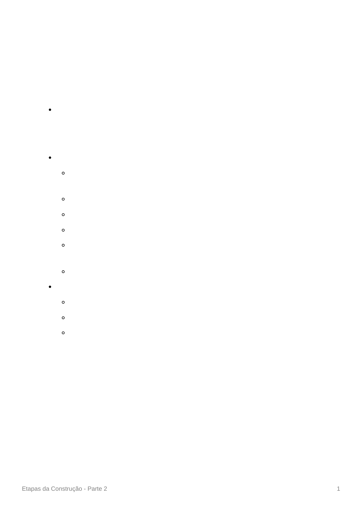 Etapas da Construção - Parte 2 1 Etapas da Construção - Parte 2 Estrutura Função: resistir e distribuir os carregamentos oriundos de ações permanentes (peso próprio dos elementos que compõem a construção e cargas de empuxo) e ações variáveis (peso variável por aglomeração de pessoas, objetos, cargas móveis, vento, terremoto. Vantagens do uso do concreto armado: Resistência elevada à compressão (devido ao concreto) e resistente aos outros tipos de esforços solicitantes, como de tração (devido ao aço). Custo baixo de produção e manutenção. Pode ser moldado de diversas maneiras e formatos. Não necessita de uma mão de obra muito especializada. Boa resistência ao fogo e ao desgaste mecânico, como choques e vibrações. Alta durabilidade. Compatibilidade entre concreto e aço: Coeficientes de dilatação próximos. Boa aderência entre os materiais (devido as nervuras do aço). Concreto fornece ao aço proteção química (impede a corrosão uma vez que materiais com pH básico (alcalino) possuem baixa taxa de corrosão) e mecânica (cobrimento). Etapas da Construção - Parte 2 2 A qualidade do concreto depende: Normas: Execução de estruturas de concreto: Procedimento. (NBR 14931 / 2004) Concreto de cimento Portland: Preparo, controle, recebimento e aceitação. (NBR 12655 / 2015) NBR 6118 (2014) - Projetos de estruturas de concreto: Procedimento. Etapas da Construção - Parte 2 3 Tipos de cimento Portland: Cimento Portland Comum (CP I) → construções que não necessitam de propriedades especiais do cimento. Possui apenas o gesso como aditivo, que serve como um retardador da pega (endurecimento, solidificação ou enrijecimento), oferecendo maior tempo para a aplicação. Tem custo elevado e menor resistência. CP I → Cimento Portland comum. CP I-S → Cimento Portland comum com adição. Cimento Portland Composto (CP II) → recebem a adição de outros materiais. Cimento libera menos calor quando em contato com a água. CP II-E → Cimento Portland Composto com Escória. → considerado um intermediário entre o CP l e CP-S. Recomendado para construções que exijam um desprendimento de calor moderadamente lento. CP II-Z → Cimento Portland Composto com Pozolana. → possui adição de pozolana, oferecendo uma menor permeabilidade. Ideal para obras subterrâneas e em locais em contato com a água. CP II-F → Cimento Portland Composto com Filer. → tem a adição de 6% a 10% de material carbonático. Não é indicado em meios muito agressivos. Cimento Portland de Alto forno (CP III) → alta impermeabilidade e duração, alta resistência à expansão, baixo calor de hidratação e resistência a sulfato. Recomendado para obras de grande porte e agressividade, como barragens, esgotos, fundações de máquinas e afluentes industriais. Menos poroso e mais durável, atingindo resistências maiores que os cimentos convencionais. Etapas da Construção - Parte 2 4 Cimento Portland Pozolânico (CP IV) → recomendável para a concretagem de grandes volumes e sob elevadas temperaturas, devido ao baixo calor de hidratação. Pouco poroso, o que o torna resistente à ação da água do mar e esgoto. Cimento Portland de Alta resistência inicial (CP V-ARI) → atinge uma elevada resistência em um curto intervalo de tempo, provocado pela alta reatividade nas primeiras horas de aplicação. atinja resistências maiores que os cimentos convencionais. Ideal para obras industriais que exigem um tempo de deformação menor. Cimento Portland Resistente a sulfatos (RS) → obras em redes de esgoto, ambientes industriais e em construções em contato com a água do mar. Cimento Portland de Baixo calor de hidratação (BC) → retardar o despendimento de calor em grandes peças de concreto, evitando o aparecimento de fissuras de origem térmica, devido ao calor criado durante a hidratação do cimento. Cimento Portland Branco (CPB) → usado como cimento estrutural ou não estrutural em rejuntes de cerâmicas. Alvenaria e esquadria Alvenaria: Resistência mecânica - aos movimentos térmicos e pressão do vento. Isolamento térmico e acústico, e resistência ao fogo. Estanqueidade (impedir infiltrações) e durabilidade. Segurança - resistir a impactos e servir de base para revestimento em geral. Blocos e tijolos: Regularidade na forma e dimensões. Arestas vivas e resistentes, ausência de fissuras e impurezas. Homogeneidade da massa e coloração. Resistência à compressão compatível ao uso. Facilidade nos cortes (tijolos de vedação). Baixa absorção de água. Etapas da Construção - Parte 2 5 Argamassa de assentamento e encunhamento: Argamassa mista convencional (cimento, cal e areia) ou industrializada. Unir as unidades de alvenaria e selar as juntas. Distribuir uniformemente as cargas atuantes. Absorver as deformações naturais. 💡 Encunhamento: ligação da parede de vedação com os elementos estruturais viga e laje. - Função: distribuir e absorver as cargas sobre a alvenaria, e promover o fechamento da última fiada. - Tipos: argamassas com elastômeros, esferas de isopor, placas de Neoprene, poliuretano expandido, entre tantos outros. Vergas e contravergas: Etapas da Construção - Parte 2 6 Pisos e pavimentações Piso: Sempre vai ter uma camada de regularização do terreno, feita com concreto magro, comumente chamada de contrapiso ou base. Traço: 1:4:8 / 1:3:5 / 1:3:6 Espessura mínima: 5cm (em local com trânsito de veículos adotar 7cm). Terreno deve estar nivelado e compactado. Argamassa de regularização (em ambientes sem revestimento cerâmico): Traço: 1:4 (cimento e areia). Espessura normalmente de 2cm. Argamassa colante (para aplicação de revestimento cerâmico): AC-I → revestimentos internos, exceto para saunas, churrasqueiras, estufas e outros. AC-II → ambientes externos com pouca umidade (possuem propriedades que absorvem as influências da temperatura e da umidade). Etapas da Construção - Parte 2 7 AC-III → condiçõ