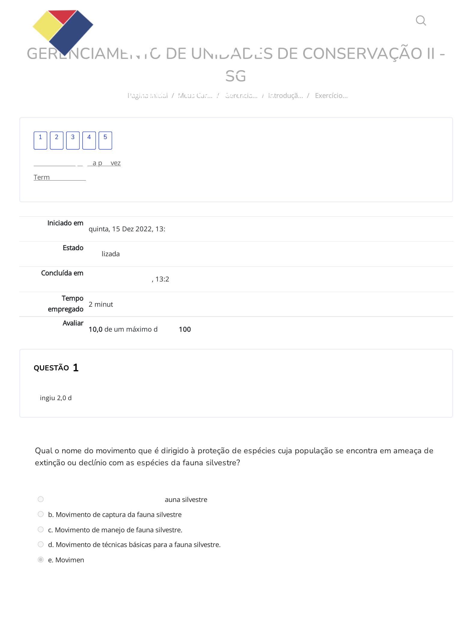 15/12/2022 13:20 Exercício de Fixação - Introdução ao estudo da fauna silvestre: Revisão da tentativa https://cpetead.com.br/mod/quiz/review.php?attempt=3339719&cmid=48372 1/4 GERENCIAMENTO DE UNIDADES DE CONSERVAÇÃO II - SG Página Inicial / Meus Cur… / Gerencia… / Introduçã… / Exercício… Iniciado em quinta, 15 Dez 2022, 13:17 Estado Finalizada Concluída em quinta, 15 Dez 2022, 13:20 Tempo empregado 2 minutos 34 segundos Avaliar 10,0 de um máximo de 10,0(100%) QUESTÃO Correto Atingiu 2,0 de 2,0 Mostrar uma página por vez Terminar revisão 1 2 3 4 5 1 Qual o nome do movimento que é dirigido à proteção de espécies cuja população se encontra em ameaça de extinção ou declínio com as espécies da fauna silvestre? Escolha uma opção: a. Movimento de contenção física da fauna silvestre b. Movimento de captura da fauna silvestre c. Movimento de manejo de fauna silvestre. d. Movimento de técnicas básicas para a fauna silvestre. e. Movimento de conservação. Sua resposta está correta. A resposta correta é: Movimento de conservação. https://cpetead.com.br/ https://cpetead.com.br/course/view.php?id=2044 https://cpetead.com.br/mod/quiz/view.php?id=48372 https://cpetead.com.br/mod/quiz/review.php?attempt=3339719&cmid=48372&showall=0 https://cpetead.com.br/mod/quiz/view.php?id=48372 https://cpetead.com.br/ 15/12/2022 13:20 Exercício de Fixação - Introdução ao estudo da fauna silvestre: Revisão da tentativa https://cpetead.com.br/mod/quiz/review.php?attempt=3339719&cmid=48372 2/4 QUESTÃO Correto Atingiu 2,0 de 2,0 QUESTÃO Correto Atingiu 2,0 de 2,0 2 Qual o objetivo da criação do Refúgio de Vida Silvestre (Revis)? Escolha uma opção: a. Sua criação tem como objetivo regulamentar as licenças ou os certi�cados de toda e qualquer espécie de fauna silvestre. b. Sua criação tem como objetivo a liberação do comércio internacional de determinadas espécies para importação, exportação, reexportação e caça em determinados períodos do ano c. Sua criação tem como objetivo de proteger ambientes naturais onde espécies vivem para assegurar as condições para a existência ou a reprodução da fauna residente ou migratória d. Sua criação tem como objetivo a criação da Lei de Proteção à Fauna (Lei nº 5.197/1967) para que, a partir da existência desta legislação, seja liberada a caça da fauna silvestre. e. Sua criação tem como objetivo a criação da Lei dos Crimes Ambientais, a qual estabelece a criação das Unidades de Conservação (UCs) no Brasil. Sua resposta está correta. A resposta correta é: Sua criação tem como objetivo de proteger ambientes naturais onde espécies vivem para assegurar as condições para a existência ou a reprodução da fauna residente ou migratória 3 A partir do estudo da Portaria Ibama nº 93/1998, no Art. 2º, o qual apresenta a de�nição para fauna silvestre como tendo uma subdivisão, assinale a alternativa que apresenta corretamente a diferença entre o conceito de fauna silvestre brasileira e o de fauna silvestre exótica, de acordo com esta legislação. Escolha uma opção: a. A diferença entre os conceitos é que a fauna silvestre brasileira contempla todos os animais que estão ou não incluídos no território brasileiro. b. A partir do estudo da Portaria Ibama nº 93/1998, no Art. 2º, o qual apresenta a de�nição para fauna silvestre como tendo uma subdivisão, assinale a alternativa que apresenta corretamente a diferença entre o conceito de fauna silvestre brasileira e o de fauna silvestre exótica, de acordo com esta legislação. c. A diferença entre os conceitos é que a fauna silvestre brasileira contempla somente a fauna nativa. d. A diferença entre os conceitos é que a fauna silvestre exótica contempla a fauna doméstica. e. A diferença entre os conceitos é que a fauna silvestre exótica engloba todos aqueles animais pertencentes às espécies ou subespécies cuja distribuição geográ�ca não inclui o território brasileiro. Sua resposta está correta. A resposta correta é: A diferença entre os conceitos é que a fauna silvestre exótica engloba todos aqueles animais pertencentes às espécies ou subespécies cuja distribuição geográ�ca não inclui o território brasileiro. 15/12/2022 13:20 Exercício de Fixação - Introdução ao estudo da fauna silvestre: Revisão da tentativa https://cpetead.com.br/mod/quiz/review.php?attempt=3339719&cmid=48372 3/4 QUESTÃO Correto Atingiu 2,0 de 2,0 QUESTÃO Correto Atingiu 2,0 de 2,0 4 Qual foi a lei e o ano que este dispositivo iniciou estabelecendo que a fauna silvestre bem como seus ninhos, abrigos e criadouros naturais são propriedades do Estado? Escolha uma opção: a. Lei nº 6.938, de 1981. b. Lei nº 5.197, de 1967 c. Lei nº 9.605, de 1998. d. Código Civil de 1916. e. Portaria Ibama nº 93, de 1998. Sua resposta está correta. A resposta correta é: Lei nº 5.197, de 1967 5 A fauna silvestre, de acordo com a legislação, é um bem. O atual Código Civil classi�ca os bens, quanto à titularidade, em bens públicos e bens privados. Preceituando em seu artigo 98, qual a titularidade da fauna silvestre e a quem ela pertence? Escolha uma opção: a. A titularidade da fauna silvestre é propriedade unicamente pública no âmbito municipal e pertence ao município da sua localização. b. A titularidade da fauna silvestre é propriedade particular e pertence ao Conselho de Recursos de Fauna e Flora. c. É classi�cada, quanto à titularidade, em bens públicos e bens privados e pertence ao domínio nacional. d. A titularidade da fauna silvestre é tão somente propriedade privada e pertence aos cofres públicos. e. A titularidade da fauna silvestre é propriedade particular e pertence à Federação das Indústrias. Sua resposta está correta. A resposta correta é: É classi�cada, quanto à titularidade, em bens públicos e bens privados e pertence ao domínio nacional. ◄ Conteúdo de Estudo - 