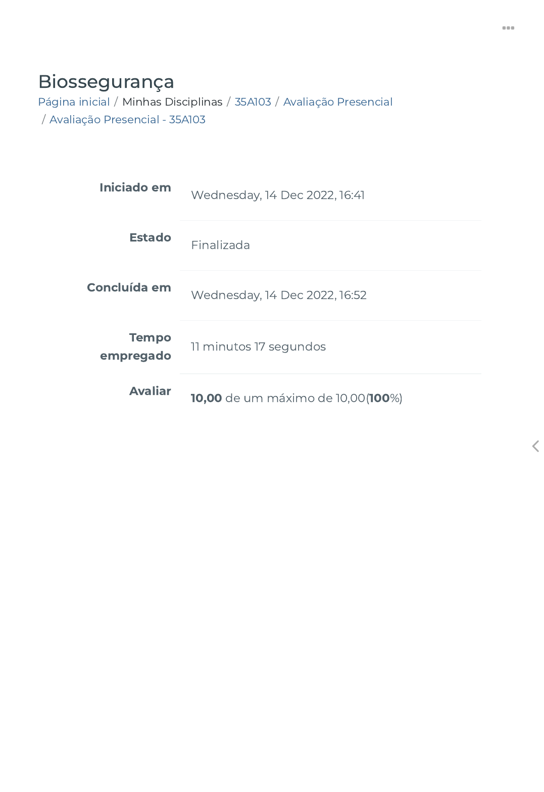 14/12/2022 16:52 Avaliação Presencial - 35A103 https://ava.politecnicabr.com.br/mod/quiz/review.php?attempt=4054577 1/12 Página inicial / Minhas Disciplinas / 35A103 / Avaliação Presencial / Avaliação Presencial - 35A103 Biossegurança Iniciado em Wednesday, 14 Dec 2022, 16:41 Estado Finalizada Concluída em Wednesday, 14 Dec 2022, 16:52 Tempo empregado 11 minutos 17 segundos Avaliar 10,00 de um máximo de 10,00(100%) https://ava.politecnicabr.com.br/ https://ava.politecnicabr.com.br/course/view.php?id=1025 https://ava.politecnicabr.com.br/course/view.php?id=1025#section-10 https://ava.politecnicabr.com.br/mod/quiz/view.php?id=32433 https://ava.politecnicabr.com.br/ 14/12/2022 16:52 Avaliação Presencial - 35A103 https://ava.politecnicabr.com.br/mod/quiz/review.php?attempt=4054577 2/12 Questão 1 Completo Atingiu 1,00 de 1,00 Associe as alternativas corretamente conforme o material de aula. é regulamentado pela NR 09 e tem o objetivo de estabelecer medidas relativas à eliminação, à redução e ao controle de possíveis riscos ambientais. A _________ estabelece que o PPRA deve ser elaborado e implementado por todos os empregadores e todas as instituições que admitam trabalhadores como empregados. é um plano que visa a promover a saúde ocupacional dos trabalhadores. risco biológico é considerado a probabilidade de exposição ocupacional a agentes biológicos, os quais, aqui, são considerados como: microrganismos geneticamente modi�cados ou não, culturas de células, parasitas, toxinas e príons. PPRA NR 09 PCMS No co https://ava.politecnicabr.com.br/ 14/12/2022 16:52 Avaliação Presencial - 35A103 https://ava.politecnicabr.com.br/mod/quiz/review.php?attempt=4054577 3/12 Questão 2 Completo Atingiu 1,00 de 1,00 A biossegurança diz respeito a um conjunto de normas técnicas e equipamentos que visam à prevenção da exposição dos pro�ssionais da saúde, dos laboratórios e do meio ambiente a agentes químicos e biológicos. Assim, os princípios gerais da biossegurança envolvem, exceto a opção: Escolha uma opção: a. Técnicas e práticas de Análise Clínica b. Estrutura física dos ambientes de trabalho c. Análise de riscos d. Descarte apropriado de resíduos https://ava.politecnicabr.com.br/ 14/12/2022 16:52 Avaliação Presencial - 35A103 https://ava.politecnicabr.com.br/mod/quiz/review.php?attempt=4054577 4/12 Questão 3 Completo Atingiu 1,00 de 1,00 Podemos a�rmar que para a promoção da segurança do trabalhador, a NR 32 recomenda a adoção de medidas preventivas para cada possível situação de risco que o pro�ssional da saúde pode encontrar e aconselha a capacitação dos trabalhadores. Escolha uma opção: Verdadeiro Falso https://ava.politecnicabr.com.br/ 14/12/2022 16:52 Avaliação Presencial - 35A103 https://ava.politecnicabr.com.br/mod/quiz/review.php?attempt=4054577 5/12 Questão 4 Completo Atingiu 1,00 de 1,00 Assinale a alternativa que apresenta corretamente as diretrizes da NR 32 quanto aos riscos biológicos. Escolha uma opção: a. O uso de luvas não substitui a lavagem das mãos, é vedado o reencape de agulhas e é proibido o uso de adornos. b. O uso de luvas pode substituir a lavagem das mãos, é vedado o reencape de agulhas e é obrigatório o uso de óculos protetor. c. O uso de luvas pode substituir a lavagem das mãos, é vedado o reencape de agulhas e é obrigatório que cabelos compridos sejam presos. d. O uso de luvas não substitui a lavagem das mãos, as agulhas devem ser reencapadas antes do descarte e os cabelos compridos devem ser presos. e. O uso de luvas não substitui a lavagem das mãos, as agulhas devem ser reencapadas antes do descarte e é proibido o uso de adornos. https://ava.politecnicabr.com.br/ 14/12/2022 16:52 Avaliação Presencial - 35A103 https://ava.politecnicabr.com.br/mod/quiz/review.php?attempt=4054577 6/12 Questão 5 Completo Atingiu 1,00 de 1,00 A limpeza do ambiente de trabalho tem como objetivo a remoção do excesso de sujidade e/ou matéria orgânica, reduzindo, assim,o número de microrganismos presentes. Qual medida é fundamental para a limpeza do ambiente de trabalho? Escolha uma opção: a. Usar escovas em vez de panos. b. Não realizar movimentos circulares. c. Limpar da área menos contaminada para a mais contaminada. d. Usar água e sabão. e. Iniciar a limpeza pelo chão e depois pelas paredes. https://ava.politecnicabr.com.br/ 14/12/2022 16:52 Avaliação Presencial - 35A103 https://ava.politecnicabr.com.br/mod/quiz/review.php?attempt=4054577 7/12 Questão 6 Completo Atingiu 1,00 de 1,00 Associe as alternativas: (De acordo com o Boletim do Conselho Nacional de Saúde (BRASIL, 1998), a classi�cação dos micro-organismos segue uma graduação de grupo de riscos de 1 a 4, conforme segue. são micro-organismos que não constituem riscos relevantes de transmissão de doenças para o homem, nem representam riscos para o meio ambiente. são micro-organismos que podem provocar doenças no homem, mas com pouca probabilidade de alto risco para os pro�ssionais. são micro-organismos que podem causar doenças para o homem e representar sérios riscos aos pro�ssionais e à comunidade em geral; são altamente infecciosos, disseminam-se facilmente e podem ocasionar a morte, como o vírus ebola. são micro-organismos que podem causar doenças graves aos pro�ssionais, como a tuberculose, o HIV e as hepatites B e C. Grupo 1 (ba Grupo 2 (ris Grupo 4 Grupo 3 (ris https://ava.politecnicabr.com.br/ 14/12/2022 16:52 Avaliação Presencial - 35A103 https://ava.politecnicabr.com.br/mod/quiz/review.php?attempt=4054577 8/12 Questão 7 Completo Atingiu 1,00 de 1,00 Os materiais classi�cados como críticos, ou seja, aqueles que penetram na pele, nas mucosas e nos tecidos devem passar por qual processo? Escolha uma opção: a. Lavagem com água e sabão e, depois disso, serem colocados em estufa para secar. b. Esterilização apenas quando houver evidência da presença de microrganismos contagi