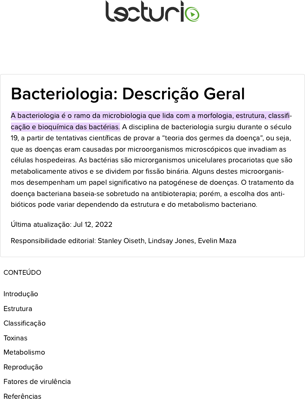 Bacteriologia: Descrição Geral A bacteriologia é o ramo da microbiologia que lida com a morfologia, estrutura, classi�- A disciplina de bacteriologia surgiu durante o séculocação e bioquímica das bactérias. 19, a partir de tentativas cientí�cas de provar a “teoria dos germes da doença”, ou seja, que as doenças eram causadas por microorganismos microscópicos que invadiam as células hospedeiras. As bactérias são microrganismos unicelulares procariotas que são metabolicamente ativos e se dividem por �ssão binária. Alguns destes microorganis- mos desempenham um papel signi�cativo na patogénese de doenças. O tratamento da doença bacteriana baseia-se sobretudo na antibioterapia; porém, a escolha dos anti- bióticos pode variar dependendo da estrutura e do metabolismo bacteriano. Última atualização: Jul 12, 2022 Responsibilidade editorial: Stanley Oiseth, Lindsay Jones, Evelin Maza CONTEÚDO Introdução Estrutura Classi�cação Toxinas Metabolismo Reprodução Fatores de virulência Referências https://www.lecturio.com/author-stanley-oiseth/ https://www.lecturio.com/author-lindsay-jones/ https://www.lecturio.com/author-evelin-maza/ Introdução Bactérias: Entre as primeiras formas de vida na Terra Habitam quase todos os ambientes da Terra Vivem simbioticamente com plantas e animais A maioria das bactérias não foi caracterizada. Características gerais: Seres unicelulares Procariotas: não possuem envelope/membrana nuclear Identi�cação: Através da técnica de coloração de Gram associada à microscopia A cultura de células é útil na sua identi�cação exata. A sensibilidade dos testes é considerada para a escolha do tratamento. Processo de identi�cação laboratorial: A identi�cação de agentes patogénicos bacterianos é um processo passo a passo que geralmente co- meça com a técnica de coloração de Gram, seguida pelo crescimento em cultura isolada. Imagem por Lecturio. https://cdn.lecturio.com/assets/The-process-of-laboratory-diagnosis-2.png Estrutura Estrutura de uma célula procariota: O envelope celular compreende uma membrana plasmática (camada verde) e uma parede celular es- pessa, com peptidoglicanos (camada amarela). Não está presente nenhuma membrana externa lipídica (como visto nas bactérias gram-negativas). A cápsula (camada vermelha) é diferente do envelope celular. Imagem por Lecturio. Organização das células procarióticas: Sem envelope nuclear DNA comprimido em nucleóide Ausência de organelos ligados à membrana O metabolismo ocorre no citoplasma. Parede celular: Proporciona estabilidade mecânica Permite a troca de nutrientes e resíduos Peptidoglicano de mureína: Polímero de açúcar e aminoácidos que forma a base da parede celular N-acetil glucosamina e ácido N-acetilmurâmico reticulados com oligopeptídeos Componente de quase todas as paredes bacterianas (exceção: micoplasmas) https://cdn.lecturio.com/assets/Average-prokaryote-cell.png A espessura da parede celular determina a coloração de Gram. Membrana de plasma: Análoga às membranas procarióticas Composta por proteínas e fosfolípidos Ao contrário dos microorganismos eucariotas, carece de esterois Envolve o citoplasma das células Flagelos: Aproximadamente 50% dos procariontes movem-se com a ajuda de �agelos: Monotríquico: 1 �agelo Politríquico: > 1 �agelo Compostos por uma proteína estrutural, a �agelina, e não estão envolvidos pela membrana celular Localização: monopolar, bipolar ou por todo o corpo Pili (fímbrias): Estruturalmente semelhante ao �agelo, mas muito menor Ajuda na adesão ao hospedeiro/outras bactérias = fator de virulência Utilizado para trocar informações genéticas durante a conjugação Nucleóide: Equivalente funcional do núcleo procariótico Não possui membrana Contém material genético: Geralmente 1 cromossoma Pode possuir plasmídeos adicionais Inclusões e vesículas: As vesículas de gás permitem que as bactérias fotossintéticas �utuem na água. Organelos para fotossíntese e quimiossíntese Os carboxissomas contêm enzimas chave para a �xação de CO . Grânulos de armazenamento (por exemplo, enxofre, fosfato, cálcio, glicogénio) Tabela: Estruturas da célula bacteriana: composição química e funções Estrutura Composição química Função 2 Estrutura Composição química Função Anexos Flagelo Proteínas Mobilidade Pili/fímbrias Glicoproteína Aderência à superfície celular Estruturas especializadas Esporo Revestimento tipo queratina Ácido dipicolínico Peptidoglicano DNA Apenas Gram+ Resistente à desidratação, calor e produtos químicos Envelope celular Cápsula Camada de polissacarí- deo organizada Protege contra a fagocitose Camada de lodo Rede solta de polissacarídeos Media a aderência às superfícies Membrana externa Fosfolípidos Proteínas Apenas Gram- Endotoxina: O lípido A liberta TNF e IL-1. Periplasma Peptidoglicano no meio Acumula componentes que sur- gem das células gram- Parede celular Peptidoglicano na espi- nha dorsal do açúcar A estrutura tipo rede oferece su- porte rígido. Estrutura Composição química Função Membrana citoplasmática Saco de bicamada fosfolipídica Local de armazenamento das enzimas oxidativas e de transporte Os ácidos lipoteicóicos libertam TNF-α e IL-1. TNF: fator de necrose tumoral IL-1: interleucina-1 Classi�cação Coloração de Gram A coloração de Gram é uma técnica que surgiu com o bacteriologista Hans Christian Joa- chim Gram e é utilizada para diferenciar grupos de bactérias com base nas diferenças dos constituintes das suas paredes celulares. Diferenças entre as membranas celulares de bactérias gram-positivas e gram-negativas: As paredes celulares das bactérias gram-positivas e gram-negativas contêm camadas de peptidoglica- nos, porém a camada das bactérias gram-negativas é muito mais �na e envolvida por outra camada externa. Imagem por Lecturio. A coloração de Gram ajuda a dis