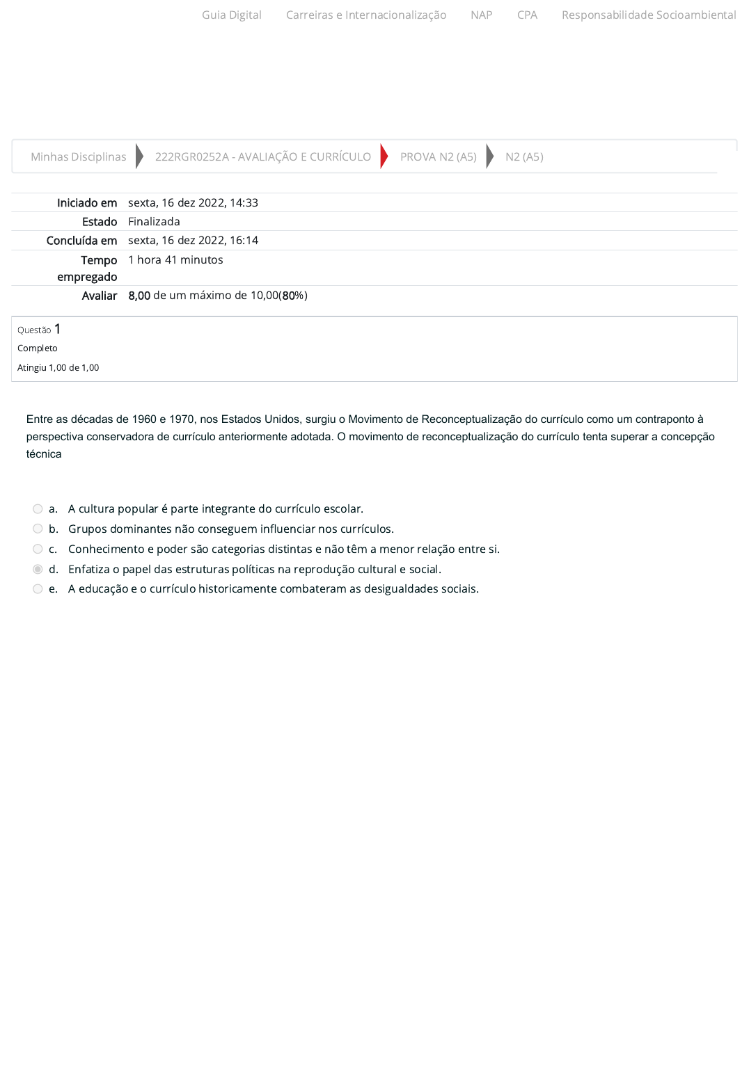 16/12/2022 16:15 N2 (A5): Revisão da tentativa https://ambienteacademico.com.br/mod/quiz/review.php?attempt=1718818&cmid=487334 1/5 Minhas Disciplinas 222RGR0252A - AVALIAÇÃO E CURRÍCULO PROVA N2 (A5) N2 (A5) Iniciado em sexta, 16 dez 2022, 14:33 Estado Finalizada Concluída em sexta, 16 dez 2022, 16:14 Tempo empregado 1 hora 41 minutos Avaliar 8,00 de um máximo de 10,00(80%) Questão 1 Completo Atingiu 1,00 de 1,00 Entre as décadas de 1960 e 1970, nos Estados Unidos, surgiu o Movimento de Reconceptualização do currículo como um contraponto à perspectiva conservadora de currículo anteriormente adotada. O movimento de reconceptualização do currículo tenta superar a concepção técnica do currículo, com contribuições da fenomenologia e do neomarxismo. Nesse sentido, assinale a alternativa que indique como o Movimento de Reconceptualização do Currículo define currículo. a. A cultura popular é parte integrante do currículo escolar. b. Grupos dominantes não conseguem in�uenciar nos currículos. c. Conhecimento e poder são categorias distintas e não têm a menor relação entre si. d. Enfatiza o papel das estruturas políticas na reprodução cultural e social. e. A educação e o currículo historicamente combateram as desigualdades sociais. Guia Digital Carreiras e Internacionalização NAP CPA Responsabilidade Socioambiental https://ambienteacademico.com.br/my/ https://ambienteacademico.com.br/course/view.php?id=17744 https://ambienteacademico.com.br/course/view.php?id=17744§ion=7 https://ambienteacademico.com.br/mod/quiz/view.php?id=487334 https://codely-fmu-content.s3.amazonaws.com/Moodle/GuiaDigital/Guia+digital/index.html https://informa.fmu.br/carreiras/ https://codely-fmu-content.s3.amazonaws.com/Moodle/NAP/inicial/nap/fmu/index.html https://codely-fmu-content.s3.amazonaws.com/Moodle/CPA/landing_CPA/index.html https://portal.fmu.br/sustentabilidade 16/12/2022 16:15 N2 (A5): Revisão da tentativa https://ambienteacademico.com.br/mod/quiz/review.php?attempt=1718818&cmid=487334 2/5 Questão 2 Completo Atingiu 1,00 de 1,00 Questão 3 Completo Atingiu 1,00 de 1,00 Ralph Tyler é um pensador americano que viveu no período pós-guerra em que o setor industrial precisava ser retomado para favorecer o poder econômico e fortalecer uma identidade cultural americana. Sua maior contribuição para o currículo foi colocar o modelo de currículo proposto por Bobbit em prática. A respeito da contribuição de Tyler sobre o currículo, analise as afirmativas a seguir e assinale V para a(s) verdadeira(s) e F para a(s) falsa(s). ( ) Tyler fez uma tentativa de mesclar as propostas do Eficientismo e do Progressivismo. Seu modelo de currículo, no entanto, era essencialmente uma questão técnica. ( ) Tyler propôs que o currículo fosse a simulação de conhecimentos sobre a vida contemporânea e a formação para o trabalho. ( ) Para Tyler, o aspecto mais importante da formulação curricular são os objetivos educacionais. ( ) A orientação psicanalista auxiliou a recortar os objetivos, para que não ficassem muito extensos. Assinale a alternativa que apresenta a sequência correta. a. F, F, V, V. b. V, V, F, F. c. V, F, V, F. d. F, V, V, F. e. F, V, F, V. A avaliação é composta por vários procedimentos que servem como subsídio à prática docente, com o objetivo de melhoria do processo de ensino-aprendizagem. Existem dois tipos de avaliação, a avaliação interna que é realizada pela escola, que tem o objetivo de verificar a aprendizagem do aluno e é determinada em pelo planejamento escolar. A avaliação externa é realizada por agente externo à escola, geralmente por um órgão governamental e é um instrumento que fornece elementos para a formulação e o monitoramento de políticas públicas. Sobre a avaliação do sistema, assinale a alternativa correta: a. A descontinuidade das políticas educacionais em função de mudanças eleitorais, as iniciativas anteriores são esvaziadas pouco interferem nas avaliações. b. A avaliação é sinônimo da qualidade do ensino ou da aprendizagem, e o seu registro expressa essa qualidade. c. A avaliação não expressa as nossas representações sociais. Ela é o re�exo de padrões conscientes de qualidade. d. As políticas nacionais, estaduais e municipais levaram em conta os diferentes dados avaliativos e isso re�ete-se nos resultados das avaliações. e. A avaliação é um diagnóstico da realidade, que serve para o aprimoramento da ação de professores e de estudantes. Guia Digital Carreiras e Internacionalização NAP CPA Responsabilidade Socioambiental https://codely-fmu-content.s3.amazonaws.com/Moodle/GuiaDigital/Guia+digital/index.html https://informa.fmu.br/carreiras/ https://codely-fmu-content.s3.amazonaws.com/Moodle/NAP/inicial/nap/fmu/index.html https://codely-fmu-content.s3.amazonaws.com/Moodle/CPA/landing_CPA/index.html https://portal.fmu.br/sustentabilidade 16/12/2022 16:15 N2 (A5): Revisão da tentativa https://ambienteacademico.com.br/mod/quiz/review.php?attempt=1718818&cmid=487334 3/5 Questão 4 Completo Atingiu 1,00 de 1,00 Questão 5 Completo Atingiu 0,00 de 1,00 Questão 6 Completo Atingiu 1,00 de 1,00 Na primeira metade do século 20, tivemos a promoção das teorias curriculares tradicionais, também conhecidas por teorias técnicas. O currículo tradicional era visto como uma listagem de assuntos impostos que deveriam ser ensinados pelo professor e memorizados pelos estudantes. Nesse sentido, assinale a alternativa que indique qual é a característica da teoria currículo tradicional. a. Almejam que os alunos se tornem cultos e eruditos. b. A quali�cação da mão de obra não é preocupação nesse tipo de currículo. c. Habilidades básicas são pré-requisitos, uma vez que este currículo tem a preocupação com temas abstratos. d. Mensuração de resultados não é uma preocupação no currículo tradicional. e. Querem que o sistema educacional seja tão e�ciente como uma empr