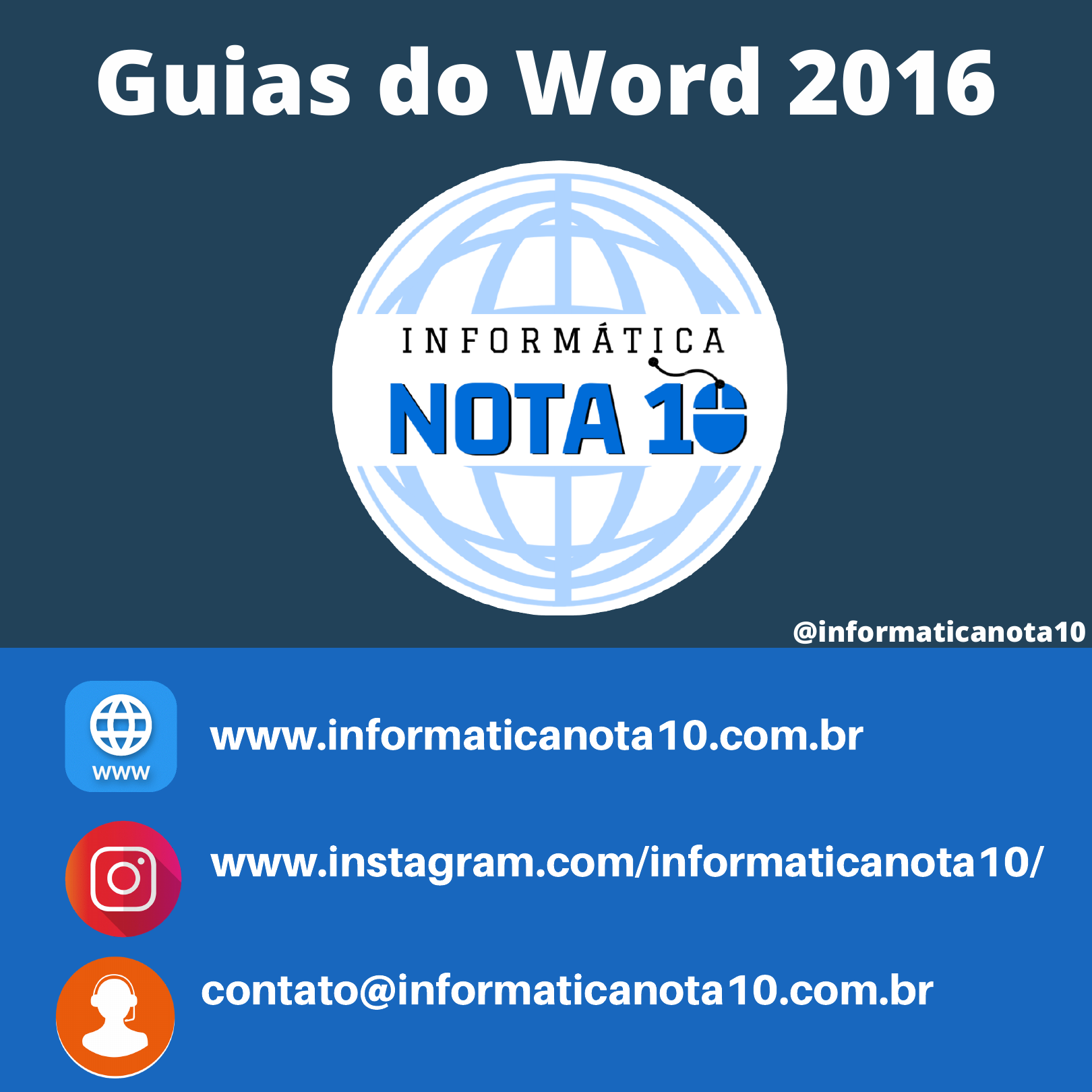 www.informaticanota10.com.br www.instagram.com/informaticanota10/ contato@informaticanota10.com.br Guias do Word 2016 @informaticanota10 https://www.informaticanota10.com.br/ http://www.instagram.com/informaticanota10/ https://www.informaticanota10.com.br/ Guias do Word 2016 Negrito, Itálico, sublinhado, tachado, subscrito,, sobrescrito, cor da fonte, limpar formatação. Marcadores, numeração, vários níveis, alinhar a esquerda/direita, justificar, centralizar, recuo, espaçamento etc. @ Parte 01 - Página Inicial Área de Transferência: Colar, Recortar, Copiar, Pincel de Formatação. Fonte Parágrafo Normal, sem espaçamento, título 1 etc Estilo Edição Comentários Mídia Guias do Word 2016@ Parte 02 - Inserir Páginas Tabelas Ilustrações Links Cabeçalho e RodapéTexto Formatação do Documento Guias do Word 2016@ Parte 03 - Design Plano de Fundo da Página Parágrafo Guias do Word 2016@ Parte 04 - Layout Configurar Página Organizar Legendas Guias do Word 2016@ Parte 05 - Referências Sumário Notas de Rodapé Citações e Bibliografia Índice Visualizar Resultados Guias do Word 2016@ Parte 06 - Correspondências Criar Iniciar Mala Direta Gravar e Inserir Campos Concluir Comentários Comparar Ideias Guias do Word 2016@ Parte 07 - Revisão Revisão de Texto Idioma Proteger Controle Alterações Mostrar Guias do Word 2016@ Parte 08 - Exibir Modos de Exibição Zoom Janela Macros