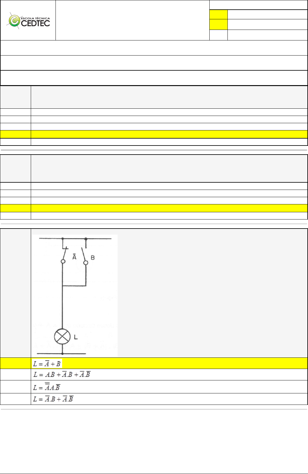 Pincel Atômico - 17/12/2022 12:30:11 1/4 Avaliação Online (Curso Online - Automático) Atividade finalizada em 11/05/2022 12:02:37 (352991 / 1) LEGENDA Resposta correta na questão # Resposta correta - Questão Anulada X Resposta selecionada pelo Aluno Disciplina: CONTROLADOR LÓGICO PROGRAMÁVEL [465378] - Avaliação com 10 questões, com o peso total de 70,00 pontos [capítulos - Todos] Turma: Qualificação: Eletricidade Industrial / Comandos Elétricos - Grupo: QONLINE - Qlet0A250422 [67694] Aluno(a): 91113180 - LEONARDO FERNANDES PEREIRA - Respondeu 9 questões corretas, obtendo um total de 63,00 pontos como nota [350097_1268 91] Questão 001 Qual opção não é uma entrada ou saída digital: Botoeira Relé Chave fim-de-curso X Sensor de deformação (strain gauges) Lâmpada de sinalização [350097_9994] Questão 002 Em relação à programação do PLC, analise as afirmativas e assinale a alternativa correta: I - A forma de programação pode ser remota (off-line) ou programação local (on-line). II - Através de teclados especiais, interfaces gráficas ou através de microcomputador padrão IBM PC. III - A programação é executada e posteriormente transferida para o CLP, via porta de comunicação RS232C ou RS485, USB e Ethernetas recomendações do fabricante e as influências externas. Apenas as afirmativas I e III Apenas a afirmativa I Apenas as afirmativas I e II X Todas as afirmativas Apenas a afirmativa II [350097_1982] Questão 003 Fazendo a simplificação do circuito abaixo, qual a alternativa se refere ao circuito lógico abaixo: X Pincel Atômico - 17/12/2022 12:30:11 2/4 [350097_1269 93] Questão 004 Considere o diagrama abaixo e assuma que todas as entradas estão sendo ligados por botões normalmente abertos (NA), assim, é correto afirmar que a saída F é ENERGIZADA quando: Os botões ligados às entradas D e E estão sendo acionados. Os botões ligados às entradas B e C estão sendo acionados. X Os botões ligados às entradas B e E estão sendo acionados. Os botões ligados às entradas A e C estão sendo acionados. Os botões ligados às entradas A e B estão sendo acionados. [350097_5670 1] Questão 005 Uma serra, por segurança, precisa de dois botões atuados ao mesmo tempo para funcionar. Qual dos diagramas abaixo representa o funcionamento da serra? X [350098_7190 4] Questão 006 Qual das figuras abaixo representa um temporizador do tipo Timer ON Retentivo? Pincel Atômico - 17/12/2022 12:30:11 3/4 X [350098_1269 00] Questão 007 Baseando-se na estrutura interna de um CLP, a memória do programa monitor: Reservada ao programa do usuário, contém alguns Kbytes de palavras-livres que serão processadas pela CPU. Armazena o estado da cada uma das entradas ou saídas em uma região de memória. X É responsável pelo gerenciamento de todas as atividades do CLP. Não pode ser modificado pelo usuário e fica normalmente em memórias dotipo PROM, EPROM, EEPROM. Ele funciona de maneira similar ao Sistema Operacional dos microcomputadores. Converte a tensão alternada da rede elétrica para uma tensão contínua para alimentar os circuitos eletrônicos, as entradas e as saídas. São valores de temporizadores, valores de contadores, códigos de erro, senhas de acesso, etc. São normalmente partes da memória RAM do CLP. [350098_1409 2] Questão 008 Ao dar um pulso na variável Botão1, variável Led irá: Acender e permanecer acesa. X Se manter apagada. Nada vai acontecer. Piscar (acender e logo em seguida apagar). O bloco Timer irá aumentar sua contagem em 1 e a varável Led irá acender. Pincel Atômico - 17/12/2022 12:30:11 4/4 [350096_1268 94] Questão 009 Dada a seguinte figura do funcionamento de um CLP: É característica de transferir os dados para a memória: Após consultar a Memória Imagem das Entradas, atualiza o estado da Memória Imagem das Saídas, de acordo com as instruções definidas pelo usuário em seu programa. O CLP executa uma série de operações pré-programadas, gravadas em seu Programa Monitor. X O CLP armazena os resultados obtidos em uma região chamada de Imagem das Entradas e Saídas. O CLP escreve o valor contido na Memória das Saídas, atualizando as interfaces. O CLP realiza um processo de varredura que recebe o nome de Ciclo de Varredura (Scan) e normalmente é de alguns microssegundos (scan time). [350096_1967] Questão 010 O diagrama de contatos abaixo é utilizado em um pequeno controlador lógico programável em uma pequena máquina, sua função básica é acionar seus motores. I - O contato “Y1” normalmente aberto é um contato de intertravamento. II - O contato “Y3” normalmente aberto é um contato de retenção. III - A bobina “Y2” pode ser energizada junto com a bobina “Y3”. IV -Após acionadas as três bobinas “Y1, Y2 e Y3” não podem ser desligadas de forma individual. V - A bobina “Y3” pode ser energizada antes da bobina “Y2”. Analisando as alternativas acima, podemos definir como verdadeiras: II, III, IV e V X II, III e IV I, IV e V I,III e V I, II, III, IV e V