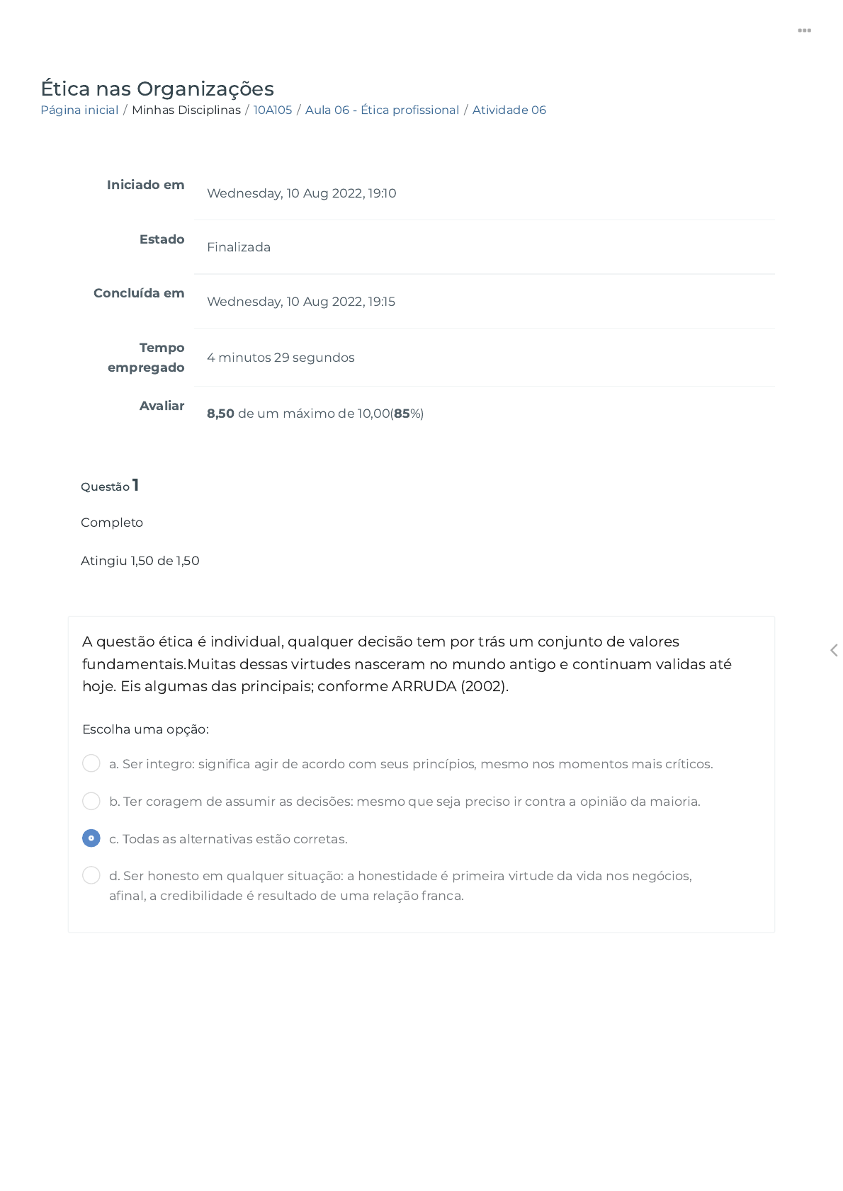 Página inicial / Minhas Disciplinas / 10A105 / Aula 06 - Ética pro�ssional / Atividade 06 Ética nas Organizações Iniciado em Wednesday, 10 Aug 2022, 19:10 Estado Finalizada Concluída em Wednesday, 10 Aug 2022, 19:15 Tempo empregado 4 minutos 29 segundos Avaliar 8,50 de um máximo de 10,00(85%) Questão 1 Completo Atingiu 1,50 de 1,50 A questão ética é individual, qualquer decisão tem por trás um conjunto de valores fundamentais.Muitas dessas virtudes nasceram no mundo antigo e continuam validas até hoje. Eis algumas das principais; conforme ARRUDA (2002). Escolha uma opção: a. Ser integro: signi�ca agir de acordo com seus princípios, mesmo nos momentos mais críticos. b. Ter coragem de assumir as decisões: mesmo que seja preciso ir contra a opinião da maioria. c. Todas as alternativas estão corretas. d. Ser honesto em qualquer situação: a honestidade é primeira virtude da vida nos negócios, a�nal, a credibilidade é resultado de uma relação franca. https://ava.politecnicabr.com.br/ https://ava.politecnicabr.com.br/course/view.php?id=832 https://ava.politecnicabr.com.br/course/view.php?id=832#section-7 https://ava.politecnicabr.com.br/mod/quiz/view.php?id=21204 https://ava.politecnicabr.com.br/ Questão 2 Completo Atingiu 1,00 de 1,00 Kisnerman (1983, p. 94) a�rma que a integridade pro�ssional pode ser identi�cada por um conjunto grande de atitudes, tais como: Escolha uma opção: Questão 3 Completo Atingiu 0,00 de 1,50 Associe as alternativas a seus respectivos criadores conforme as regras inseridas por pensamentos �losó�cos e religiosos. “Todos os seus deveres podem ser resumidos da seguinte forma: não faça aos outros o que o prejudicaria se lhe fosse feito”. “Busque para os outros a mesma felicidade que deseja para si. Não importa aos outros as suas dores”. “Se pode prejudicá-lo, não faça ao seu semelhante”. “Não deixe que seu irmão seja tratado de uma forma que ele não gostaria. Só é crédulo aquele que ama seu irmão como a si mesmo”. a. ética pessoal e pro�ssional. b. comunicação, participação e trabalho em equipe. c. liberdade de ser. d. todas as alternativas estão corretas. Judaísm Judaísm Islamism Judaísm https://ava.politecnicabr.com.br/ Questão 4 Completo Atingiu 1,00 de 1,00 Marque (V) Verdadeiro ou (F) Falso. ( ) É um principio básico do trabalho ético em uma organização: assumir a responsabilidade dos atos praticados e suas inevitáveis consequências. Ser responsável é ter a perfeita noção do comprometimento com a pro�ssão e com suas respectivas atividades. É saber até onde vai a própria capacidade e potencial. Assumir tarefas que não podem ser cumpridas com perfeição é muito arriscado, e correr alguns tipos de risco, muitas vezes, pode ser uma atitude antiética. Escolha uma opção: Verdadeiro Falso https://ava.politecnicabr.com.br/ Questão 5 Completo Atingiu 2,00 de 2,00 Marque (V) Verdadeiro ou (F) Falso. ( ) Art. 1.º O Código de Ética Pro�ssional enuncia os fundamentos éticos e as condutas necessárias à boa e honesta prática das pro�ssões da engenharia, da arquitetura, da agronomia, da geologia, da geogra�a e da meteorologia e relaciona direitos e deveres correlatos de seus pro�ssionais. ( ) Associada a todos os princípios éticos, a responsabilidade cível do pro�ssional é de suma importância. Nas últimas décadas, muitos são os casos de pessoas que acionam judicialmente pro�ssionais que, devido ao mau desempenho de suas funções, prejudicam outras pessoas. ( ) Morris (1998, p. 141) comenta que o quadro geral da ética dos dias de hoje representa um desa�o assustador. No entanto, o indivíduo não deve temê-lo, mas de�nir sua conduta por meio de uma re�exão pessoal. Escolha uma opção: a. F, V, V. b. V, F, F. c. V, F, V. d. V, V, V. e. F, F, F. https://ava.politecnicabr.com.br/ Questão 6 Completo Atingiu 1,00 de 1,00 Numa de�nição ampla, Melo Neto e Brennand (2004), a�rmam que a responsabilidade social. marque (V) Verdadeiro ou (F) Falso. ( ) É uma atividade favorável ao desenvolvimento sustentável, à qualidade de vida no trabalho e na sociedade, ao respeito às minorias e aos mais necessitados, à igualdade de oportunidades, à justiça comum ao fomento da cidadania e respeito aos princípios e valores. Escolha uma opção: Verdadeiro Falso https://ava.politecnicabr.com.br/ Questão 7 Completo Atingiu 2,00 de 2,00 Marque (V) Verdadeiro ou (F) Falso. ( ) Em relação a todas as pro�ssões, o artigo 154 do Código Penal Brasileiro prevê penalidade para quem: “revelar a alguém, sem justa causa, segredo, de que tem ciência em razão de função, ministério, ofício ou pro�ssão, e cuja revelação possa produzir dano a outrem; pena – detenção de 3 (três) meses a 1 (um) ano, ou multa”. ( ) O pro�ssional que comete uma falta por imprudência, é porque �cou passivo diante da situação, quando deveria ter agido. A imprudência é evidenciada pela falta de atenção da pessoa que desempenha determinada tarefa. ( ) ocorre imperícia quando há ignorância sobre a parte essencial de um conhecimento especí�co para o exercício da pro�ssão. A imperícia fere um dos elementos principais da conduta pro�ssional: a competência, para a qual o indivíduo deve estar apto a realizar o seu trabalho. Escolha uma opção: a. F, V, F. b. V, V, V. c. F, V, V. d. V, F, V. e. V, V, F. Entre em Contato https://www.politecnicabr.com.br 0800 084 2627 0800 084 2627 Links Úteis Dicas da nossa Diretora Acadêmica Planner de Estudos Declaração de Matrícula Orientações do AVA Abertura de Ticket Fale com o Tutor Cronograma de Estudos Manual de Estágio Manual de Competência https://www.politecnicabr.com.br/ https://soundcloud.com/user-501638417/sets/escola-politecnica-brasileira https://storage.googleapis.com/sirius-pubstore/semestre_plannerdeestudo%20poli.pdf https://storage.googleapis.com/sirius-pubstore/declaracao_mat